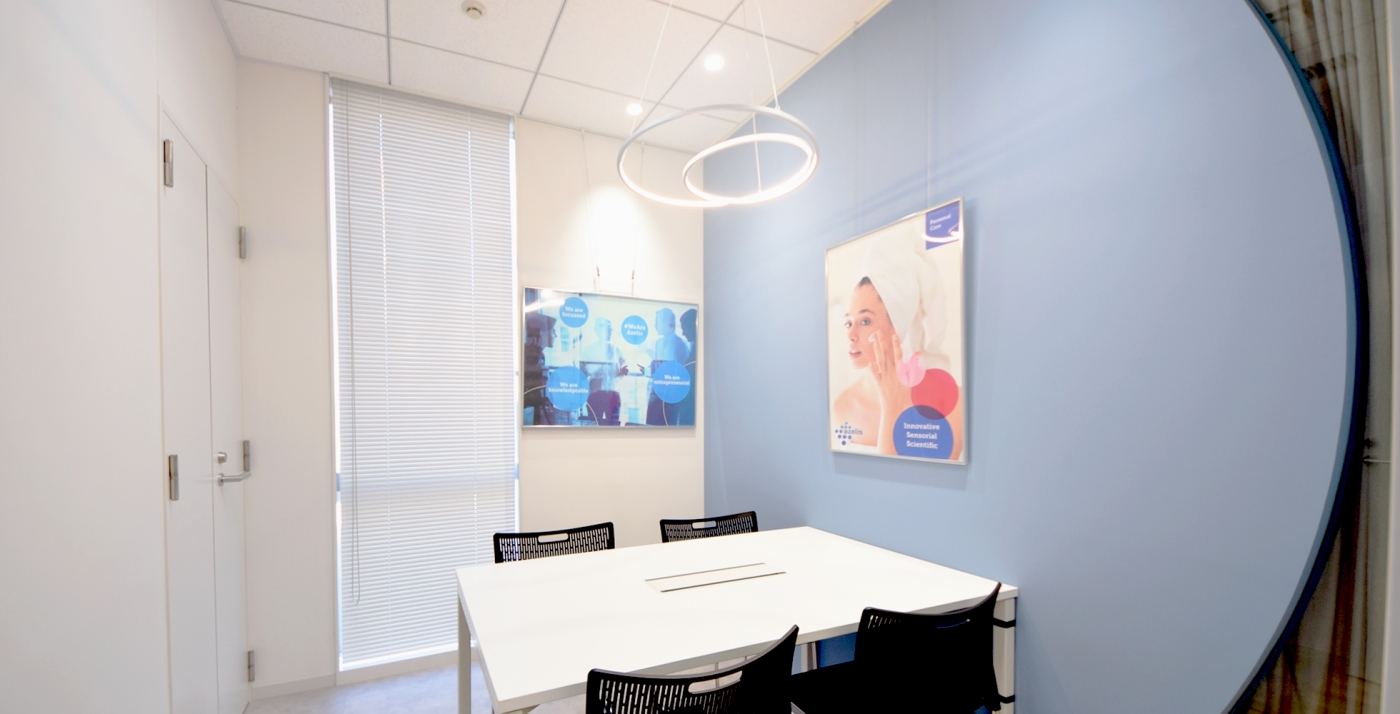 グローバルに事業を展開するスペシャリティケミカル商社であるアゼリス様の事業を、空間全体で表現したオフィスができあがりました。シンプルであたたかみがあり、コーポレートブランドのグラフィックを用いたインパクトのある空間です。全体的には、ホワイト、ブルー、ナチュラルな木目で、クリーンさを表現。随所に用いたサークル(円)のモチーフは、アゼリス様のロゴからインスパイアされています。壁面にはグラフィックを大胆に施し、世界的な企業であることや、扱うケミカル商品の多様性をひと目でわかっていただけるようになっています。エントランスからは併設したラボスペースも見ることができ、入った瞬間にアゼリス様の全てが伝わる、そんなオフィスです。