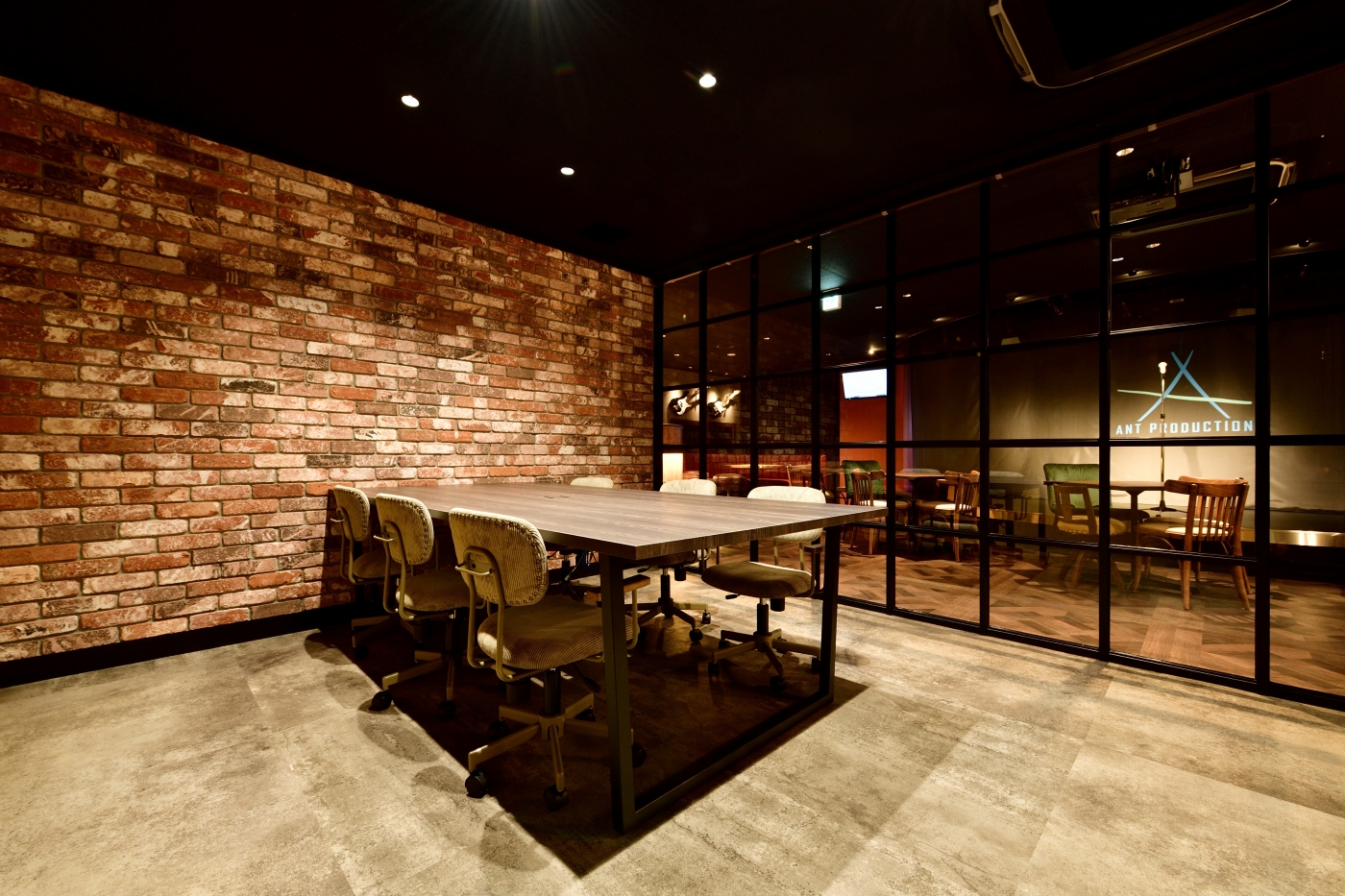 エントランスからステージと会社ロゴが印字された横断幕がお出迎え。黒を基調としながらデザイン家具を多数配置し、ライブハウスのような空間を演出しました。来客用の会議室以外には扉を設けず、壁の配置で目線を切りました。そうすることで空間に広がりをつくり好奇心を引き立てることができ、オンとオフのメリハリをしっかりつけることができるようになりました。 また、ステージ上のスポットライトやバーカウンターの間接照明、ペンダントライト、ダウンライトなど様々な照明を活用しています。照明は切り分けや調光ができるためステージでプロジェクターを使用する際など、シーンに合わせて使い分けることができるようになっています。