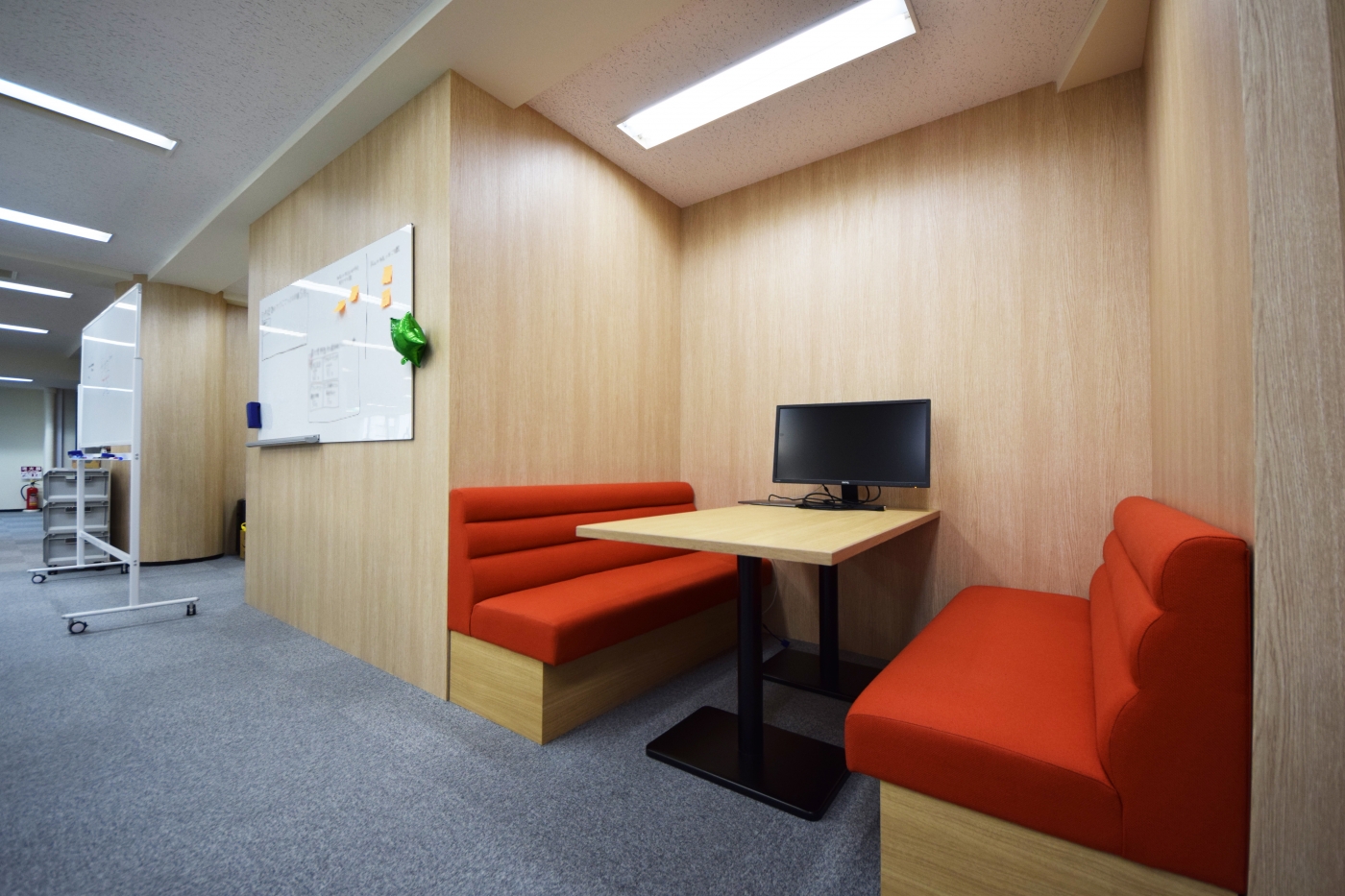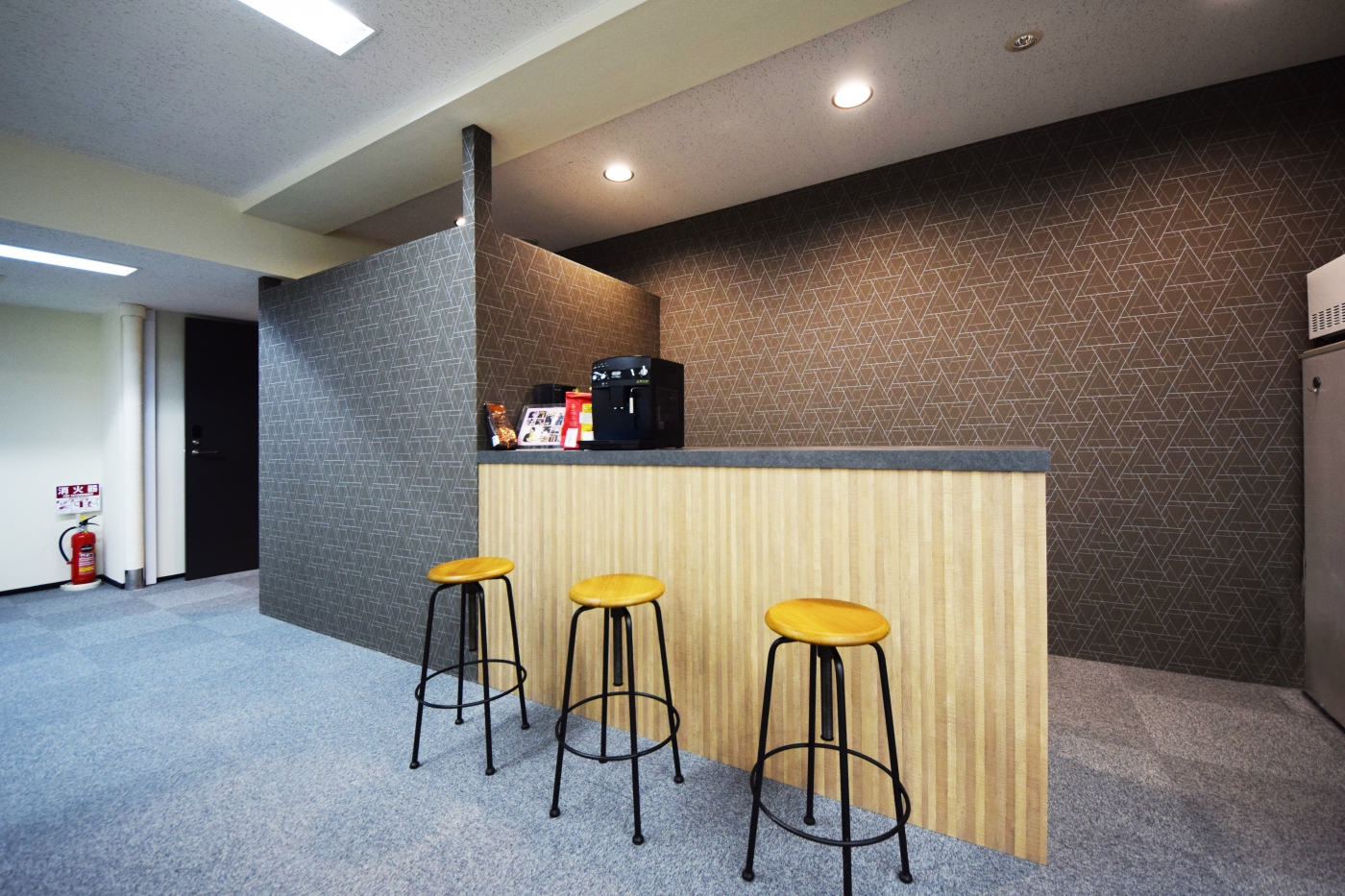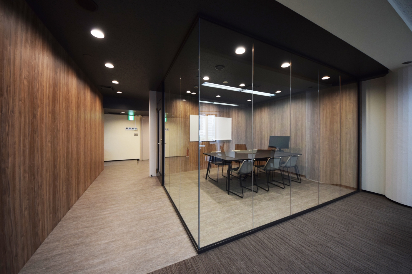 エントランスに存在感のあるサインと間接照明を走らせることで、スタイリッシュな存在感を演出しております。空間を広く見せるため壁面にはミラーを設置し、奥行きのある空間構成となりました。会議室はガラス壁面にすることで広さを感じられる、開放的な空間になっております。オフィス中央のスペースにはドライパントリーを設置することで、自然と社員の皆様が集まり、交流できるようレイアウト致しました。造作ソファでは貼地をコーポレートカラーに合わせることで、企業ブランディングを図っています。