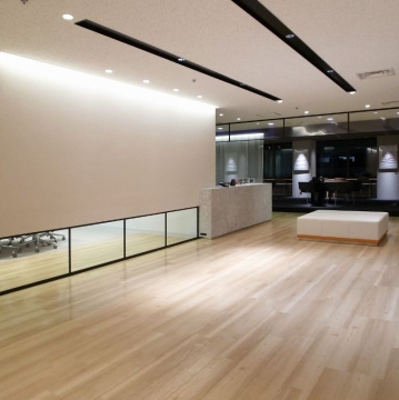 「エントランスにカフェを作り、活気のある空間にしたい」という言葉をいただき、今回のプロジェクトが発足しました。現在のシックで洗礼された印象を大切にしながらも、グリーンや木目を取り入れることでカフェのカジュアルさを表現し、気軽に立ち寄れる雰囲気を演出をしております。ポイントにペンダントライトを設置することにより、人の動きを促しています。カフェだけではなく、ゴミ箱収納やサインも細部までこだわり、唯一無二の『D2 Coffee』が完成しました。