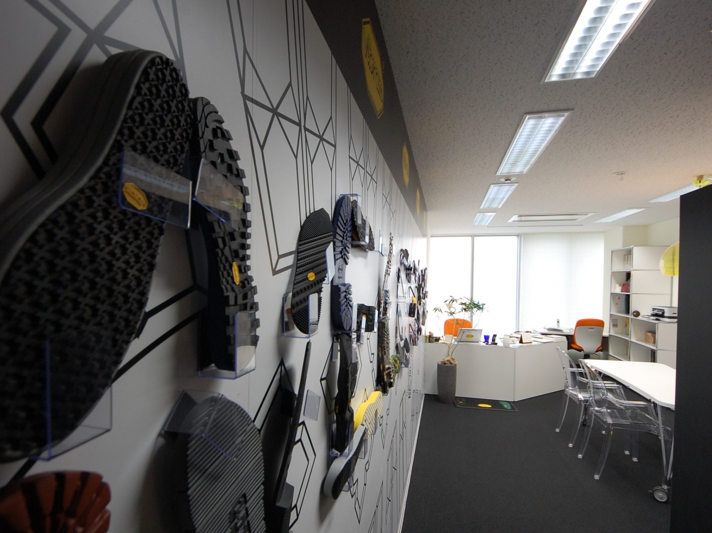 ヴィブラムジャパン様の日本支社開設のお手伝いをさせてただきました。代表作であるアウトソールを全面にデザインした展示ボードをメインに、コーポレートカラーである黒・黄色でシンプルにまとめました。毎年入れ替えられる商品を自由に展示することができ、お打合せに来られたお客様にも、製品をスムーズに手に取ってもらえるように、展示フックから作成。限られた空間の中でも、最大限にヴィブラム様の歴史と製品アピールができる、日本支社オリジナルの空間になりました。