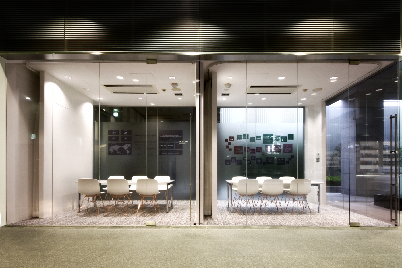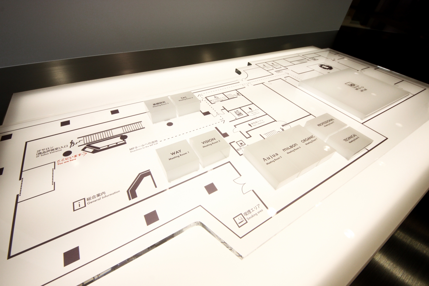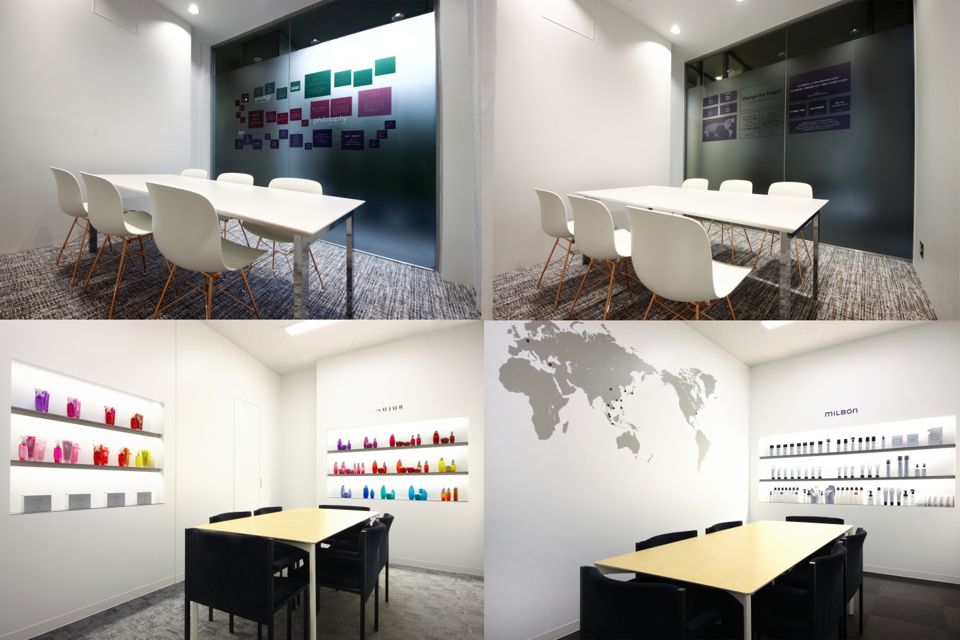 「お客様、協力会社様、社員様へ向けたオフィス創りがしたい」という担当者様の思いを表現した今回のエントランスのコンセプトは「ラボシアター」。エントランスでは入ってすぐに館内マップがお出迎え。沢山のご来客があるミルボン様だからこそ、用途に合わせてお客様を誘導する工夫を設けています。また9つある会議室をシアターに見立て一つ一つに意味や役割を持たせました。訪れる皆様に会社としての考え方や商品の考え方をより深く知ってもらい、触れることができる”ミセル”研究所を創り上げることが出来ました。