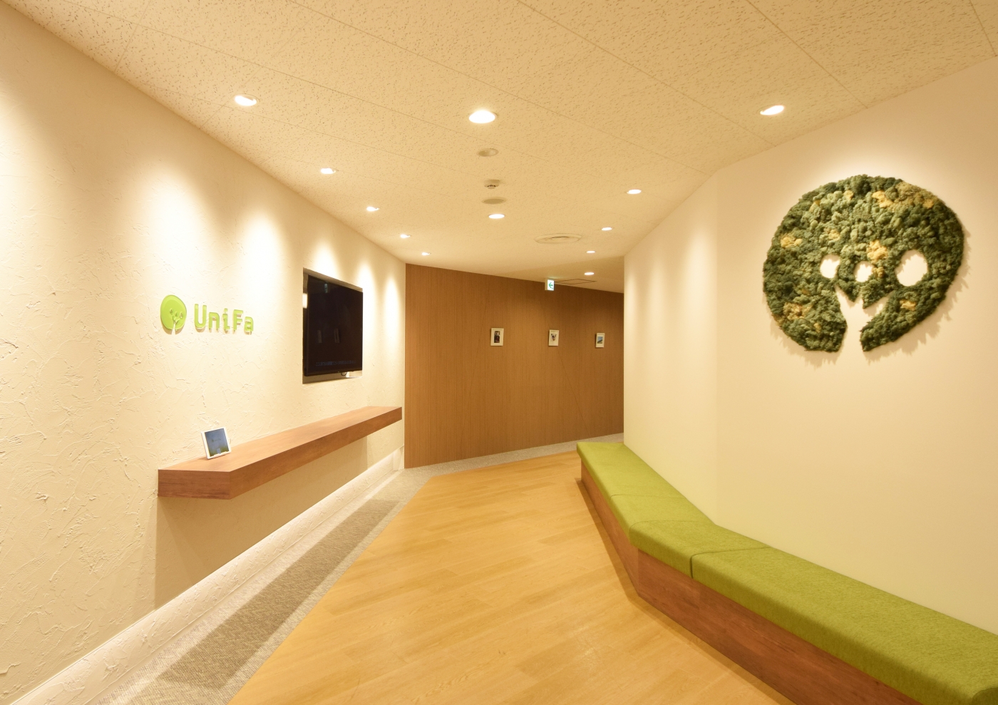 もともと2拠点に分かれていた東京オフィスを1拠点に集約する統合移転。統合に伴い、社員の皆様にとって愛着が持てる、帰ってきたくなるオフィスにしたいという想いをデザインに反映しました。エントランスは、ユニファ様らしい柔らかい雰囲気とアットホームさが伝わる空間。ロゴをモチーフにしたグリーンのオブジェや、コーポレートカラーを使用したロングベンチからブランディングを感じられます。11室ある会議室はそれぞれにユニファ様の中で担当者を立て、コンセプトとデザインを一緒に考えながら作り上げたことで、皆様の想いが詰まったオフィスになりました。