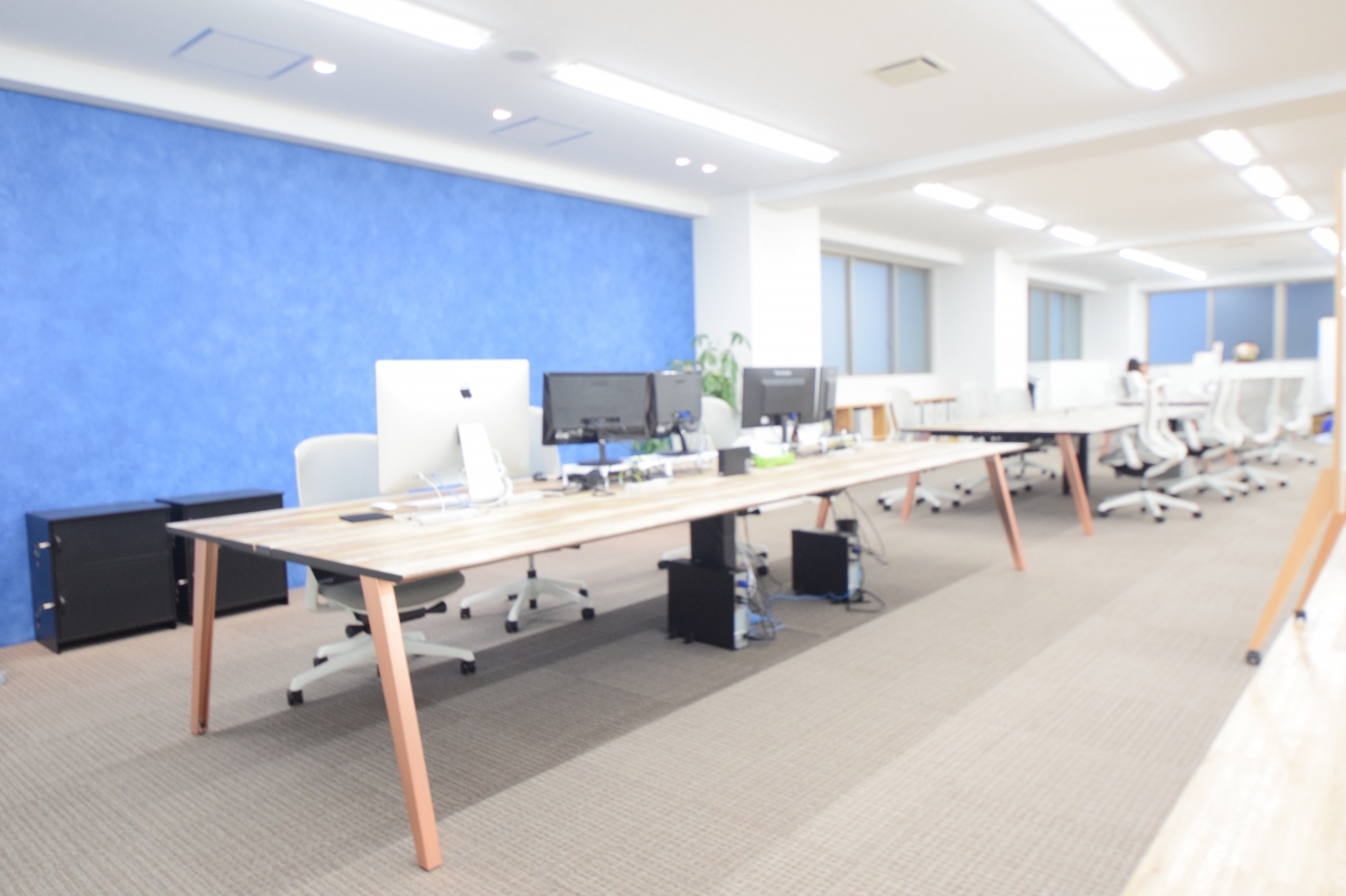 ”Be a Proffesional”を理念として掲げ、一人一人が自立して働くという考え方をオフィスデザインにも反映させました。エレベータを降りて左右横に広がる物件のため、エントランス目の前は全面ガラスで間仕切られた会議室にし、カーテンでON/OFF切り替える二面性のあるデザインにしました。部屋の中心をワークスペースとし、個々が独立して働くスタイルに合わせて、波紋を描くように様々なエリアを囲うようなレイアウトになっています。動線は部屋の真ん中にし、最低限の間仕切り壁のみで採光を生かしたオープンな空間となりました。また、マグネットスペースとなるハイカウンターは、空間全体を引き締めるため暗めの色のタイルを使用しており、明るさだけでなく落ち着きも感じられます。