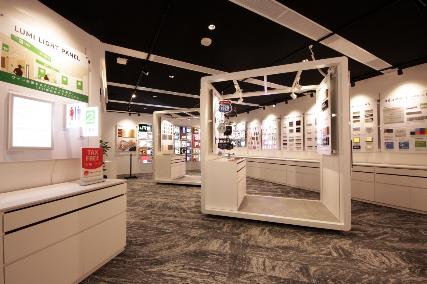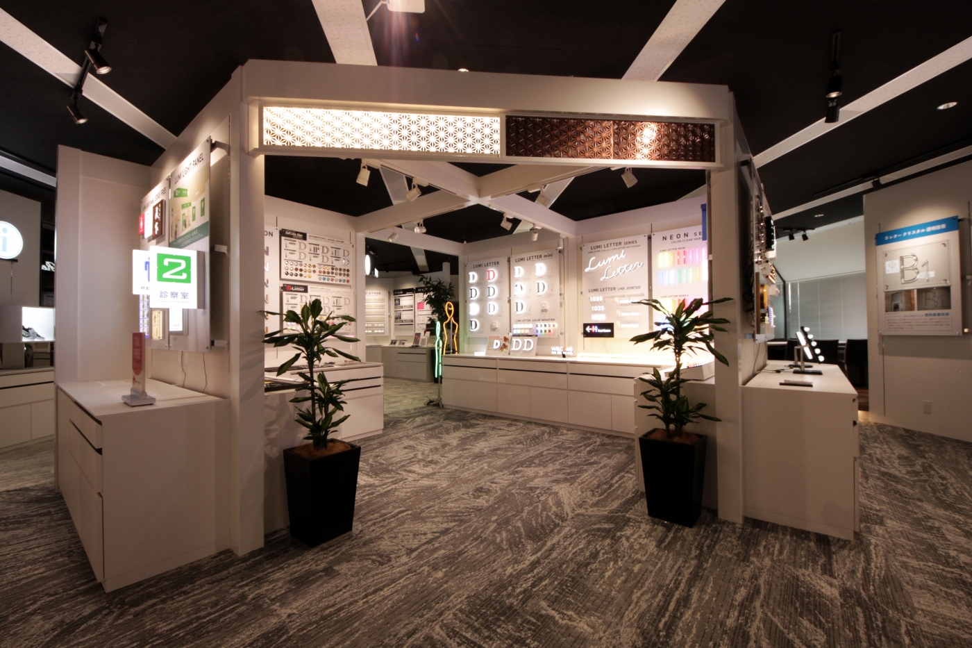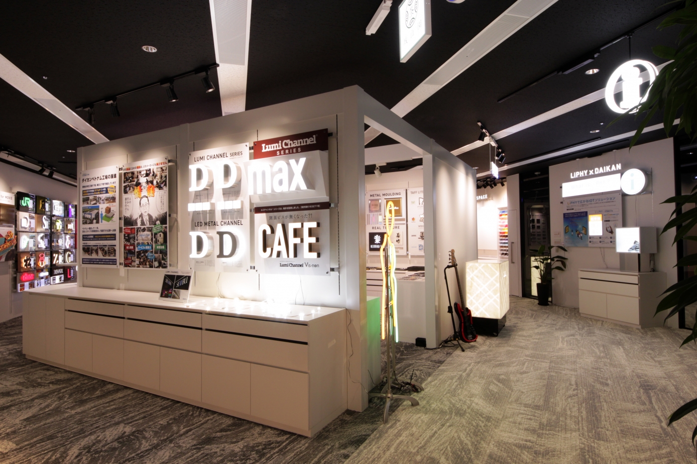 本社ショールーム機能を大阪市内へ移転させるのに伴い、ダイカンが作るサインの品質の高さや表現の多様性などを体感できる空間をデザインしました。エントランスではエンターテインメント性を取り入れ、新しい表現方法を用いたサインを3種配置し、モニターやプロジェクションマッピングなど動きのある空間がお客様をお迎えします。ショールーム内は、サインの特性や用途に応じたディスプレイ計画を行いました。サインの施工方法、照明の色温度による見え方の変化なども体感できる仕様になっております。またエンドユーザー様との打合せだけでなくセミナーや勉強会でも活用できるよう、可動式の造作やぐらを設置し、機能性とデザイン性を両立。必要に応じてお客様にてブラッシュアップできる、柔軟性も備えたショールームができあがりました。