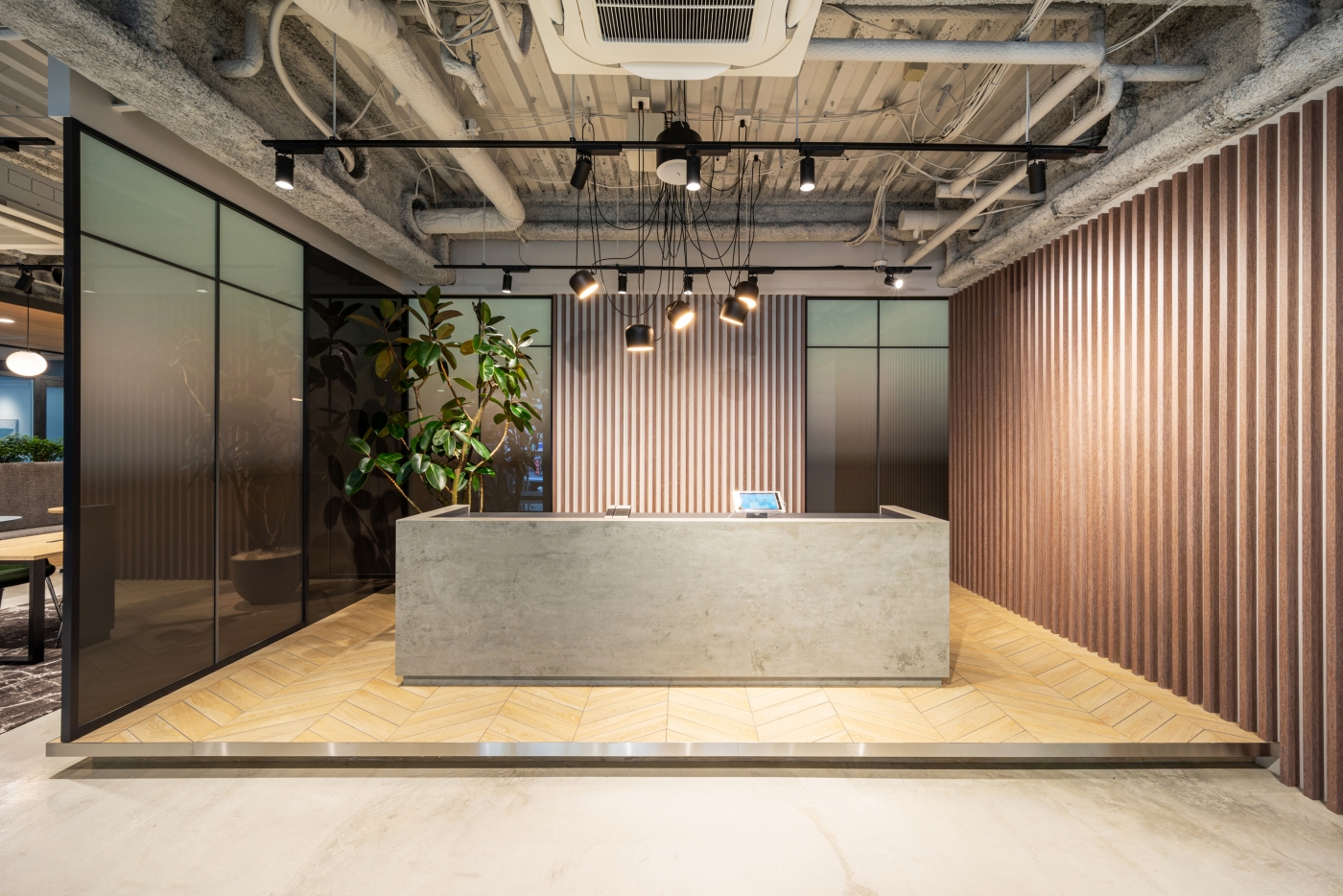 オフィススペースにエントランスを加えた3フロアの空間デザインを行いました。1Fはすでに床や壁が大理石で作りこまれている中での大改修を行い、重厚感あるエントランスカウンターに色のついたガラスやルーバーで動きを出して、大人なカジュアル空間を演出しました。エントランスから広がるフリーエリアもゆとりのある空間構成をとり、ブラケットランプや絵画をアクセントにすることで上品に仕上げています。2Fは社員の方のフリーエリア及び社外MTGエリアとして、1Fよりもややカジュアルな雰囲気にすることで居心地の良さを大切にしました。3Fは色調を統一した家具にガラスで仕切られたマグネットエリアを設けることで、コミュニケーションが広がる仕組みを作っています。各階に植物をちりばめ、天井をスケルトンにすることで、フロア全体に開放感を出しています。