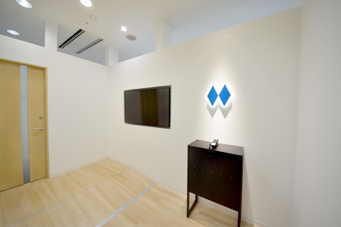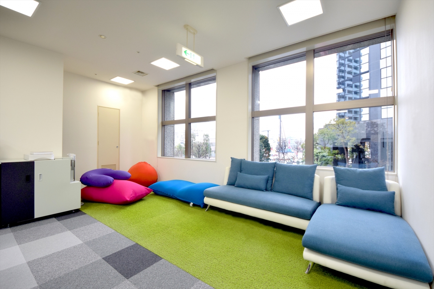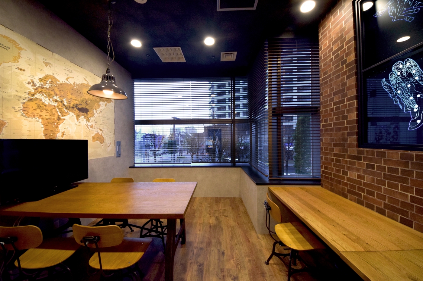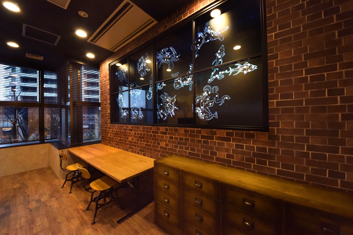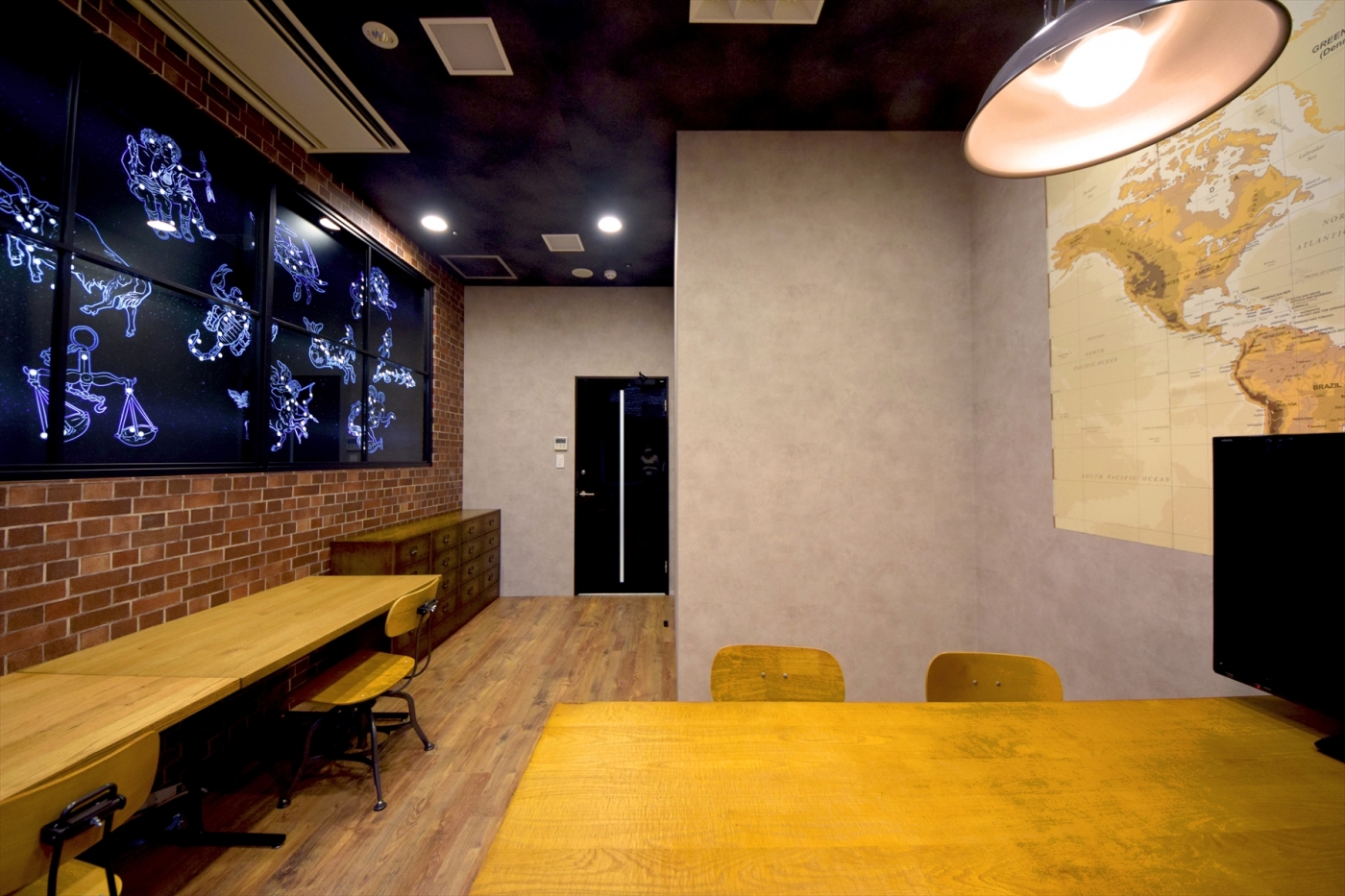 事業拡大を進められる中で、初めてのオフィス移転。社員皆様のことを第一に考えたデザインをオフィスに反映しました。銀行代理業室はアトリエ風のデザイン豊かなスペースとなっており、HISグループの創業時の想いが詰まっています。一番のこだわりは、壁面の大きな造作窓。12個の星座をモチーフにしたグラフィックはオリジナルデザインで、星空の光のムラをグラフィックパネルの裏から間接照明をあてることで表現した、こだわり満載の空間です。オフィス全体で土足禁止の運用をされるということで、より快適に過ごせるようリフレッシュスペースの床には人工芝を敷き、カラフルなYogiboも置いて、皆様が楽しく働ける、温かみのあるオフィス空間にしました。