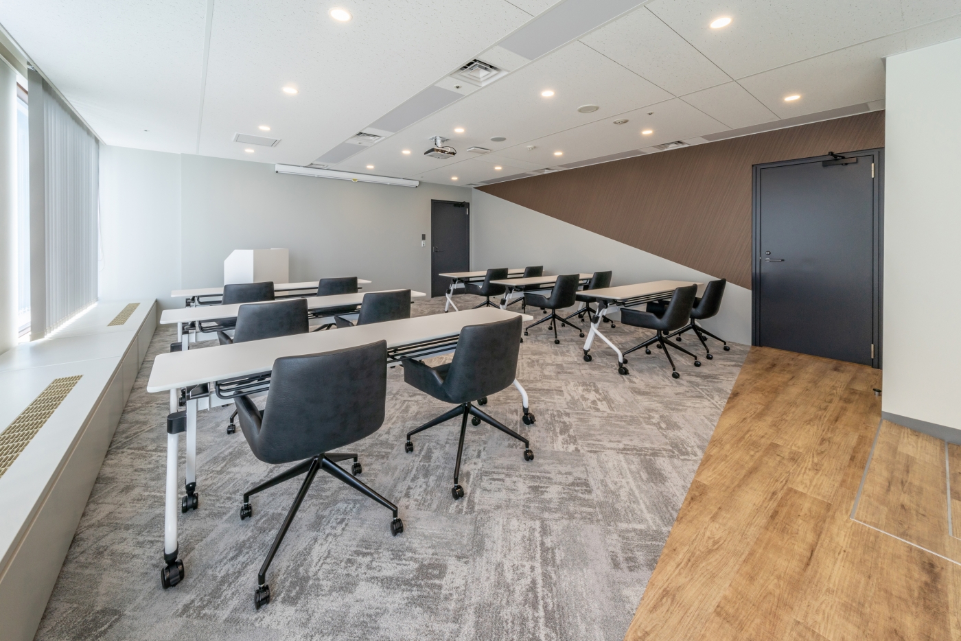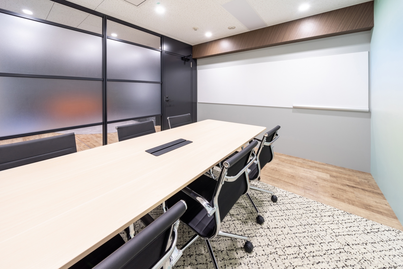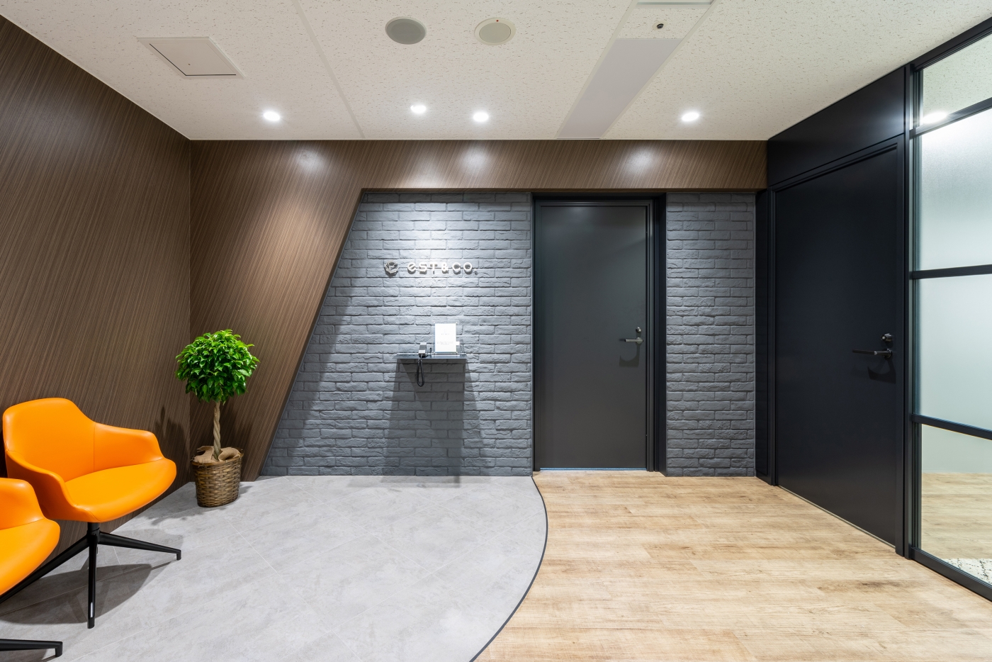 元気で勢いのあるエストアンドカンパニー様。今までは社外で行っていたセミナーも自社内で行い、これまで以上にお客様を迎えるオフィスとなるため、安心感を感じられる魅力的なオフィスを目指しました。エントランスは、ブリックタイルの壁面等、素材感を大切にして落ち着いた空間を演出。エントランスに面する6名用の会議室はガラス壁とすることで、区切られながらも閉塞感を感じないデザインとなっております。一方セミナールームは、眺望と窓面を活かし、明るく開放感のある空間としました。また、エントランスと6名用会議室の床や壁を同じ木目柄で繋げたり、エントランスとセミナールーム共に斜めのラインを壁に入れたりすることで、各部屋が勢いの良いつながりを持ち、『人と人がつながる場』を表現しています。