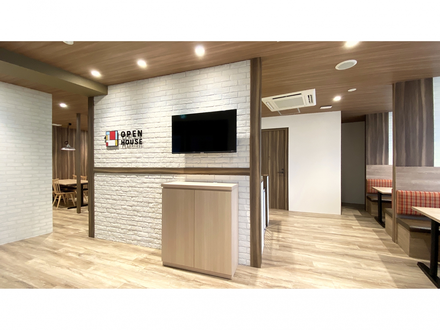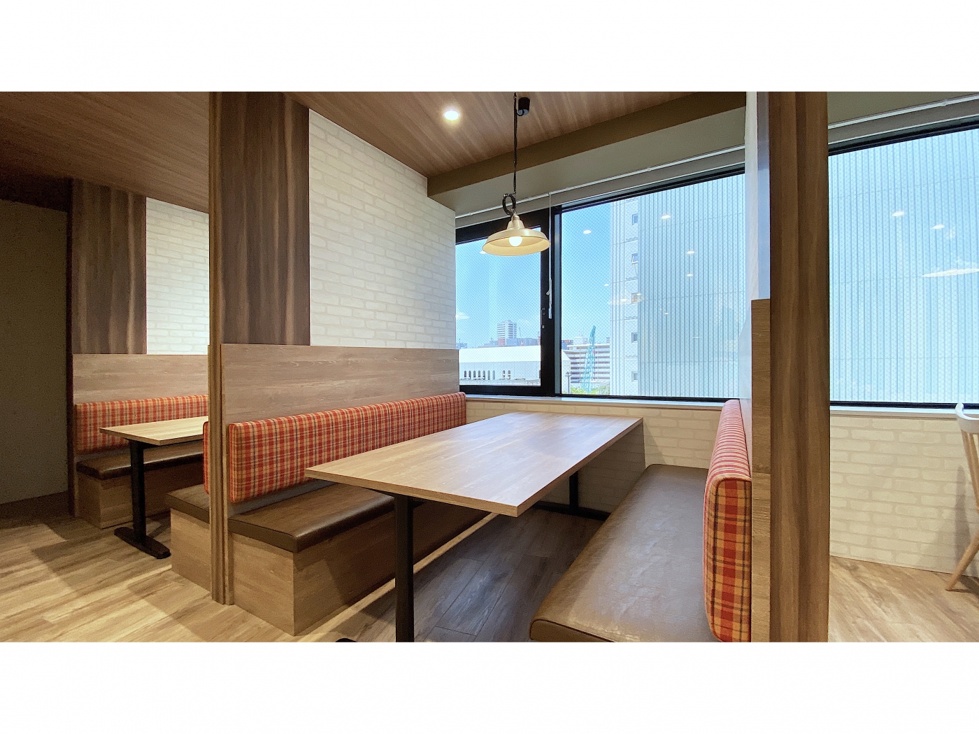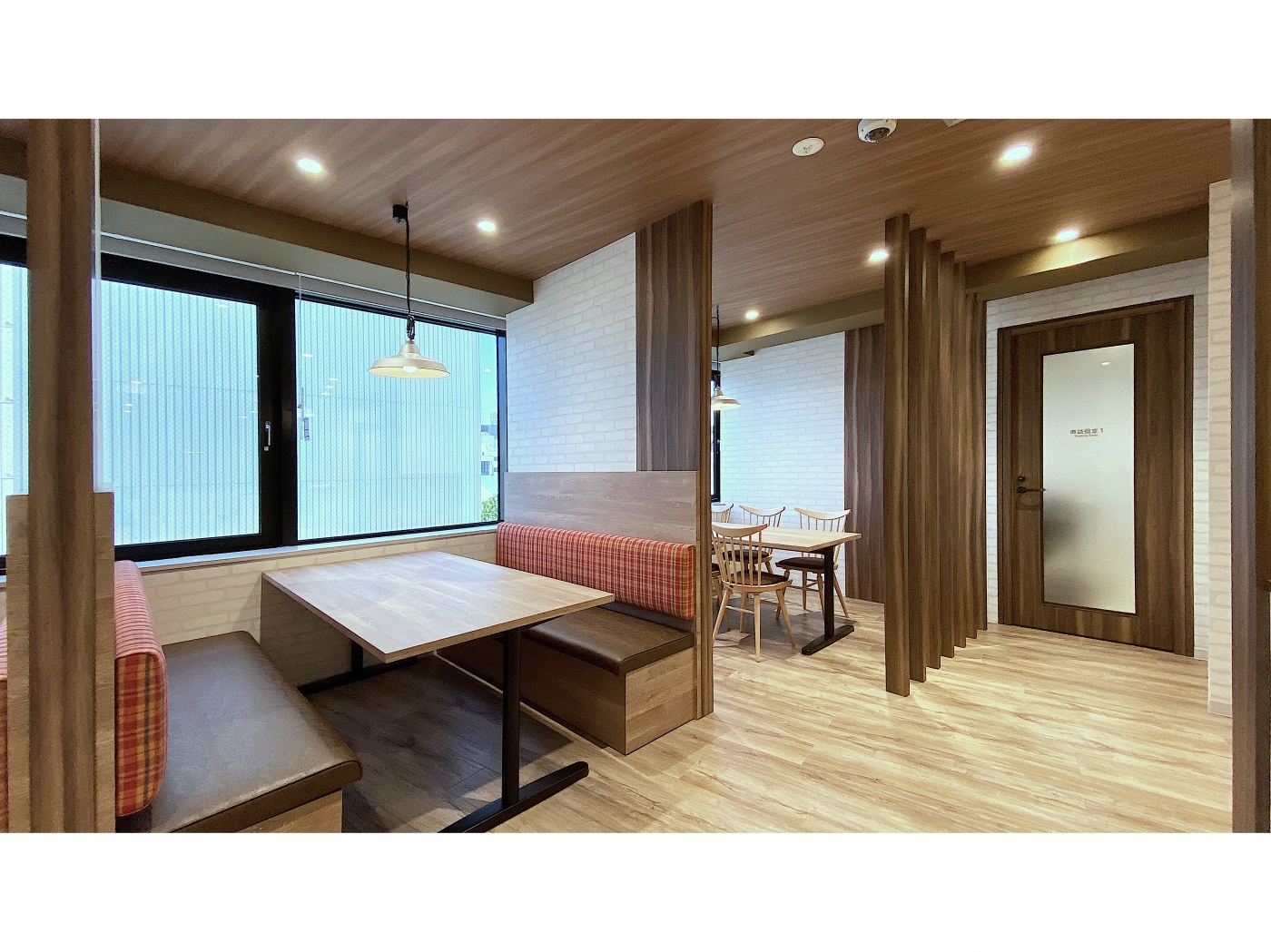 福岡・天神エリアに、ビンテージ感のある木目柄の素材と白いレンガ調の壁で”at home”が感じられるオフィスが完成しました。来客空間にはルーバーで仕切ったテーブル・チェアスペースとソファベンチブース、そしてドアと壁でしっかりと閉じた商談個室があります。商談スペースには、居心地の良いソファベンチブースに赤や緑のチェック柄と座面のレザーを採用して空間に色付けを加えました。自然と商談の会話も弾む空間になりました。