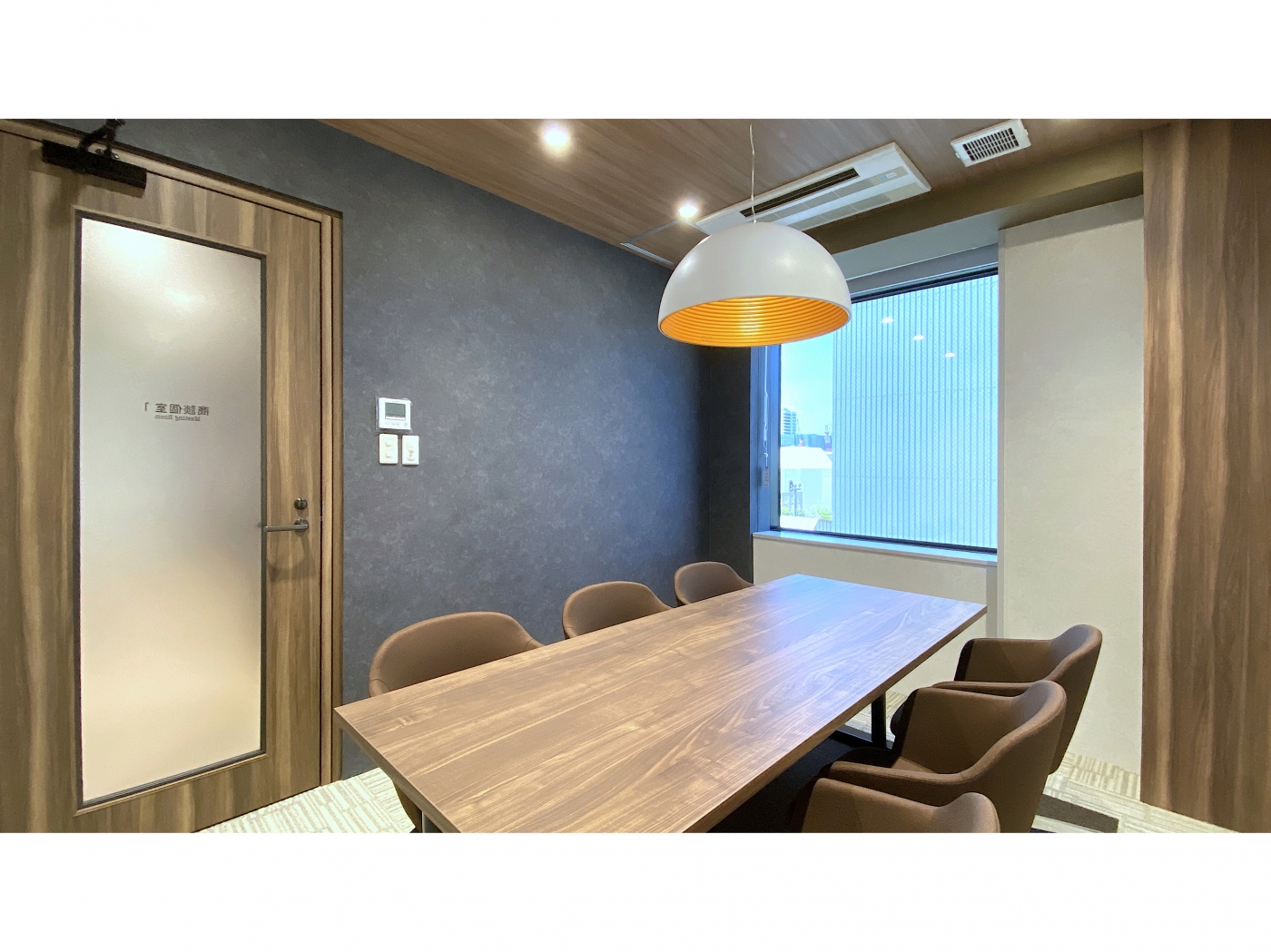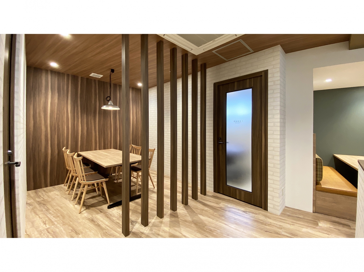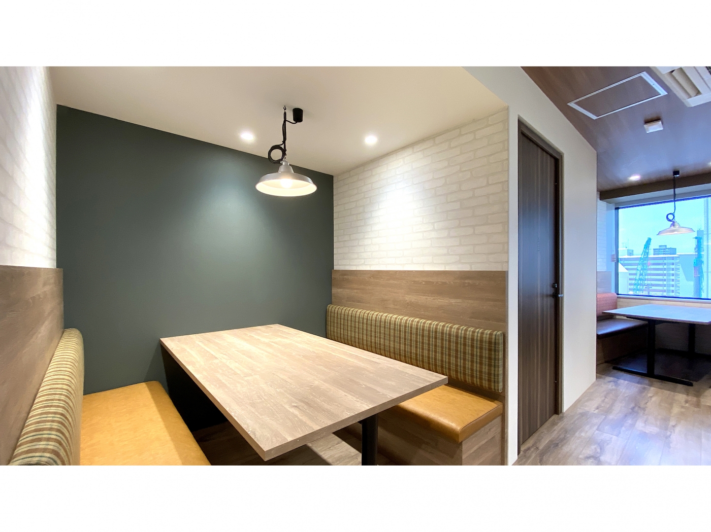 福岡・天神エリアに、ビンテージ感のある木目柄の素材と白いレンガ調の壁で”at home”が感じられるオフィスが完成しました。来客空間にはルーバーで仕切ったテーブル・チェアスペースとソファベンチブース、そしてドアと壁でしっかりと閉じた商談個室があります。商談スペースには、居心地の良いソファベンチブースに赤や緑のチェック柄と座面のレザーを採用して空間に色付けを加えました。自然と商談の会話も弾む空間になりました。