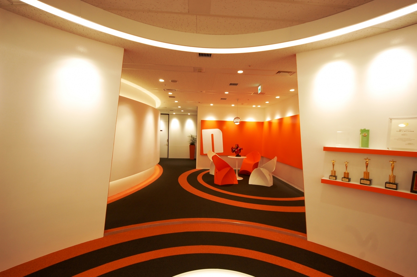 SFの世界感を表現したエントランスは、宇宙船をイメージ。ワープマシーンを想像させる受付電話台と、さりげないロゴのオブジェがお客様をお出迎えします。廊下はまるで宇宙船のように湾曲した壁がお客様を奥へと誘い、コーポレートカラーであるオレンジの壁に、インパクトのある白い大きなロゴサインが際立っています。異世界に迷い込んだようなワクワク感がデザインされたオフィスは、一度訪れると必ず印象に残る特別な空間になりました。