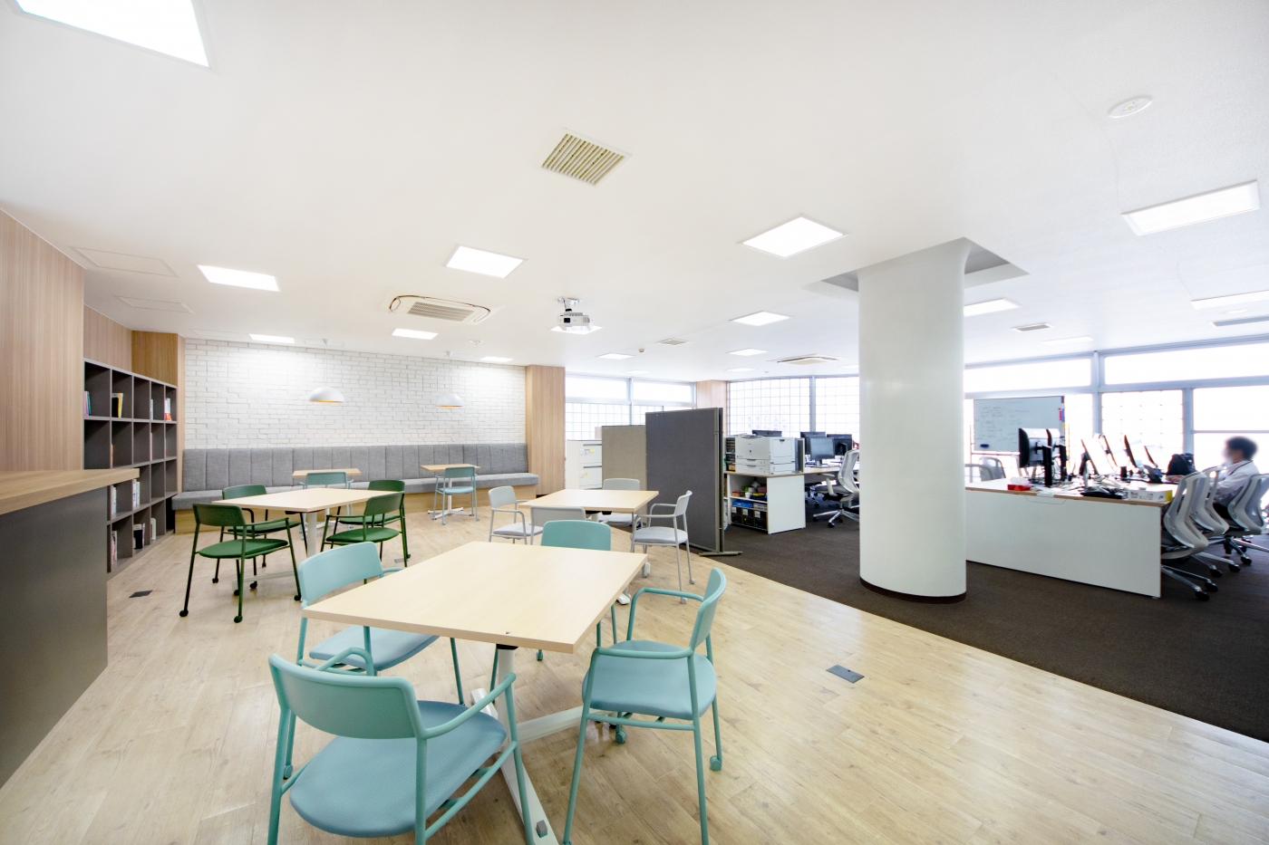 複数テナントを一つにまとめるという改装プロジェクト。オフィス作りを通して社員の皆様の「感性」「価値観」「行動」を捉え、各々が持つ能力や可能性を効果的に引き出し、パフォーマンス向上につなげられる環境作りを目指しました。エントランスデザインにはホームページでも取り入れているジオメトリックなデザインを取り入れて「感性」を刺激し、フリースペースでは可変性のある家具を設けることで社員同士のコミュニーケーションを促し、「価値観」を尊重・「行動」を促進できる空間を作りました。