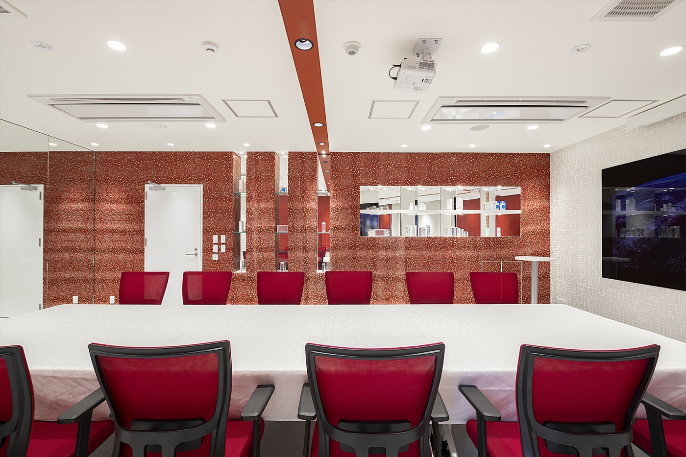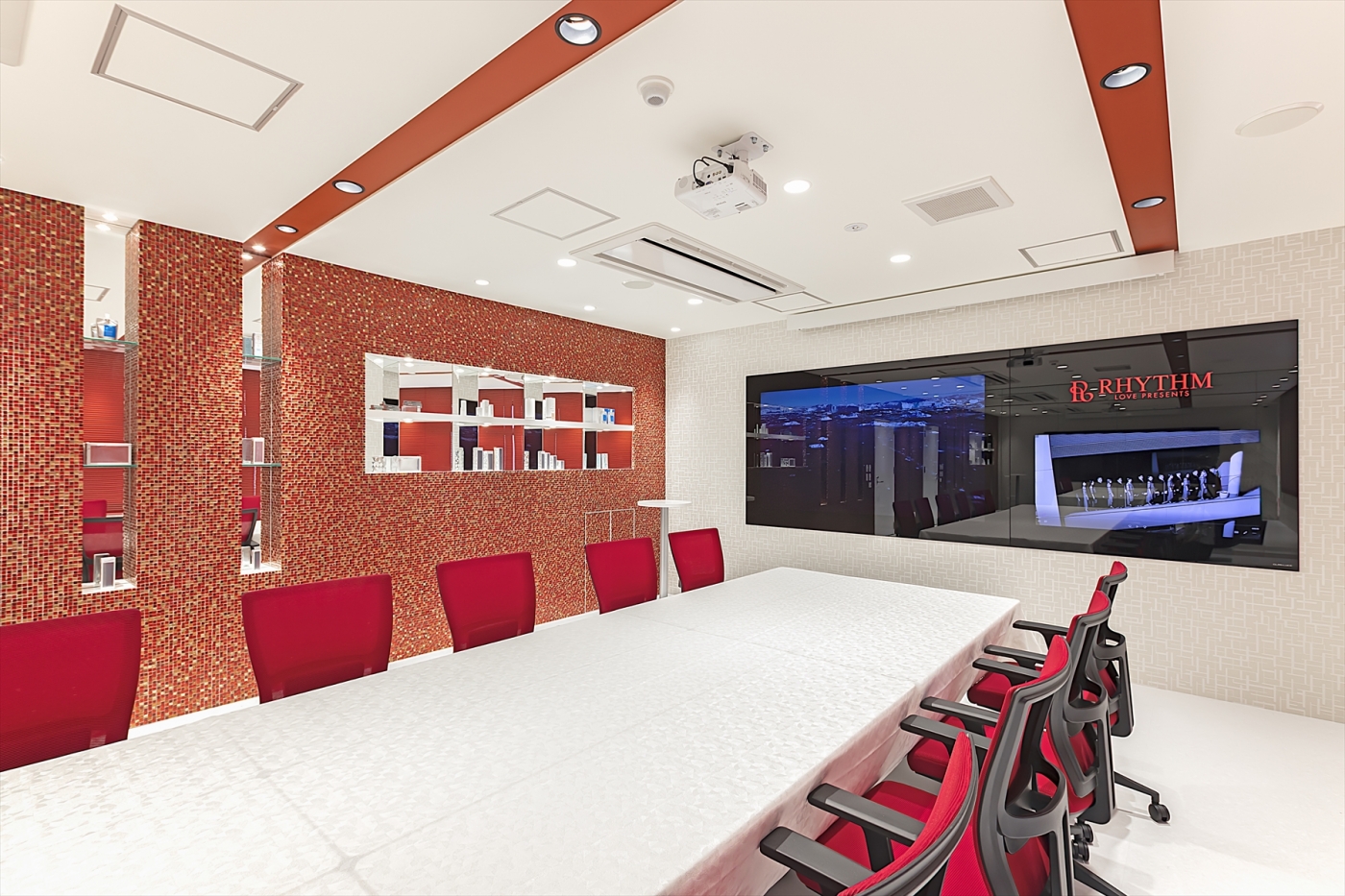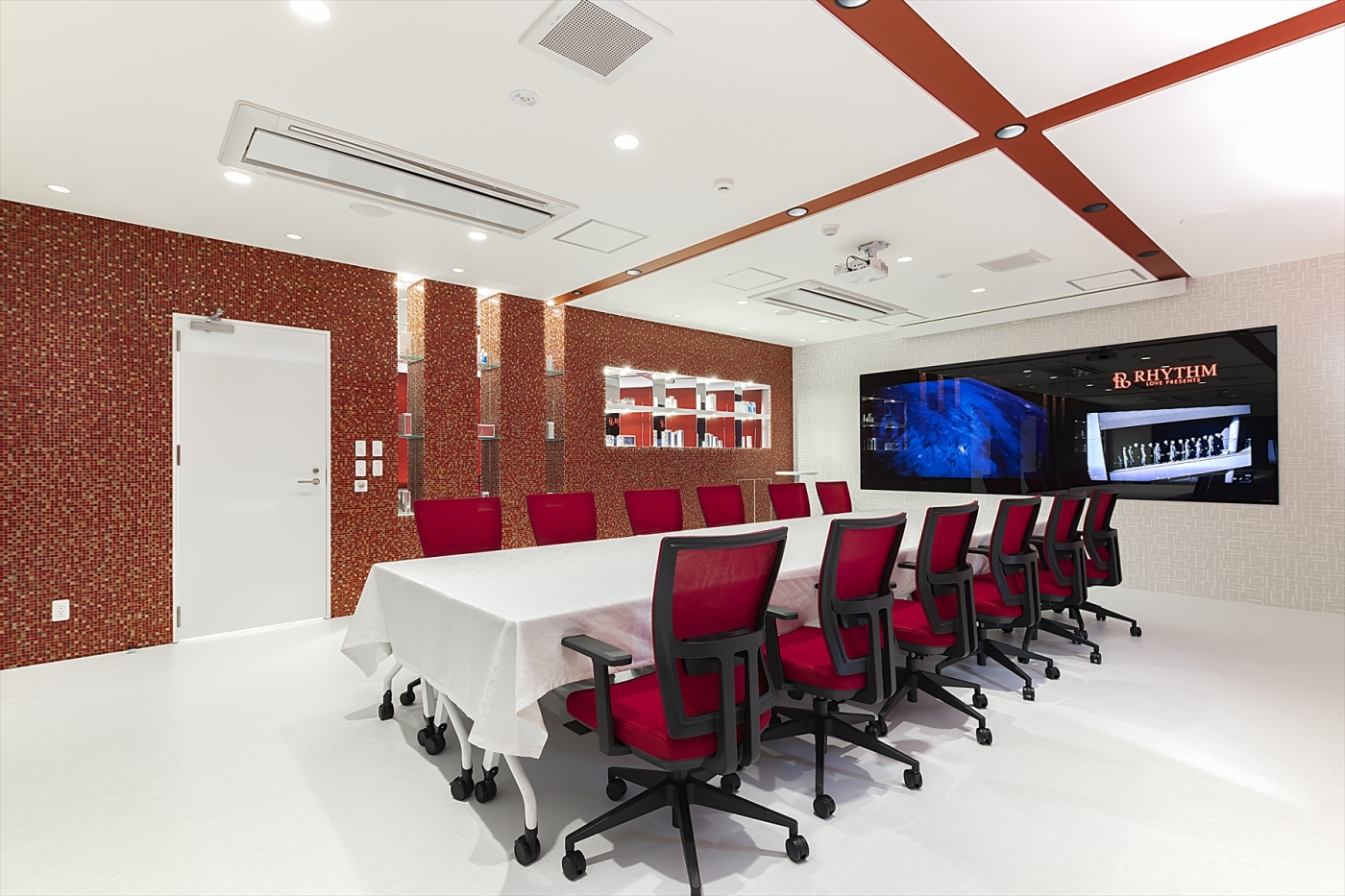 コーポレートカラーの赤を基調に「エレガント」で「ゴージャス」というキーワードを頂き、デザインしました。エレベーターをおりた瞬間、リズム様の商品を連想させるようなキラキラな異空間が来訪される方を驚かせます。セミナー室ではガラスから浮かび上がる大画面のモニターや壁面一面に張り巡らされた赤色のタイルが空間を演出しています。まさに「ドラマティック&アメージング」をコンセプトに美容商材をつくられているリズム様にぴったりの空間となりました。