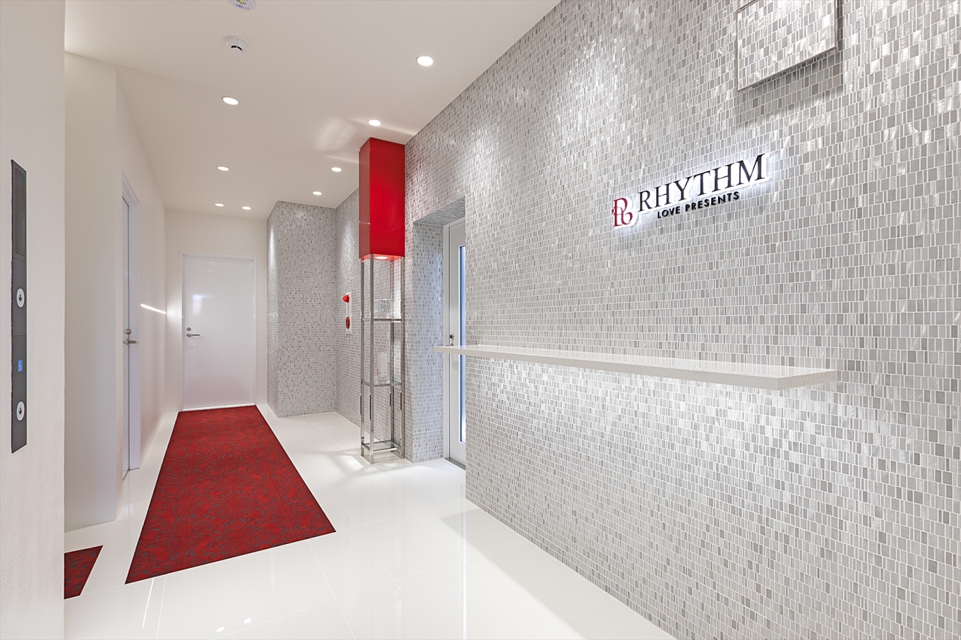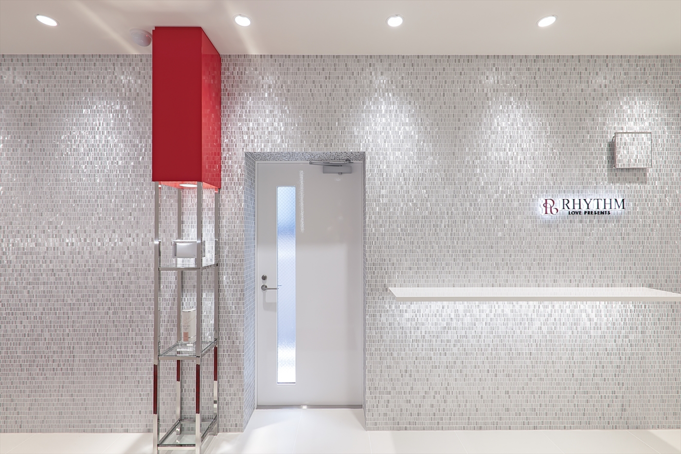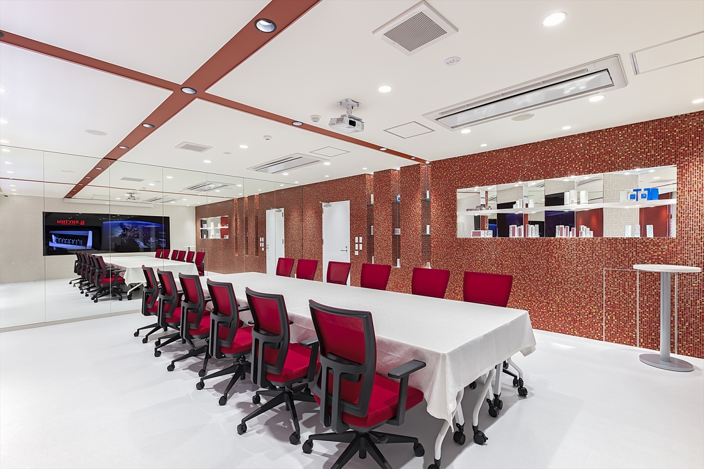 コーポレートカラーの赤を基調に「エレガント」で「ゴージャス」というキーワードを頂き、デザインしました。エレベーターをおりた瞬間、リズム様の商品を連想させるようなキラキラな異空間が来訪される方を驚かせます。セミナー室ではガラスから浮かび上がる大画面のモニターや壁面一面に張り巡らされた赤色のタイルが空間を演出しています。まさに「ドラマティック&アメージング」をコンセプトに美容商材をつくられているリズム様にぴったりの空間となりました。