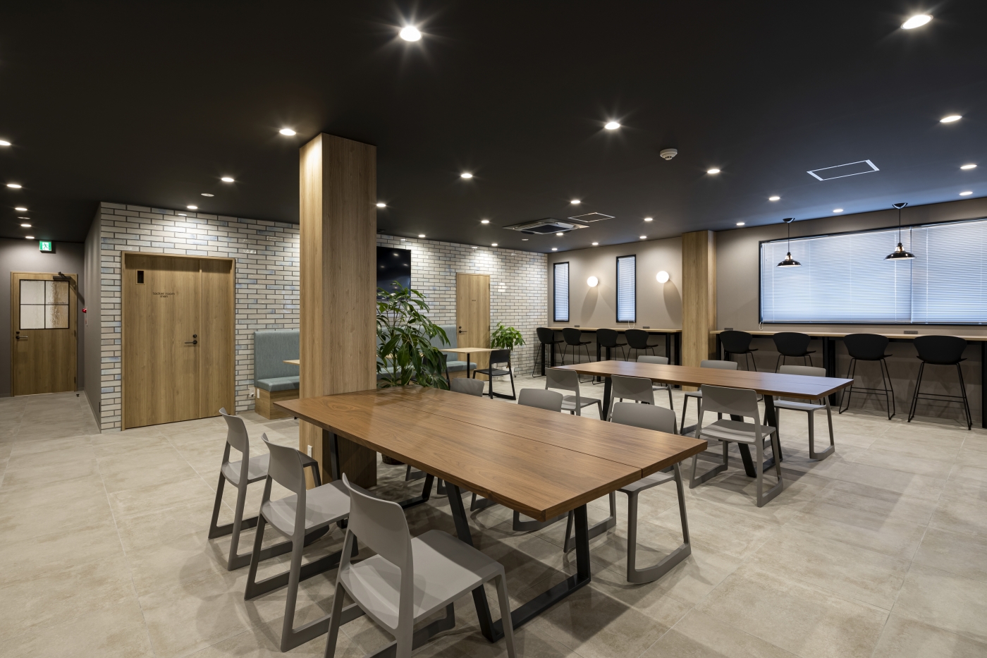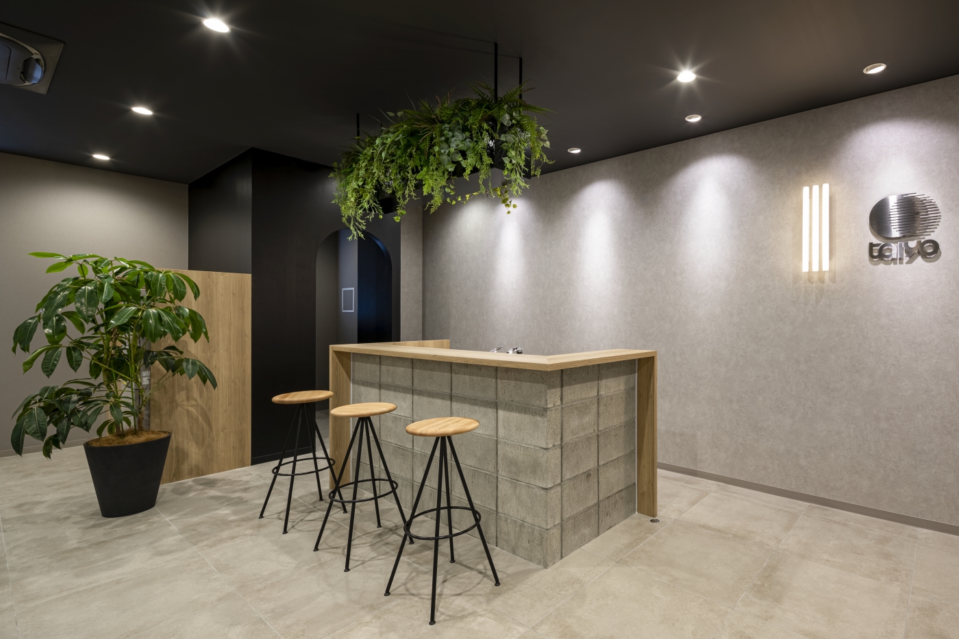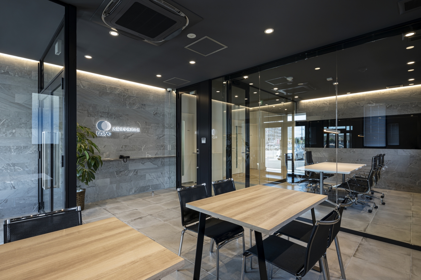 2階建ての新社屋を完成させました。1階は本社の皆様が働くワークスペースがメインのフロアです。来客対応も行うため、お顔となるエントランスやオープンミーティングスペース、応接室は石とブラックのカラーガラスで重厚感を演出しております。ワークスペースは動線や使い方を加味し、マテリアルや各機能の配置も入念にお打ち合わせを行わせていただきました。2階はリフレッシュスペースがメインのフロアです。本社のすぐ裏に自社工場を構えており、工場勤務の方々がメインで使われるため、汚れやメンテナンスを考慮しつつ、スタイリッシュなデザインを心がけました。内装だけでなく、外観にもこだわって作らせていただいたため、非常に存在感があり、多くの人の目を引くオフィスが完成しました。