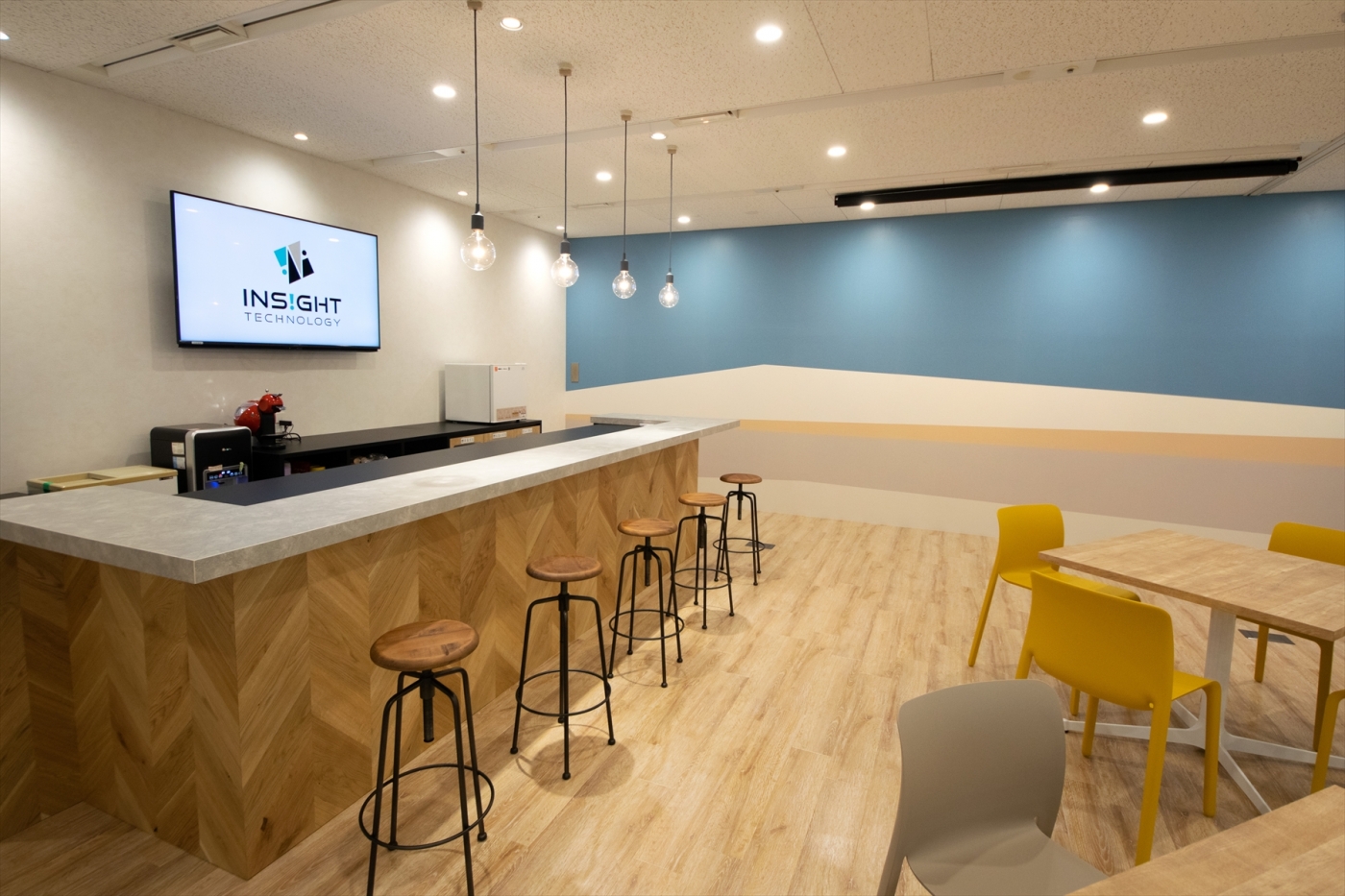 前オフィスの改装工事に続き、館内移転のお手伝いをさせていただきました。フリースペース全体は社員のコワーキングスペース兼リフレッシュスペース、来客時の打合せやセミナー開催と多様な用途で利用できるように設計しております。また、創立25周年に伴いコーポレートロゴを一新されたタイミングでしたので、空間全体にコーポレートカラーを取り入れ、各会議室にはアイコンとなるロゴを落とし込むことでCI(コーポレート・アイデンティティ)を全面に強調し、インナーブランディングにも繋がるようにしました。前オフィスに続き、こだわりを持って作ることができたカフェコーナーは社員の方々にも人気のスペースとなっています。