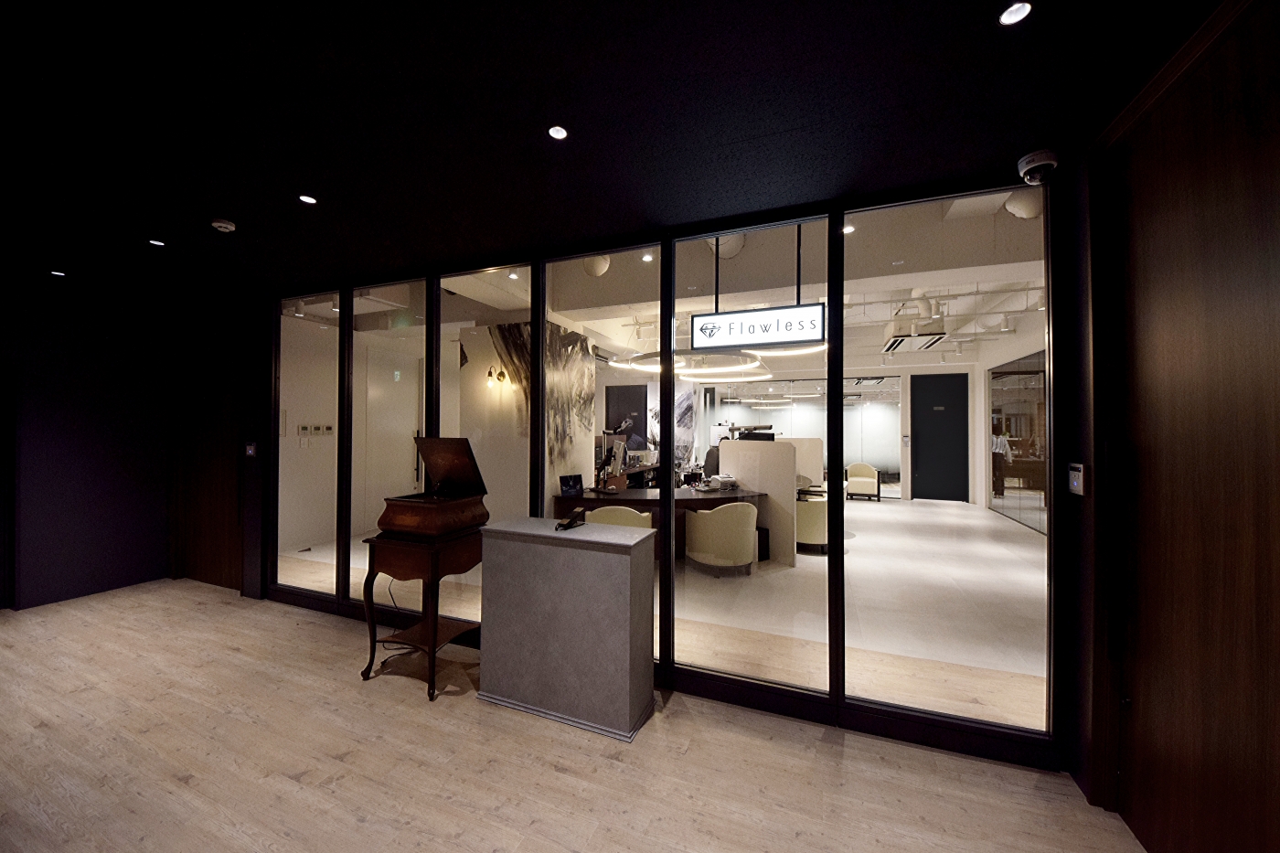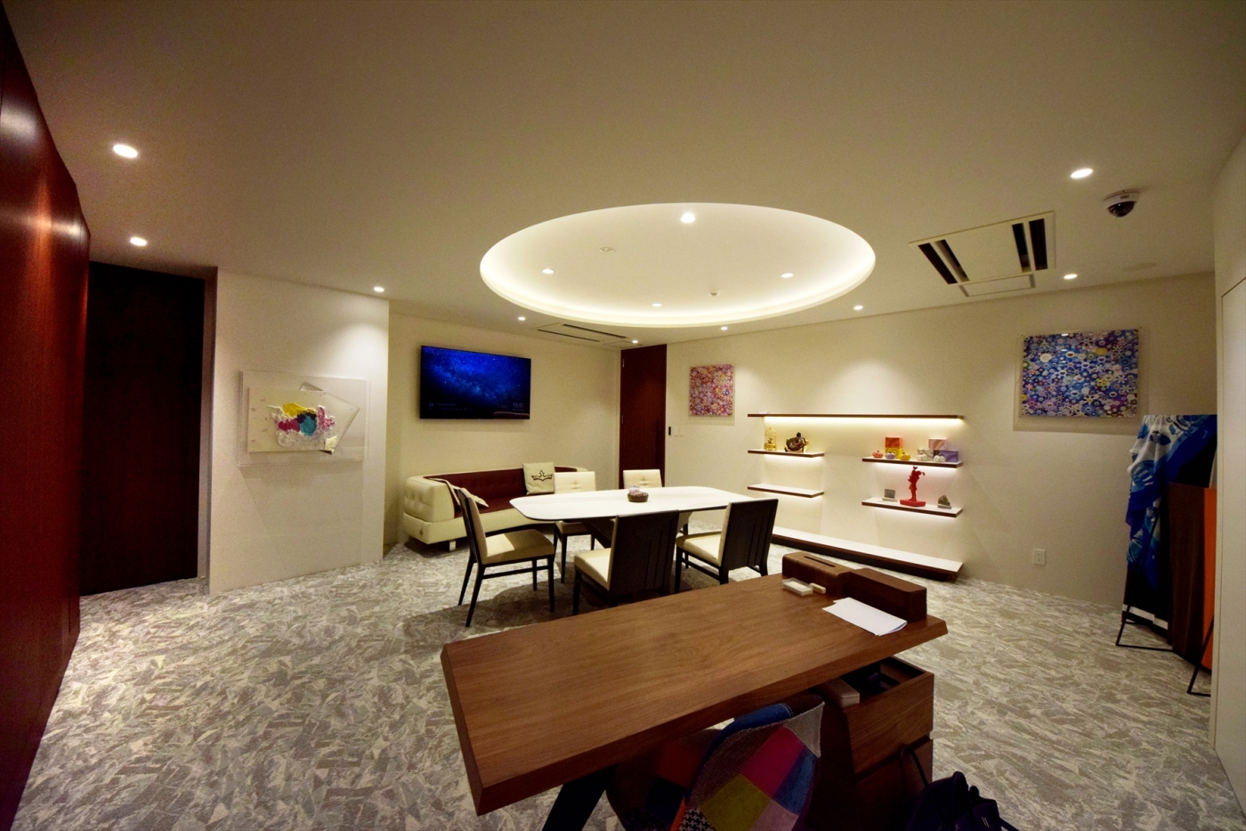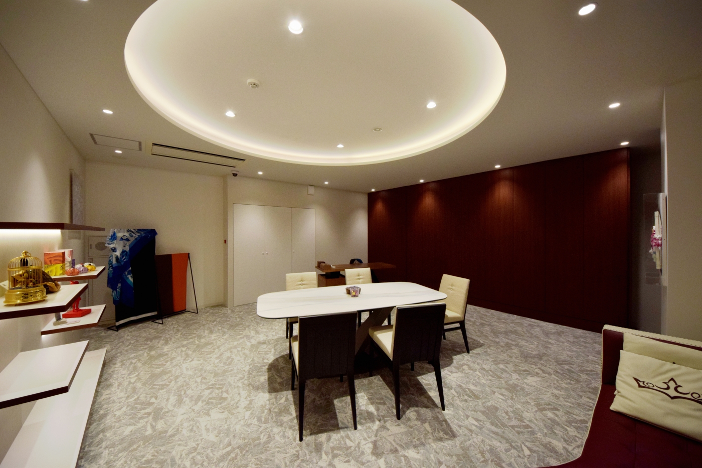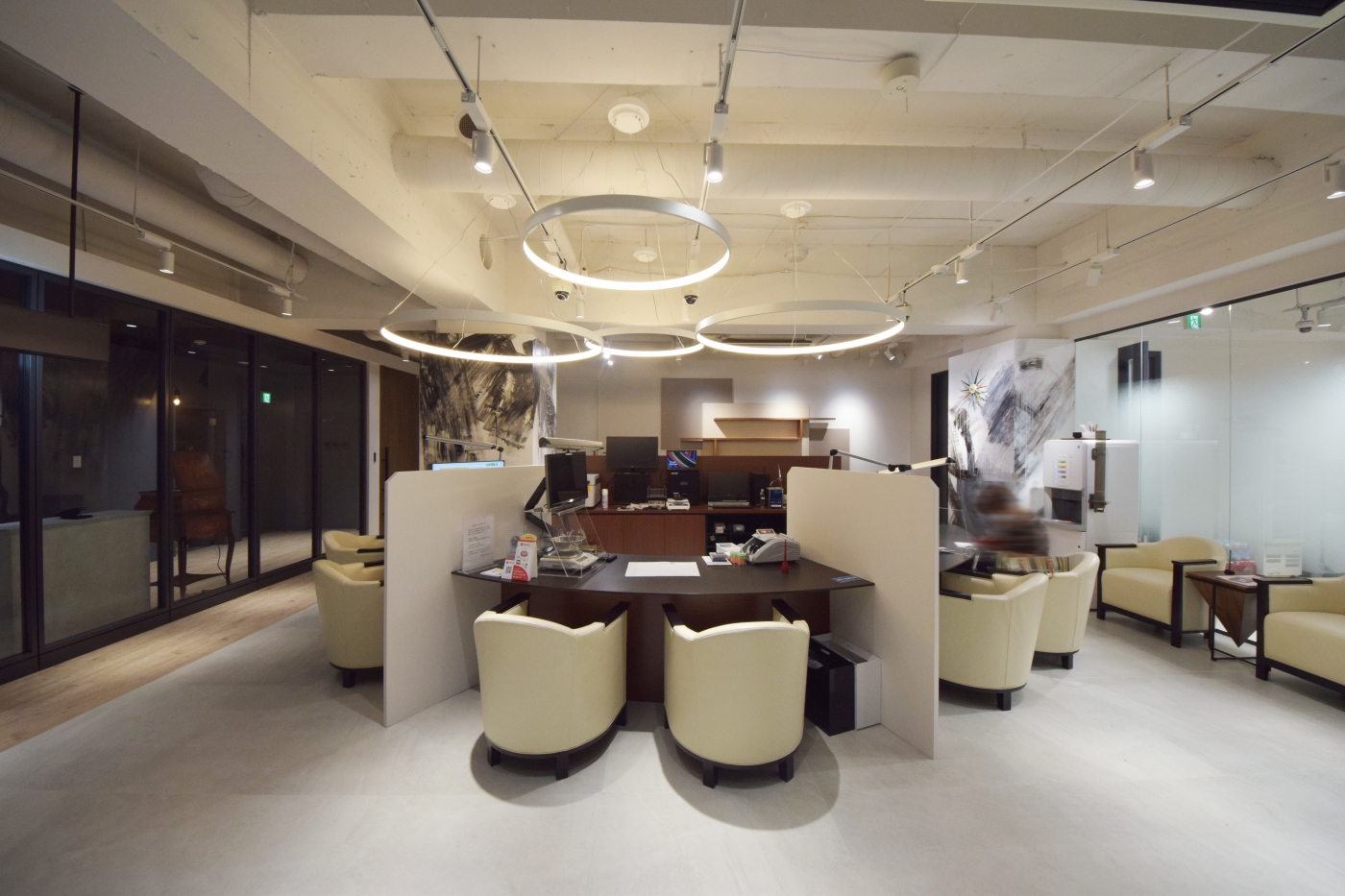 当社がデザインしたセットアップオフィスにご入居されたフローレス様のオフィスをデザインさせていただきました。 エレベーターを降りた瞬間にガラス越しに広がる鑑定テーブルは、特注で円形に造作し、来訪される方にインパクトを与えつつ、ゆとりを持った接客が可能です。ガラスで仕切られたエントランスから奥へ進むと、1人ひとりがゆとりをもって働けるワークスペースが広がります。社長室はホテルラウンジをイメージしてデザインしました。セットアップオフィスのデザインにエレガントさとラグジュアリーさを融合した、宝石の街「御徒町」でも特に光り輝くフローレス様にふさわしいオフィスとなりました。