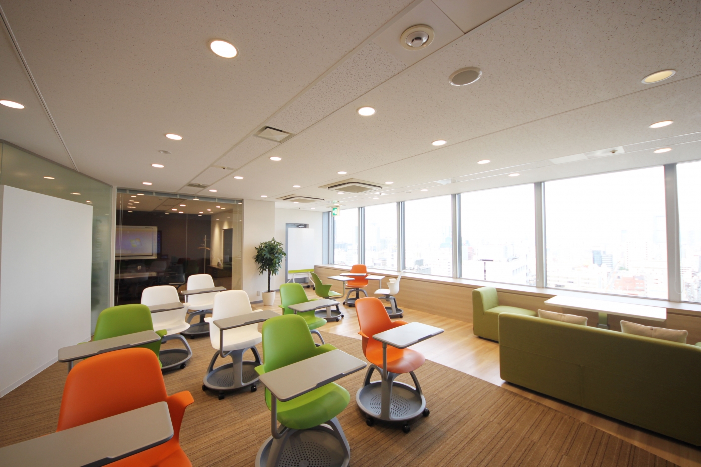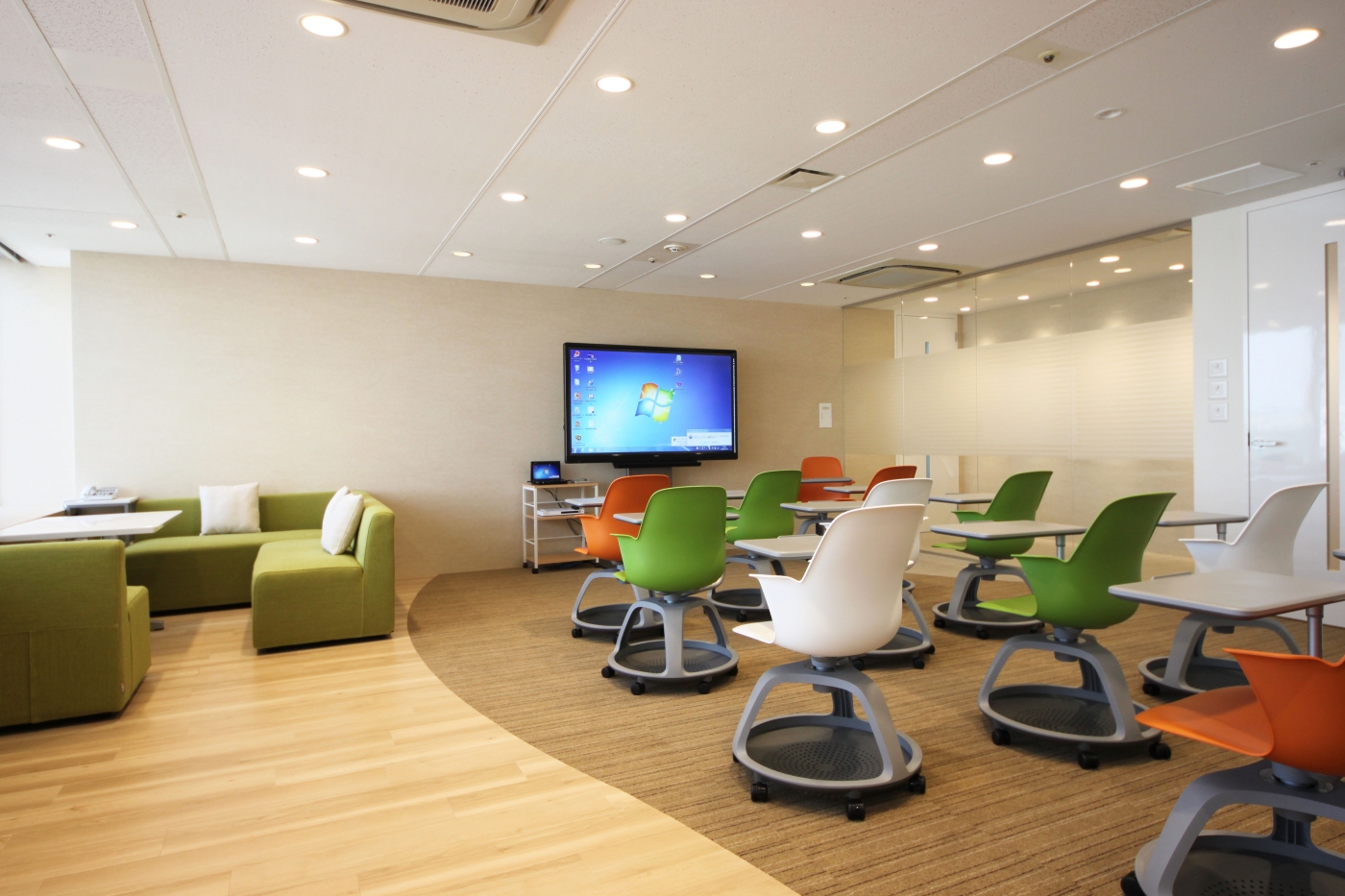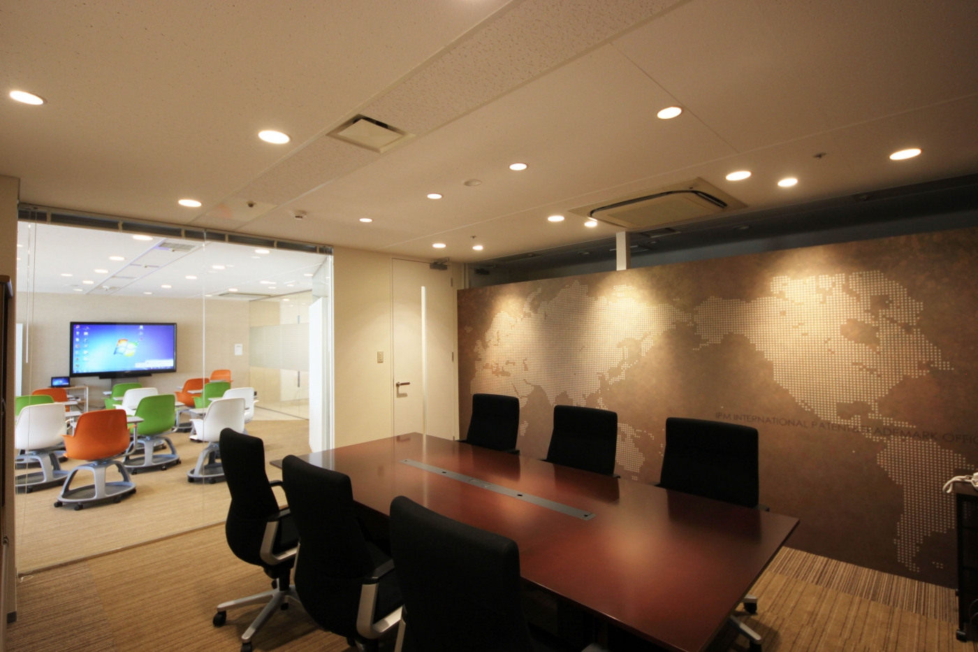 今までの特許事務所という役割だけではなく、異業種の方々や海外の方々などが集まり、自由に意見交換ができる新しい空間が欲しいというご要望を頂き、【ネオオフィス】というコンセプトのもと、デザインをしました。質感にこだわった白いエントランスは信頼感を与え、海外メーカーの色鮮やかでフレキシブルなチェアが置かれたセミナールームは、知識と創造力を生み出します。また、落ち着いた印象の会議室にはオリジナルのグラフィックを施すなど、様々な表情を兼ね備えた、こだわりがちりばめられたオフィスが出来上がりました。