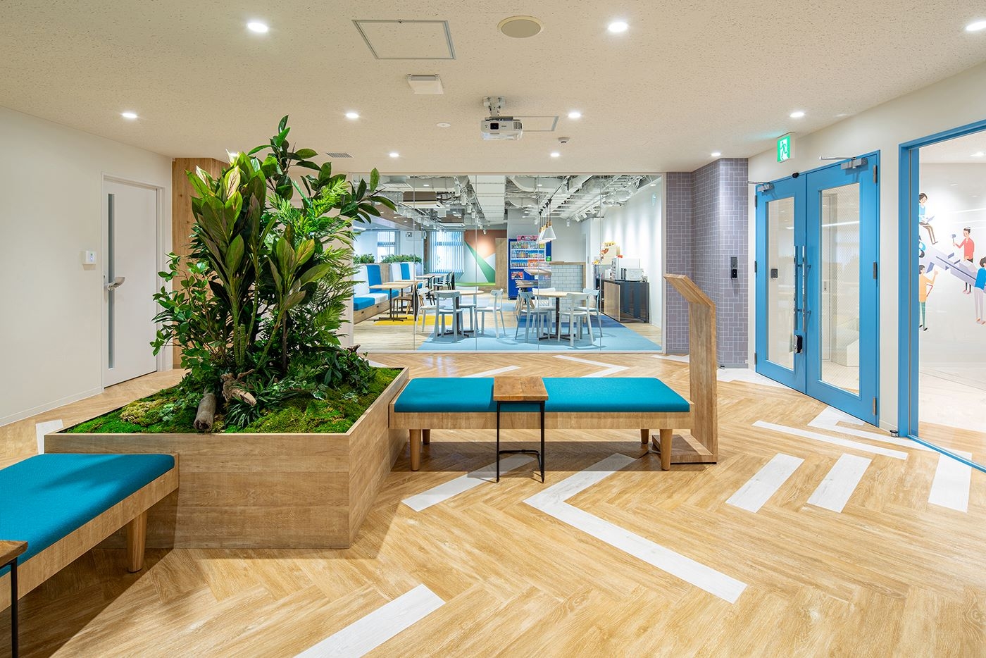 働き方が大きく変化するタイミングでのご移転につき、オフィスの在り方を見直すことも含めてご提案しました。 エレベーターを降りた瞬間、コーポレートカラーとロゴ、ガラスで抜け感のあるエントランスでお客様をお迎えしています。ワークスペースは全面スケルトン天井にし、今後のレイアウト変更や増席に囚われないことを意識して床の貼り分け等のデザインを施しています。また社内で行われるミーティングや部活など、多目的に利用されることを想定したレイアウトを設計し、コミュニケーションや可変性も考慮してオープンな空間構成としています。 全体的に白や木目・コーポレートカラーで構成し、お客様の社風を反映した明るく楽しいオフィスとなりました。