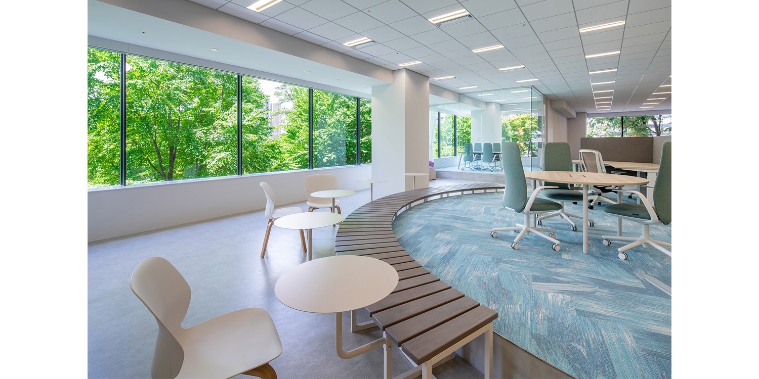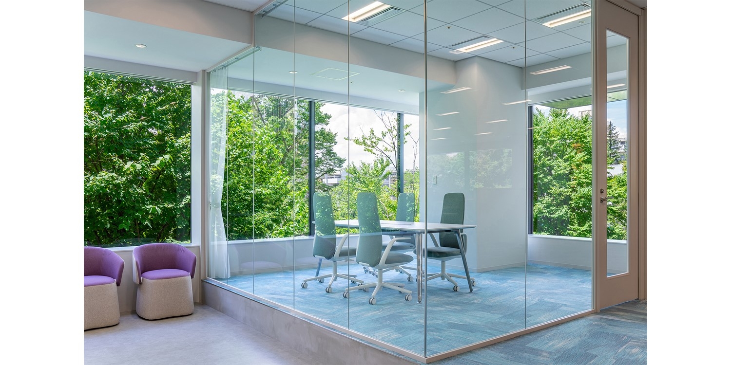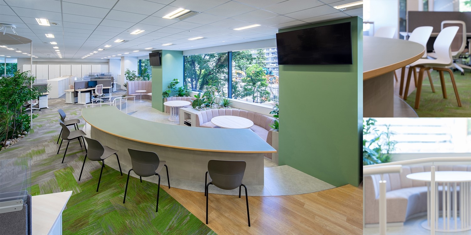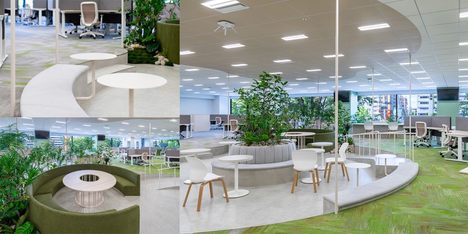 新たな働き方と企業文化の醸成のため、同じビル内でのご移転のお手伝いをさせていただきました。3方ある窓面と緑の景観を生かして、“都市に計画された公園”をコンセプトにデザインしています。業務に応じて働く場所を選べるゾーニング、エルゴノミクスに配慮した大きめの昇降デスクを採用し、今までにないフリーアドレスでの集中と解放感を両立することで新たな働き方に対応しながら、企業文化の醸成につながるコミュニケーションスペースを随所に用意しています。屋外にいるような気持ちよさを感じるアースカラーのデザイントーンと、ほとんど壁を作ることなく30cmの段差や家具で空間を緩やかに区切る構成とすることで、公園のようなオープンでウェルカムな雰囲気を演出しています。