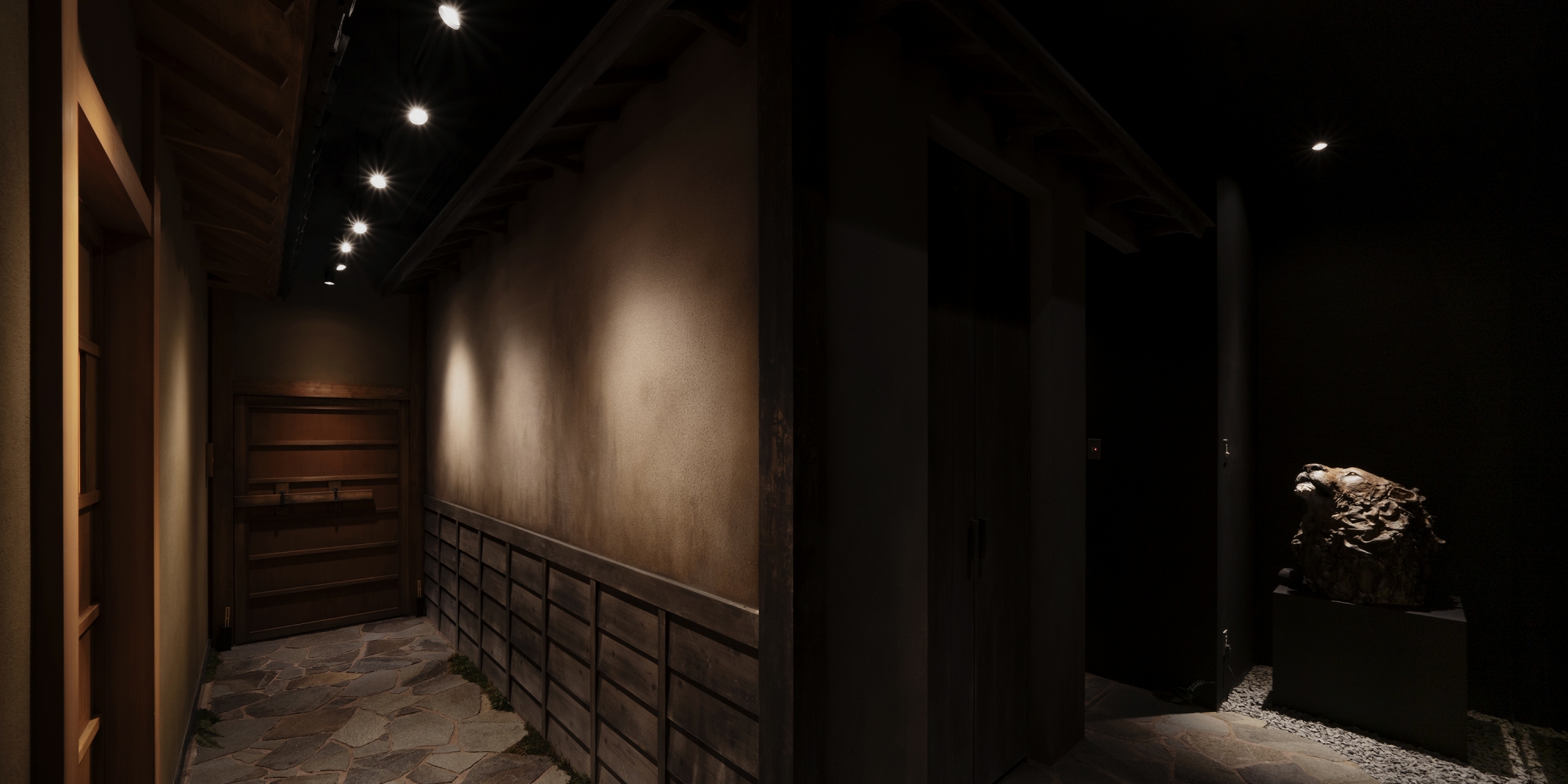 来客スペースは「和」を基本とした本格的な日本文化を感じることができる空間となりました。全体にエイジングを施すことで築100年を連想させ、本物の瓦や土壁で仕上げたハイクオリティなおもてなし空間です。通路には砂利や飛び石を敷き詰め、左右の壁の仕上げを変えることで別の母屋を連想させます。会議室内の襖を開けると巨大モニターが出現する工夫など細部にまでこだわった仕掛けをつくり、お客様も監修のもと素晴らしいオフィスに仕上がりました。来社された方が驚く、インパクトのあるデザイナーズオフィスです。