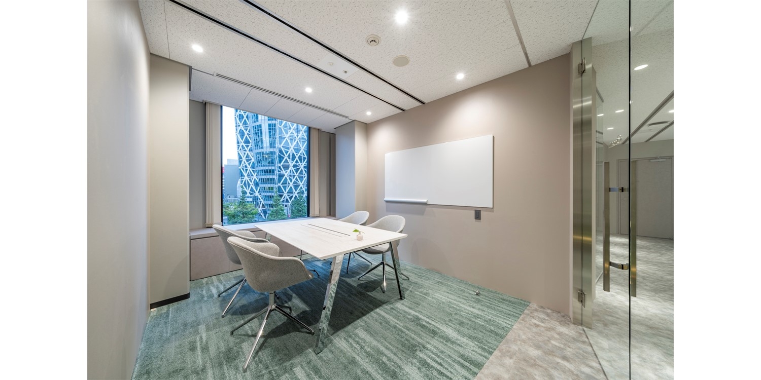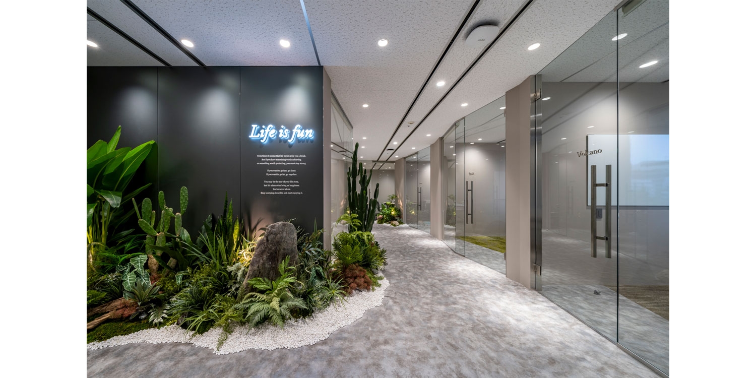 現オフィスに隣接したエリアへの増床をデザインしました。新エリアはこれまでと異なるデザインにしたいというご要望をいただき、現オフィスの濃い木目を基調とした重厚感のあるデザインに対し、グレーを基調とした空間に白テイストのグリーンを設置し、先進的で対称的な空間を演出しました。特にグリーンは本物の草木や石にこだわり、何度も試行錯誤を繰り返して納得いくまで全体のバランスを調整しています。エントランス左側の新しいエリアの入り口では、社長様の熱い想いがこもった「Life is fun」という言葉と英文メッセージがお客様をお出迎えします。会議室にはお客様自身で考えた会議室名のサインを設置し、それぞれの会議室名に因んだ素材や家具を選定することで唯一無二のコンセプチュアルな空間に仕上がりました。全体を通して、細部までこだわり抜かれたデザイナーズオフィスです。