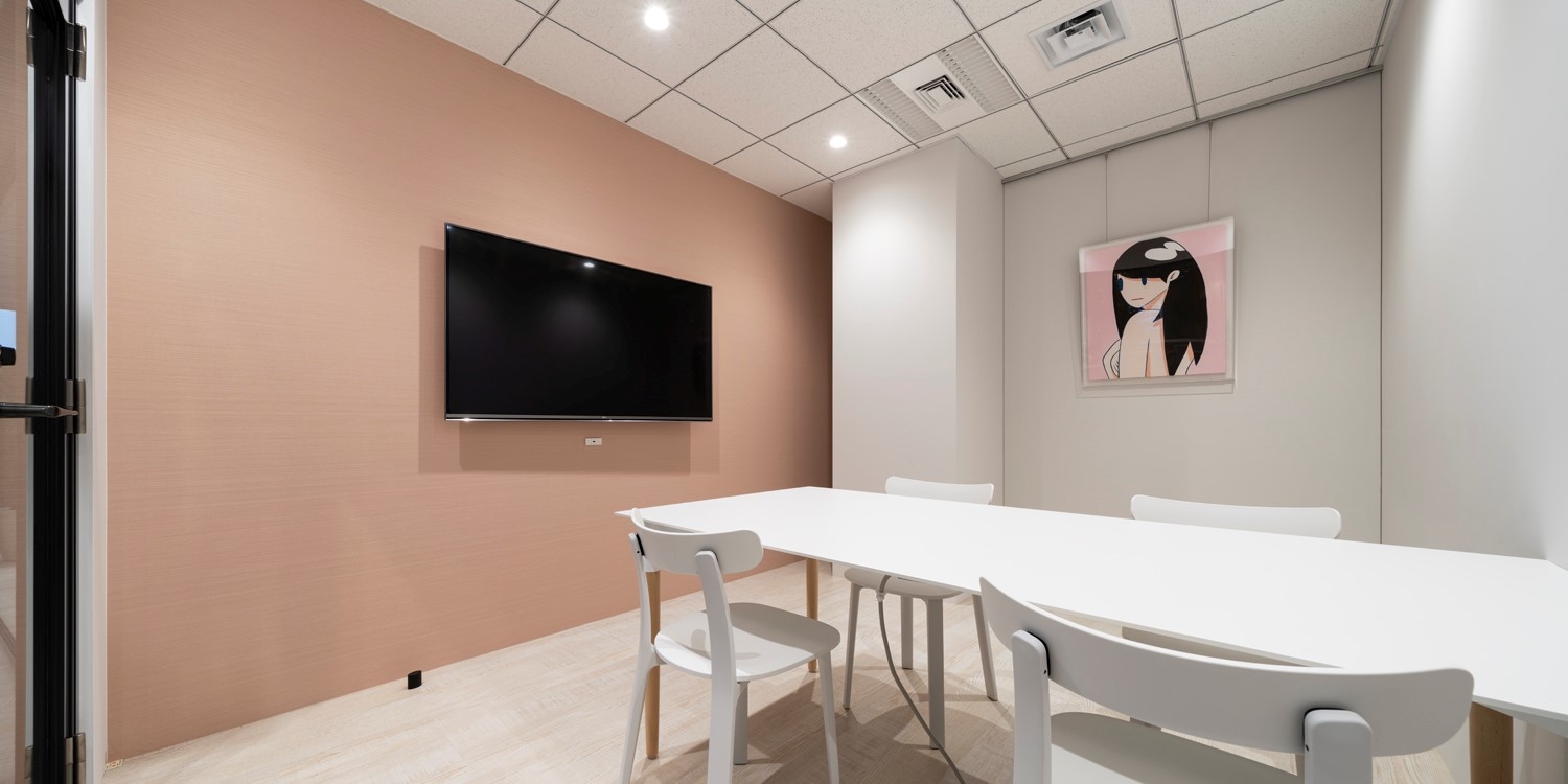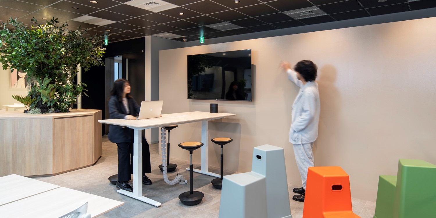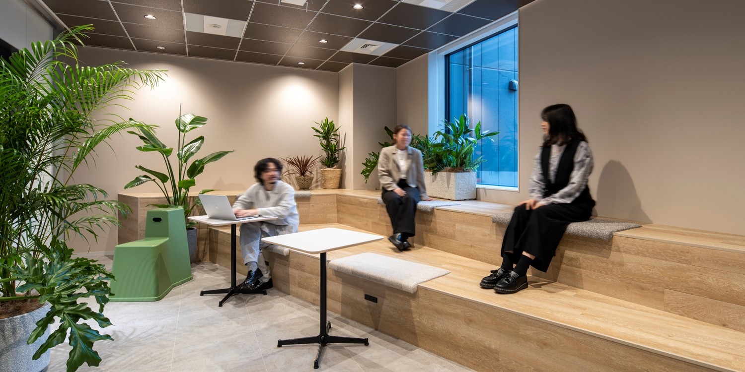 社員の居心地の良さを重視し、オフィスでありながら家のような居場所をデザインで実現しました。コンセプトは「しぶや〇LDK」とし、時には1ルームで家族全員が集まれる場所として、時にはそれぞれが集中して作業ができる場所として、オープンでゆるやかに区切ることができるレイアウトとしました。フリースペースでは階段状の段差を作り、打合せのほか社内イベント、ランチなどコミュニケーションを取りやすい空間としています。会議室は都市的でドライなデザインの中にポップアートで柔らかさを持たせました。エントランスすぐのシンボルツリーをはじめグリーンをオフィス全体に配置し、開放的で心地よい空間となりました。