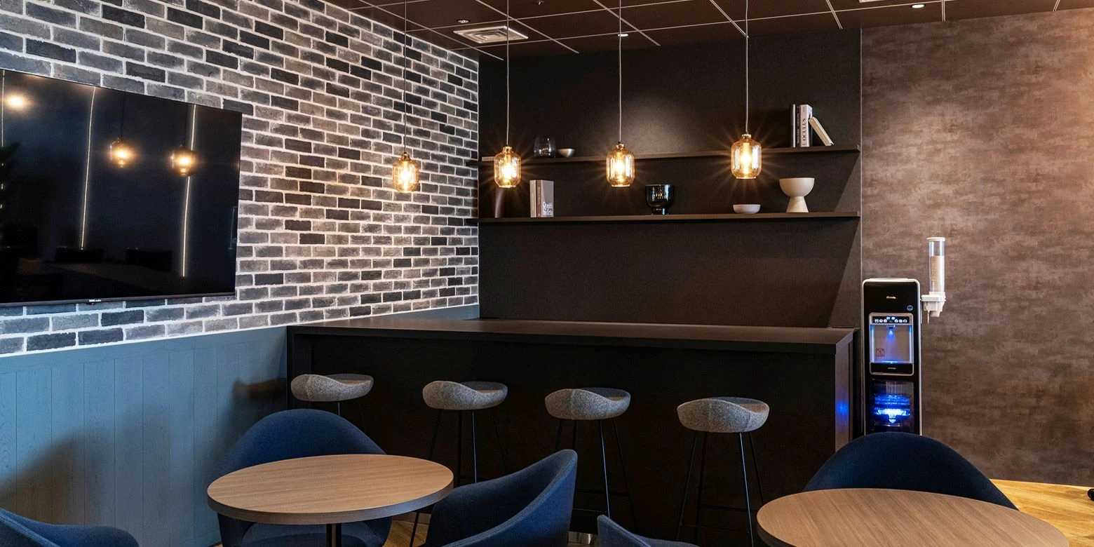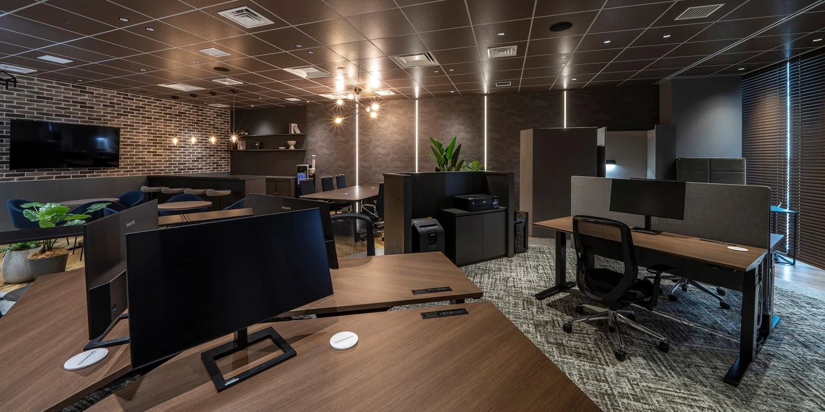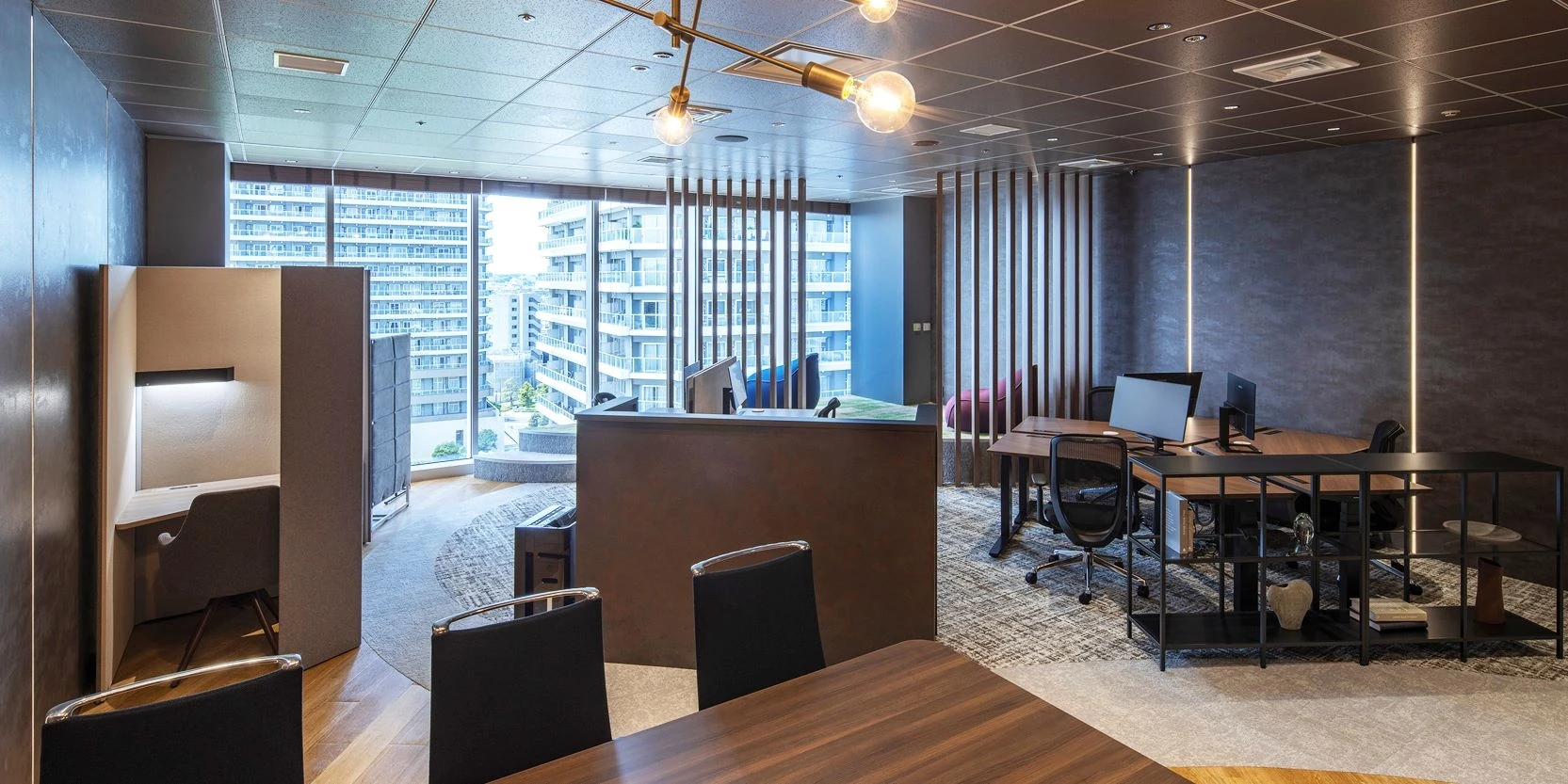 「社員一人ひとりが自分にとって働きやすい環境を選択できる企業」としてシンポー情報システム様独自の「第3のワークスペース」を作りたいという要望でコワーキングスペースをデザインしました。コンセプトは「大人の秘密基地」とし、他にはない機能性とデザイン性を兼ね備えたスペースになりました。入口付近にはカフェ・パントリースペースを設け、コミュニケーションを取りやすい空間に。奥側には集中スペースやオンラインブースを構成し、個人で業務をしやすい空間にしました。窓際には床の高さを上げたスキップフロアを設け、壁代わりのルーバーで間仕切ることで、空間の一体感を感じながらもくつろげる空間になっています。業務、コミュニケーション、休憩と、一人ひとりが自ら環境を選ぶことができます。家具やデザインは全体的に落ち着いた色味で統一し、落ち着いて仕事ができる“大人の”空間をデザインしました。