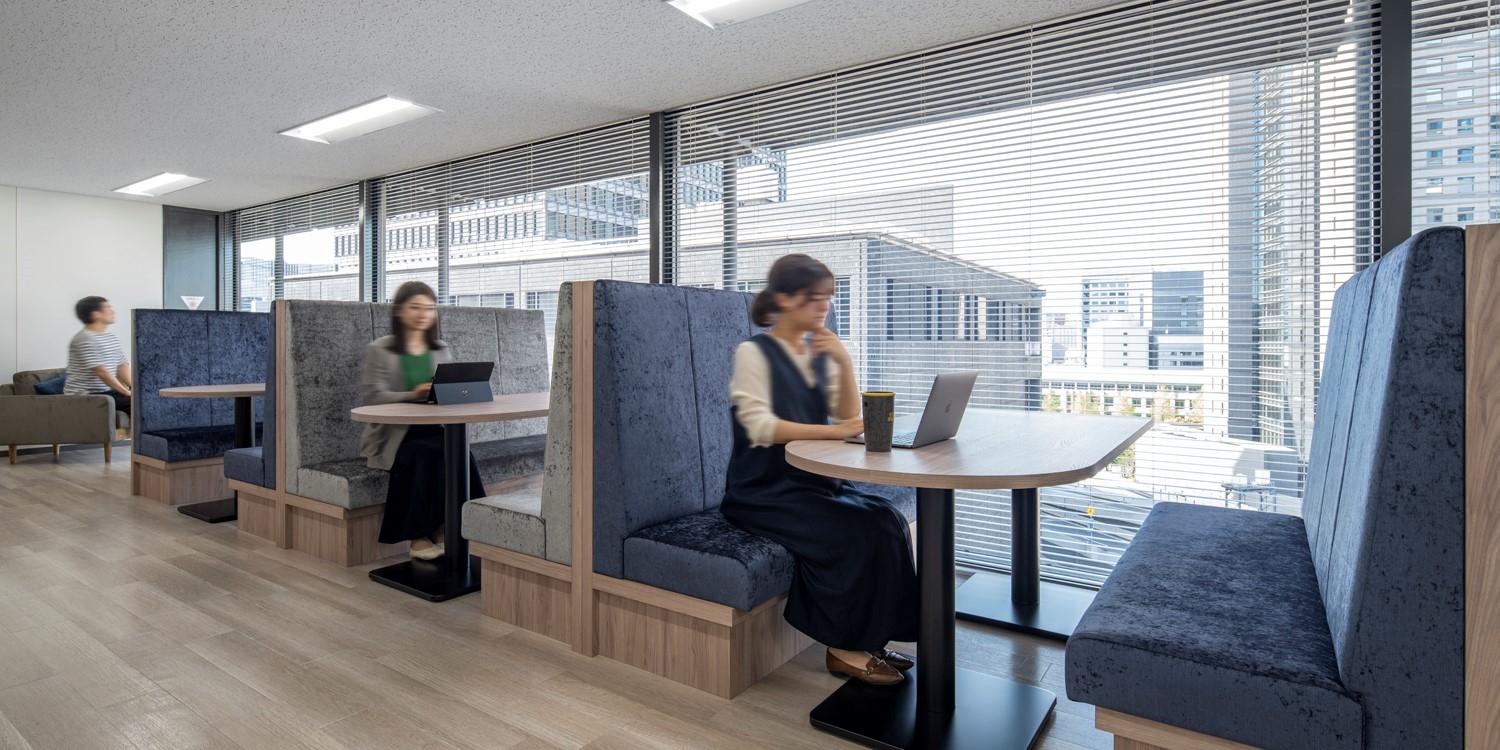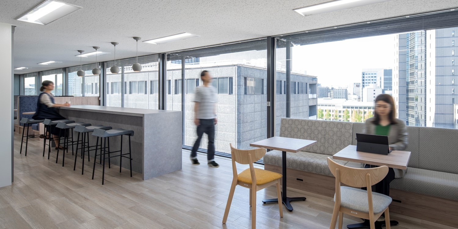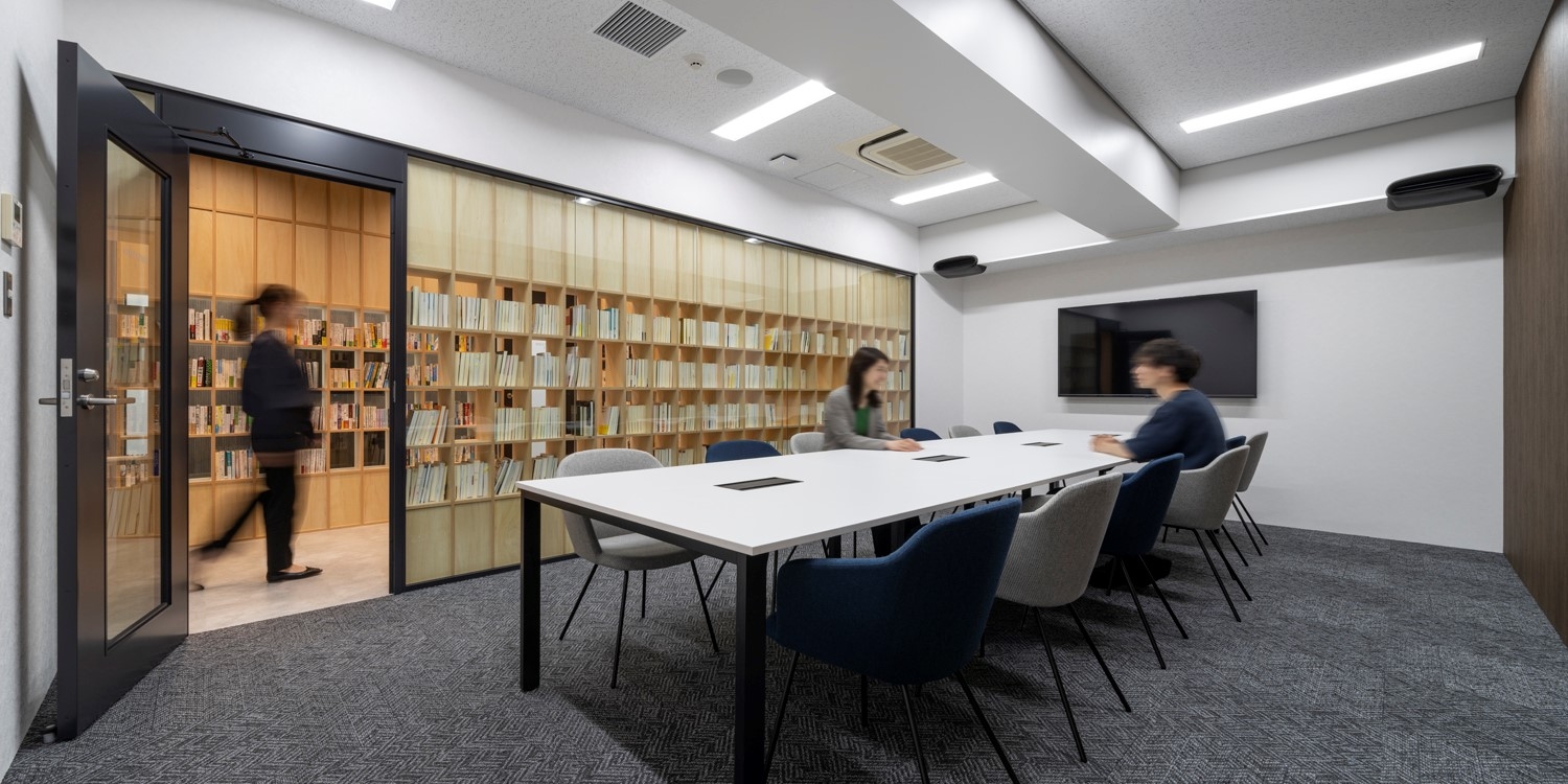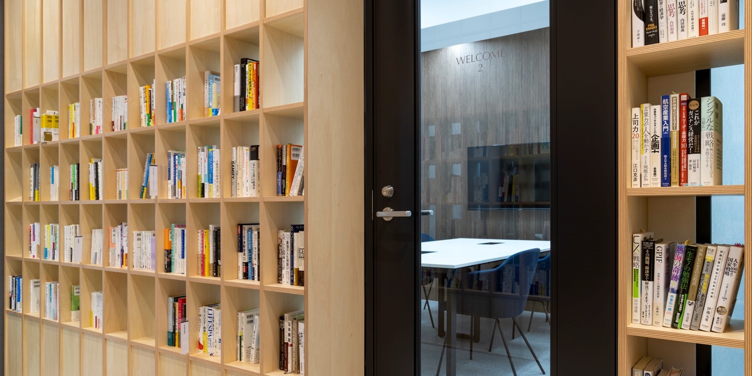 目的に合わせて働き方を選べるレイアウト。圧巻の本棚が迎えるブランディングオフィス