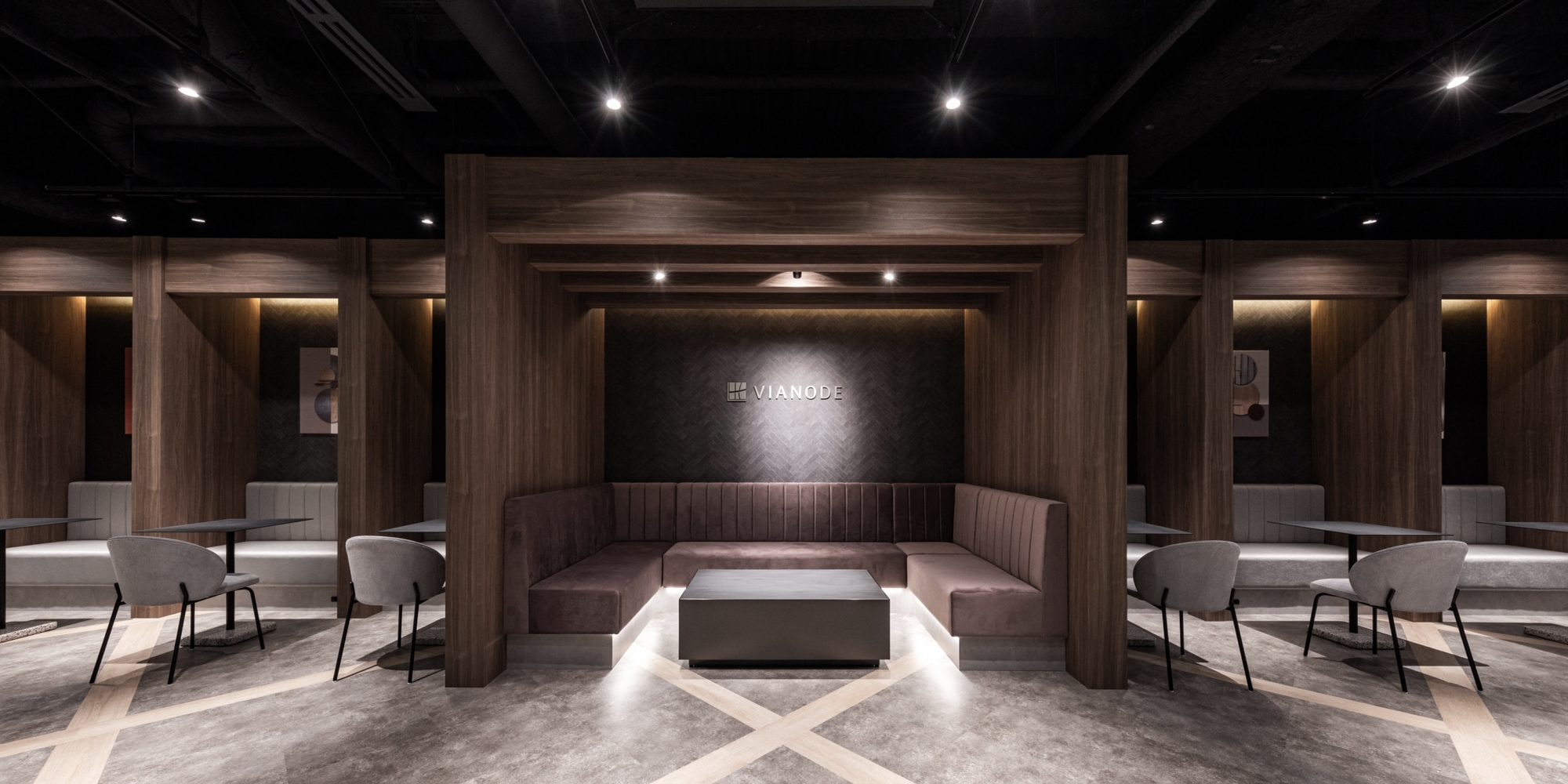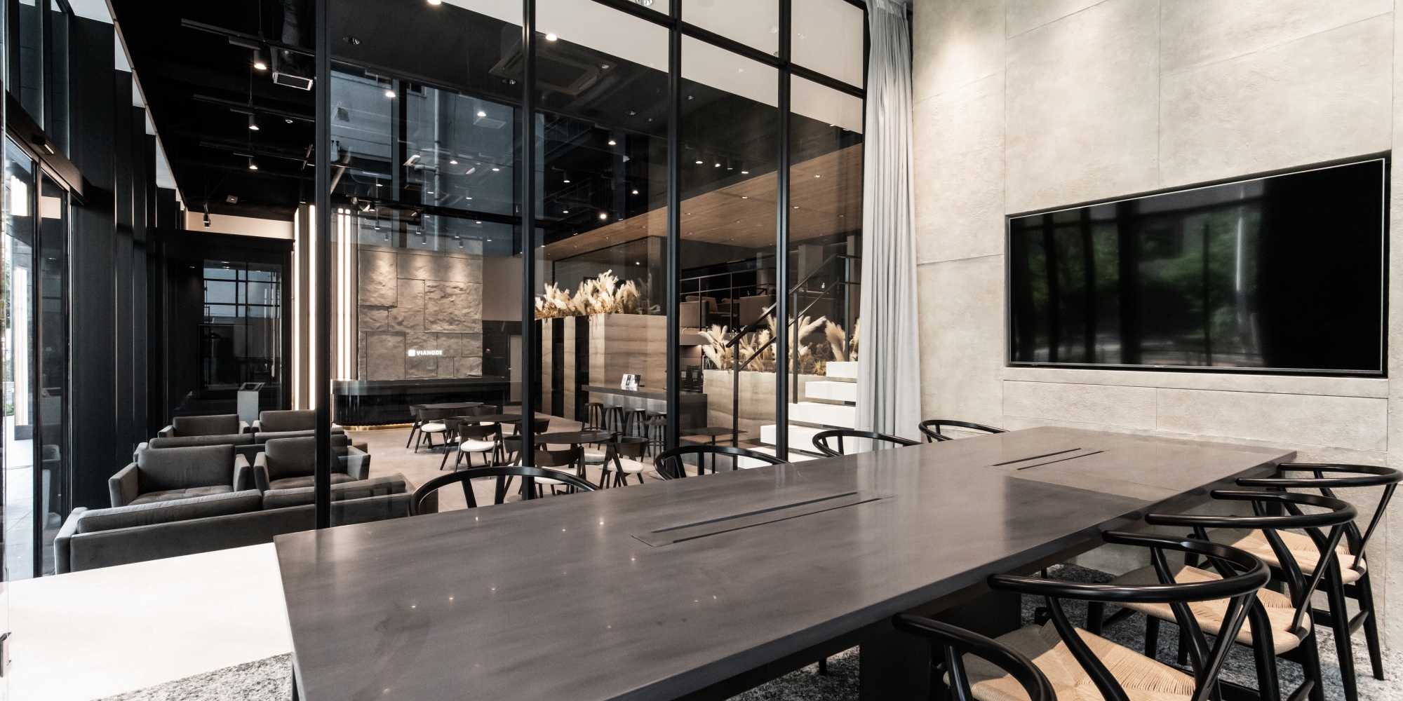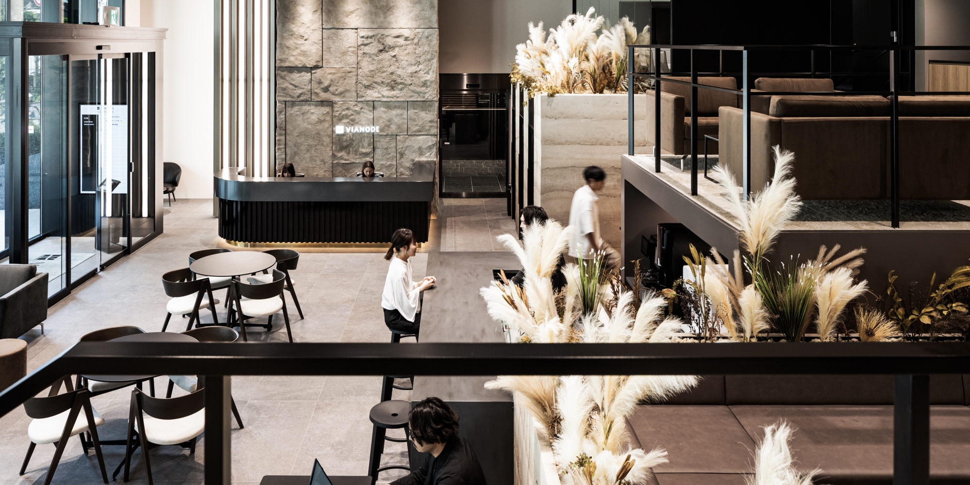 「Vianode SHIN-OSAKA(ヴィアノード新大阪)」は、大和ハウス工業様が手がけるオフィスビル。新築ビル11階建てのうち1階を入居者が共用で利用可能なビジネスラウンジ、3階をシェアオフィスにし、ビル入居者の利便性向上、ビルの利用価値向上を目的に設計・デザインしました。デザインコンセプトは『Villa(ヴィラ)』。“日常の中の非日常”を体感することを最大のゴールに、「その場所で体験できる価値」をいかにデザインの力で高めるかを軸に空間構成を行いました。“非日常”から導いたキーワード「ワーケーション」や「リゾート」をテーマに、1階ビジネスラウンジは天井高約6mの広々と開放的な空間を活かし、スキップフロアを採用。壁面には地層を連想させる意匠を施し木目天井のディティールにもこだわりました。人と人とのリアルなコミュニケーションを後押しするため、それぞれの業務内容に合わせて選べる多様な環境を用意しています。3階は、シェアオフィス契約者様専用スペースとし、約210坪(700平方メートル)のスペース内に、1名用の半個室を30室、1~8名用の完全個室を27室用意しました。人数や企業の成長フェーズに合わせて場所を選ぶことができます。ビル一棟でのABWを実現し、洗練された知的創造性を高めるデザイン空間を提供しています。