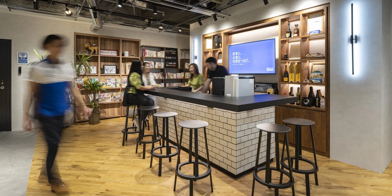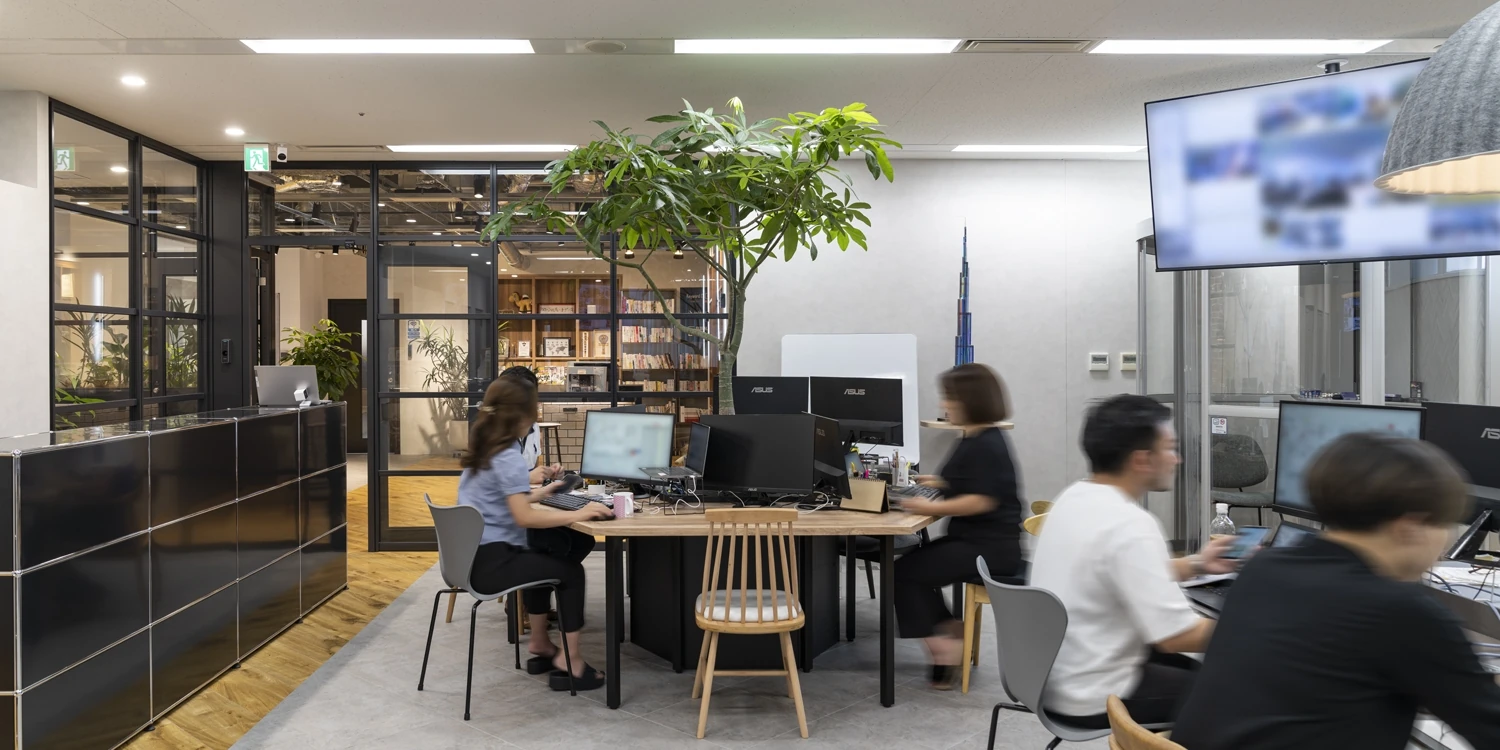 自社のYouTube配信を行うスタジオ兼営業拠点の開設プロジェクト。事業拡大に伴う採用効率向上や社員のエンゲージメント向上を目指し空間全体をデザインしました。青と白のラインが映える印象的なエントランスを抜けスタジオに入ると空間の広がりを感じられます。スタジオにはカフェカウンターを設け、本棚を設置。書籍やメイン拠点であるドバイを感じられる装飾・小物を多数置いています。人が気軽に集まり話が生まれる仕掛けをつくり、オフィス全体のハブとしての機能を設計しました。ハイカウンターやソファ、会議室など、スタジオを起点に様々なコミュニケーションが取れるレイアウトとしています。デザインはクールさや落ち着きを意識した反面、ソファなど家具についてはカジュアルさや明るさを感じるものを選定しました。部分的にスケルトン天井にすることで、スタジオがより特別な空間になり、集まりやすい雰囲気を作り出しています。配信からリフレッシュ、内外のイベントまで、マルチに利用できる空間となりました。