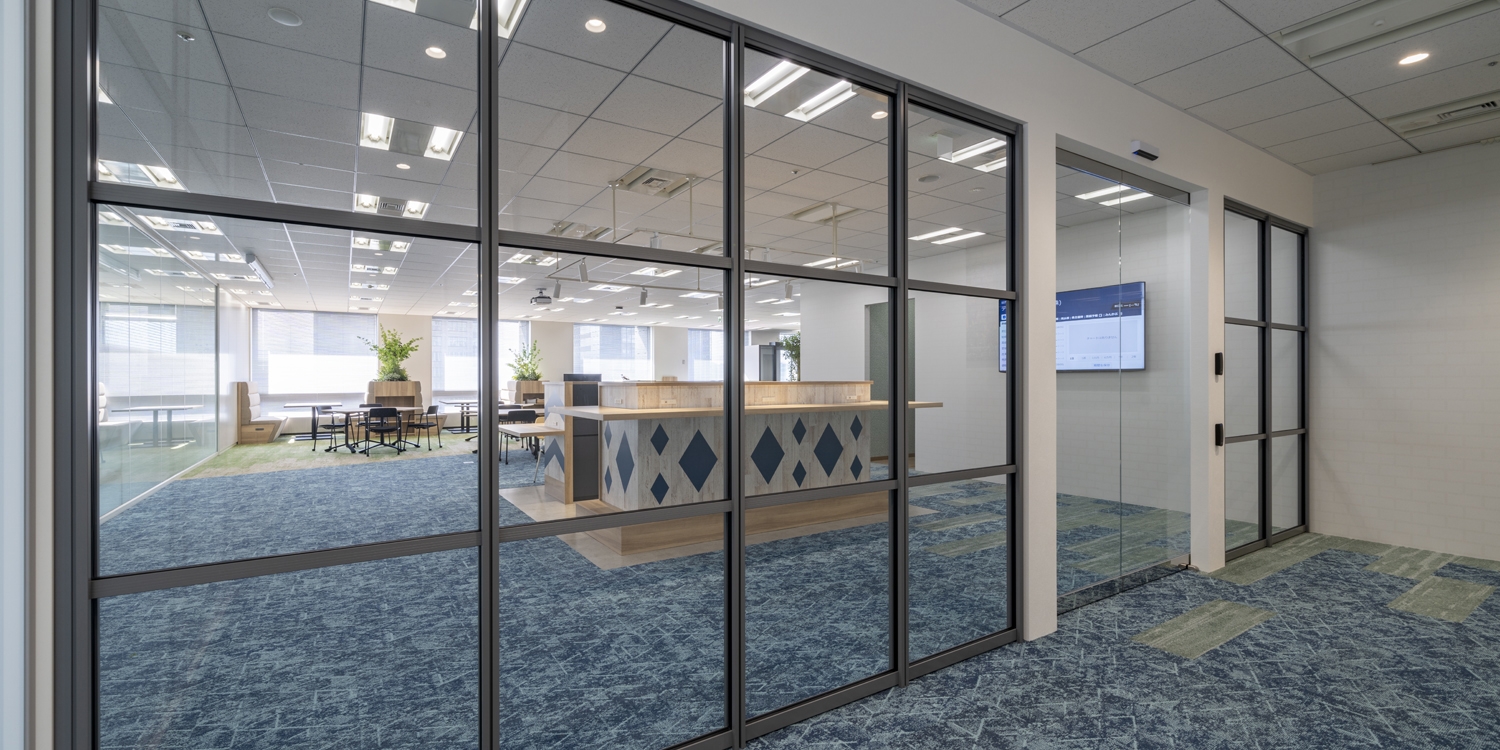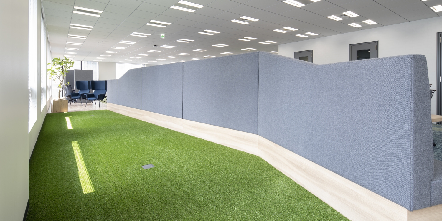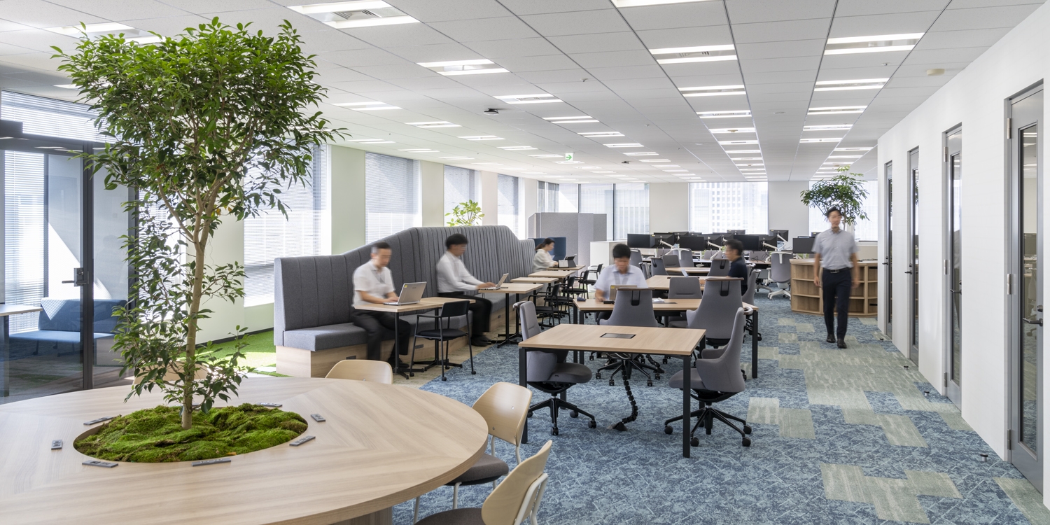 増員に伴い、オフィス改装・フリーアドレス導入など働き方の変革をお手伝いしました。生産性が高く働きやすい業務環境の実現と、来社した方へのテスホールディングス様の魅力発信も兼ね備えたオフィスを目指し、設計しました。オフィス全体を通してコンセプトの「循環」を体感できるよう「水」や「流れ」を意識したゾーニングとしています。それぞれのエリアに「ソロワーク」「チームワーク」「コミュニケーション」「エントランス」の機能性を付与し、業務効率と社員エンゲージメントを両立できる空間を作りました。エントランスは、浜辺を連想させる配色や曲線で、開放的で明るい印象に。執務エリアへと続く床は海の水面をイメージしたグラデーション貼りで動線を表現しました。ワークスペースにはシンボルツリーや窓側のソファスペース、動かしやすいデスク・チェア、人工芝のスペースなど多様なスペースを設け、働く場所を選び他支社との活発な交流を行うことができるオフィスへ。湧き水のようにアイデアが生まれ、チーム内でのコラボレーションワークやコミュニケーションを経て会議や発表の場で広がっていく。そんな“ワークサイクル”をデザインしたオフィス空間になりました。