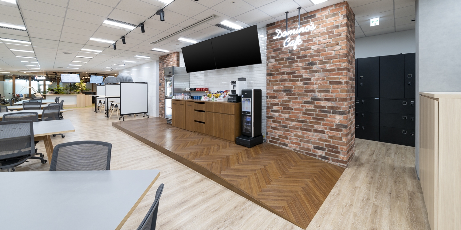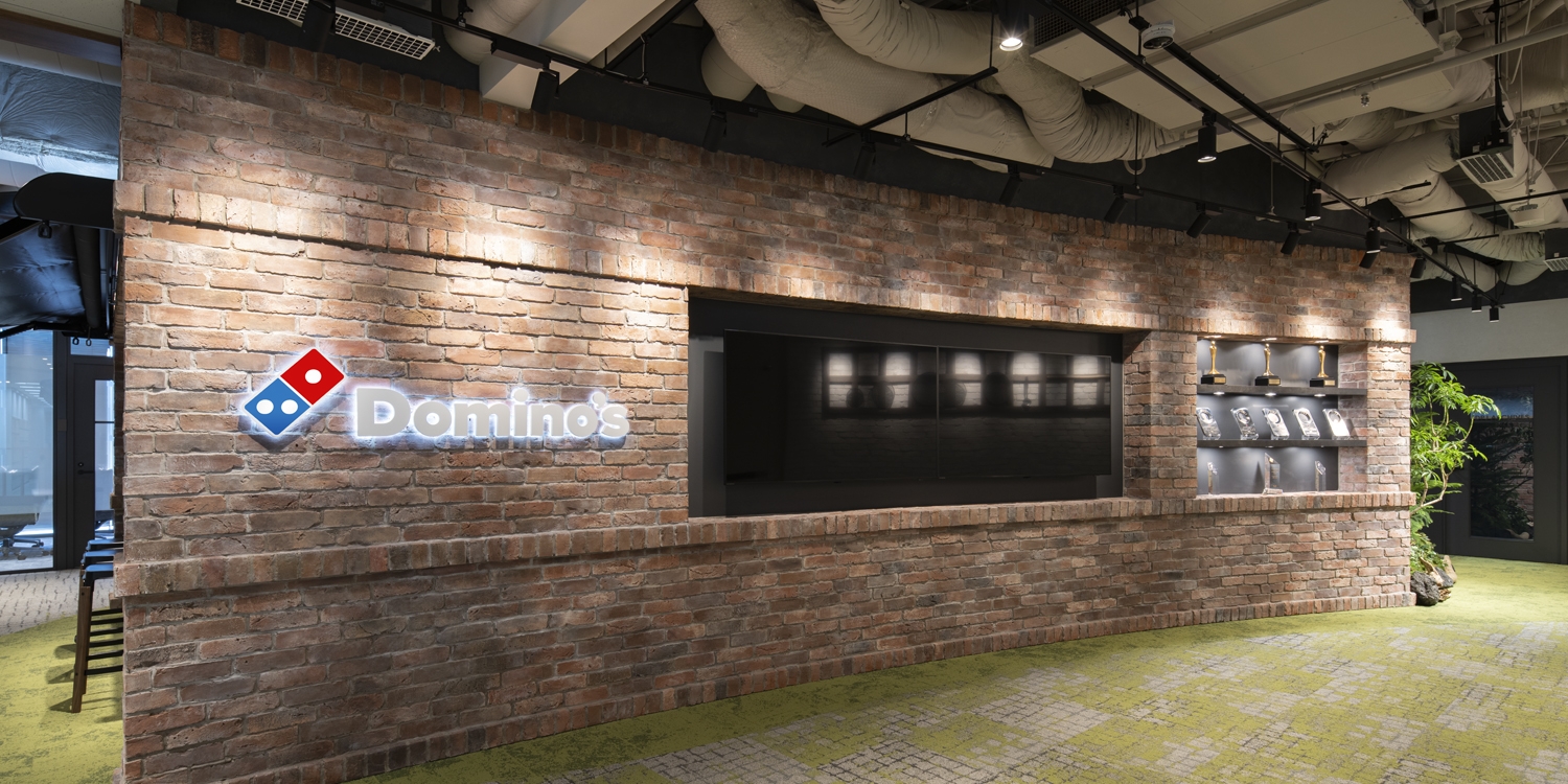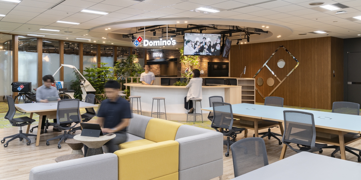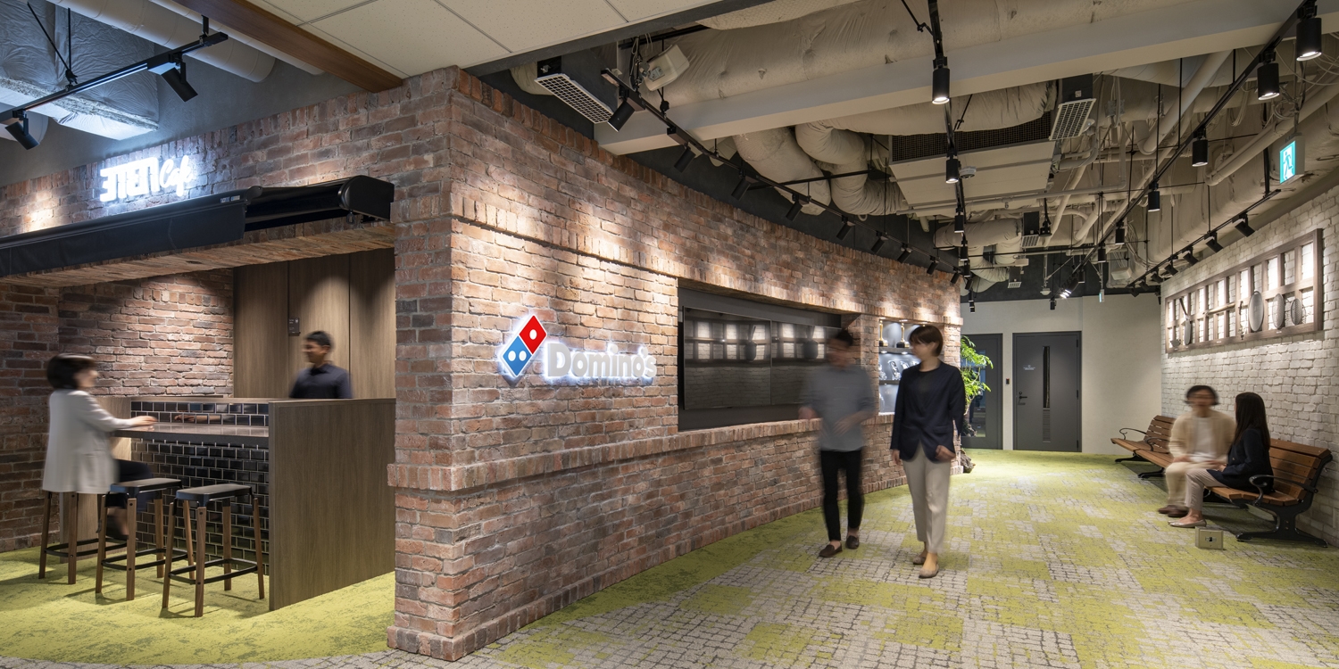 ドミノ・ピザジャパン様のパーパス&ビジョン「ピザでつながる」をベースに、社長メッセージ、バリュー、カルチャー、メンバーとの関係性等から、オフィスのありたい姿をイメージしました。コンセプトは「FAMIGLIE(家族のイタリア語)」とし、家族があつまるように自然体で、朗らかに。変化し、成長し、継承していく集いの場を実現するオフィスをデザインしました。創業当時の街やピザ窯を連想させるブリックタイルを使用し、ロゴやデジタルサイネージを点在させることで、社員はもちろん、来社するすべての方へ向けてブランドの発信ができるオフィスです。グリーンは本社があるアメリカ・ミシガン州のイメージで取り入れ、都会的なオフィスの中でも自然を感じられます。エントランスすぐにコワーキングエリアを設置し、フランチャイジーともコミュニケーションがとれるようにしました。ワークスペースは、フレキシブルに働けるようソロワークエリア・チームワークエリアを混在させたハイブリットオフィスとして構成し、人数や使用方法の変化にも対応できるよう設計しています。周囲にはホワイトボードデスクなどを設置し、すぐにミーティング、ブレストができる環境を整えました。プロジェクトごとに集中してディスカッションできるプロジェクトルームも複数設けています。ドミノピザ・ジャパン様の第2の我が家として、企業成長やシナジーを生み出す場となるようデザインしました。