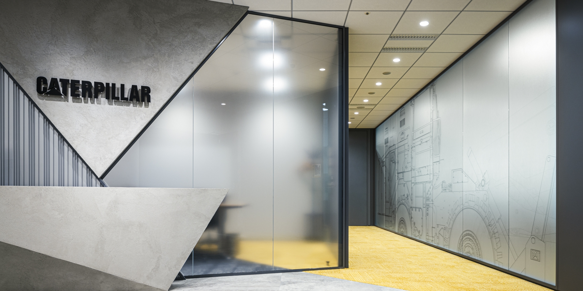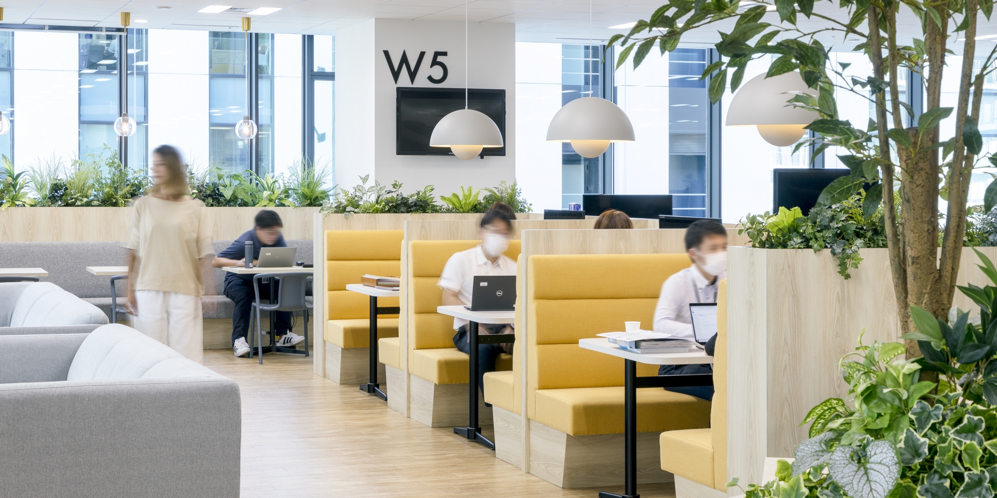 多様な働き方の実現・出社やコミュニケーションの価値を感じられることを目的としたオフィス改装をお手伝いしました。テレワークを併用しているため、出社時にその日の仕事内容や気分によって働く場所を選べるよう用途ごとに複数のエリアをつくりました。エリアの区切りは床の張り替えや家具の色味を変えることで表現し、リフレッシュスペース・ワークスペース・集中スペースとそれぞれメリハリを効かせたデザインになっています。エントランスの壁面・造作カウンターにはモルタルを使用し、重機を扱うクールなイメージを表現しました。また、窓際に設けたリフレッシュスペースはキャタピラージャパン様のコンセプトカラーであるイエローを多用し、明るく開放的な雰囲気を演出しています。メリハリが効いた中につながりを感じられる、社員の皆さまの働きやすさを第一に考えたオフィスとなりました。