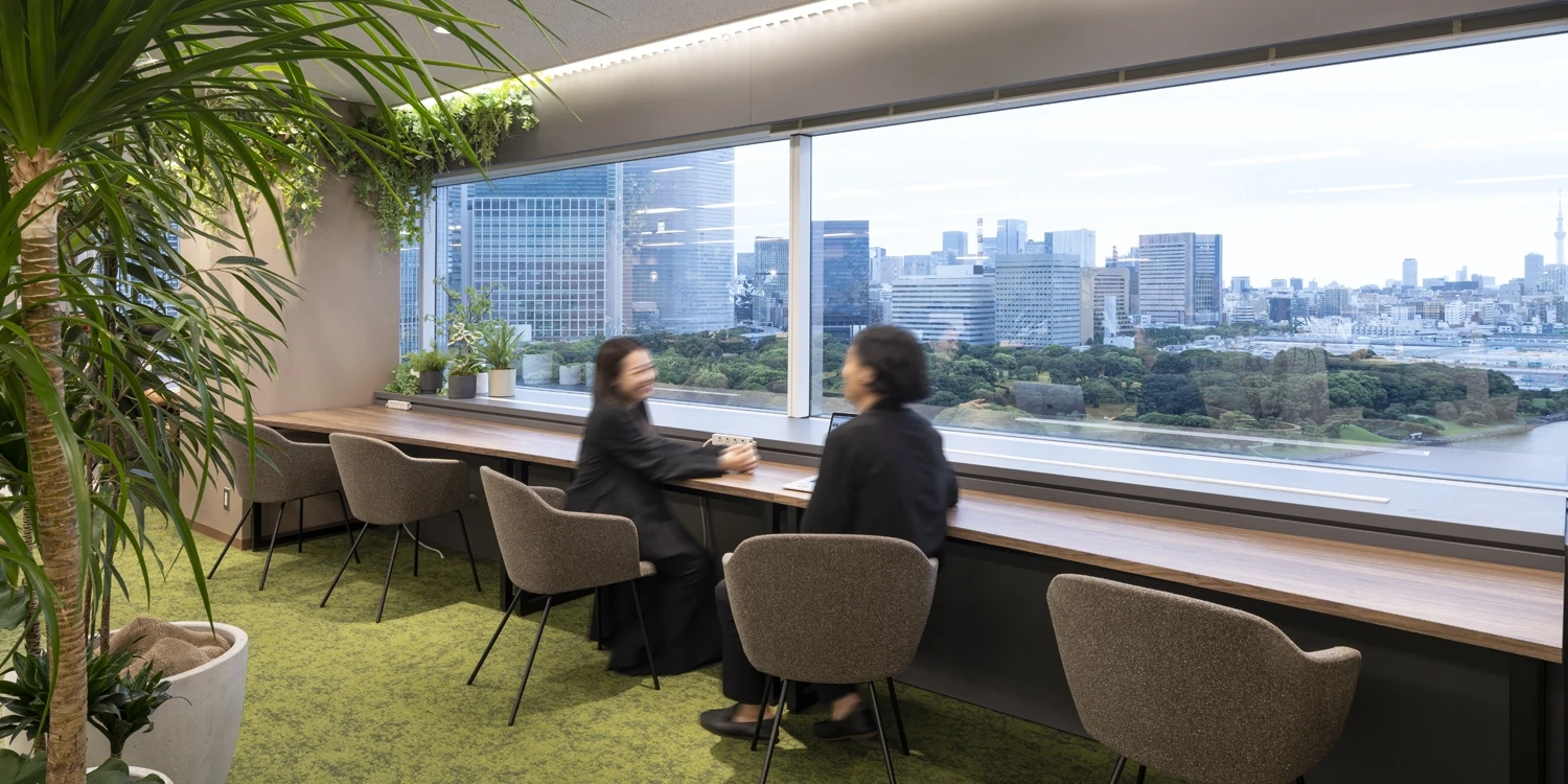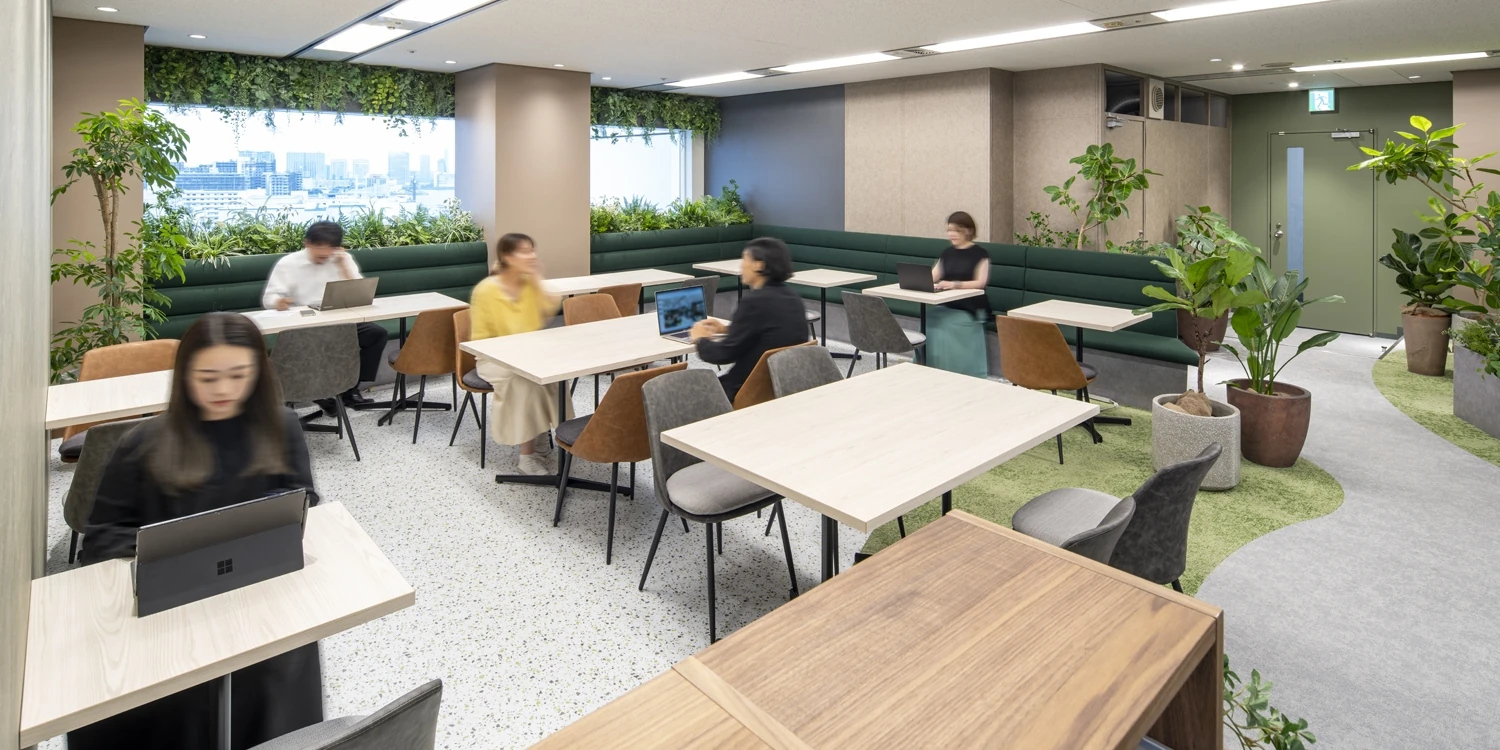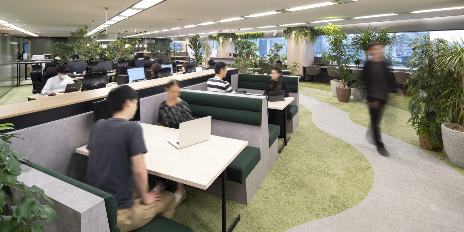オフィス改装にあたり、気持ちの良い環境でリフレッシュして働きたいという想いで「オフィスに森をつくる」というご要望をいただき、グリーンあふれるバイオフィリックが特徴の有機的なオフィスをデザインしました。オフィス内にはできるだけ壁をつくらず、植栽を間仕切りとして設置することにより、空間の広がりを演出しながらも目線が気にならないレイアウトとしました。植栽は植物の種類はもちろん、鉢やサイズも一つひとつ選定し、オフィス全体のバランスを見て配置をしています。床や壁などに使用する素材、ソファやデスクなどの家具はグリーン、ブラウン、グレーを中心に自然を連想できるものでまとめました。働くエリアも、改装前は固定席が中心でしたが、改装後はワークデスクに加え眺望の良い窓際を活用したカウンター席やボックス席などを設け、その日の業務内容・気分によって働く場所が選択できるオフィスとなりました。