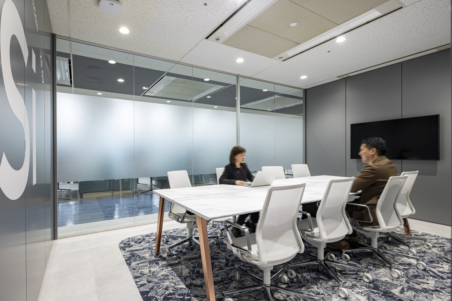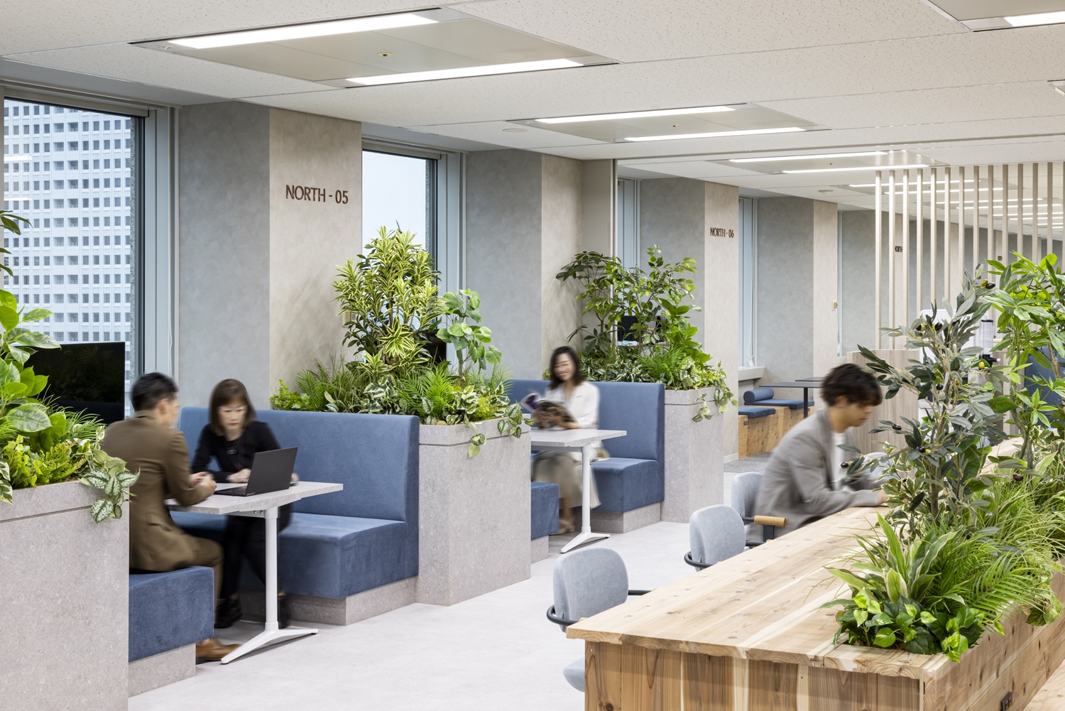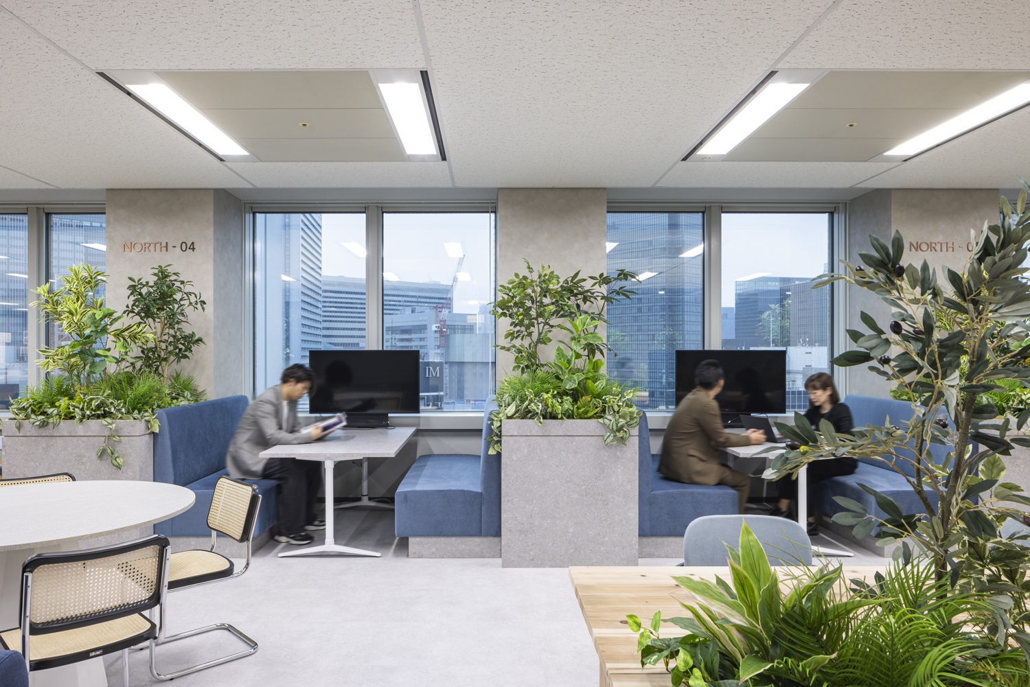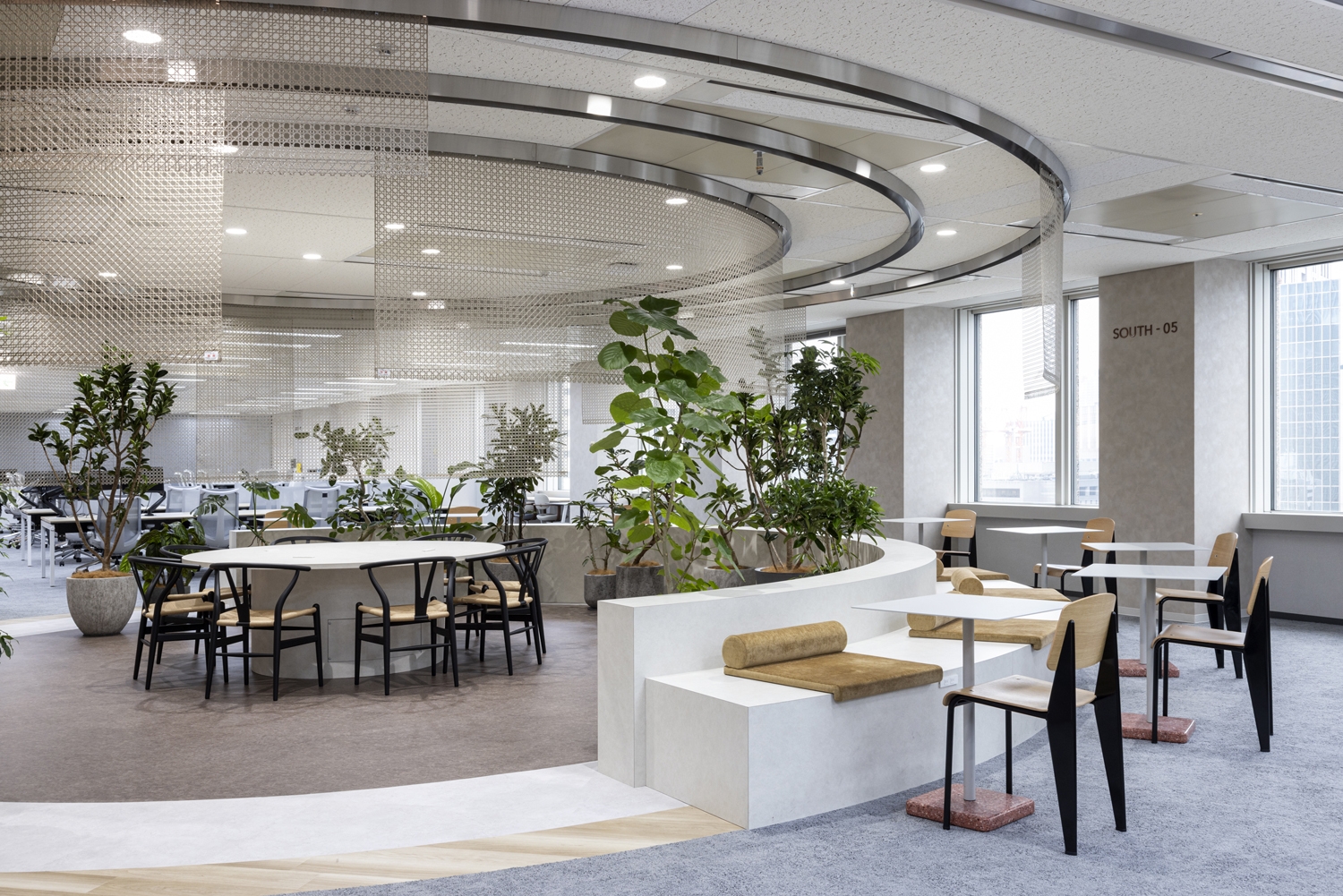 WORK DESIGN PLATFORMによる分析データをもとに、座席数、上長席、会議室、キャビネットの最適化を図り、多くのコミュニケーションスペースを確保しました。また、グループ会社間の間仕切りを撤廃し、全体を回遊できる設計とすることで、会社や個人間の垣根を超えた新しい偶発的な出会いやつながりが生まれ、エンゲージメントの向上に寄与しています。さらに、エントランス正面をガラスにすることで、空間の広がりを感じさせるとともに、働く人々が行き交う様子を来客者にも見せることで、企業の透明性をアピールしています。オープンエリアでは、グループ間の繋がりを演出するために円をモチーフにしたデザインを採用しました。また、パーティションや造作家具の仕上げには鉄の素材感を演出する素地を選び、統一感を持たせています。