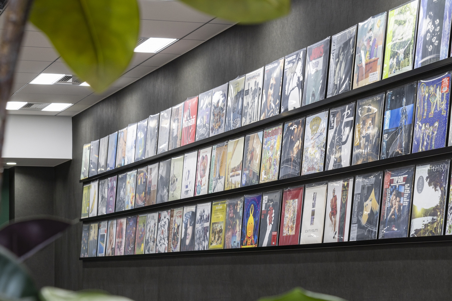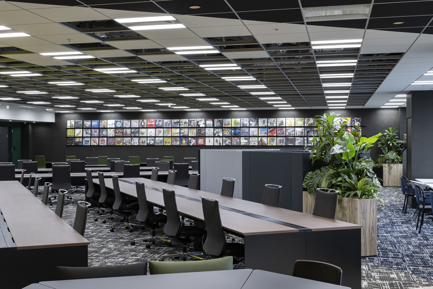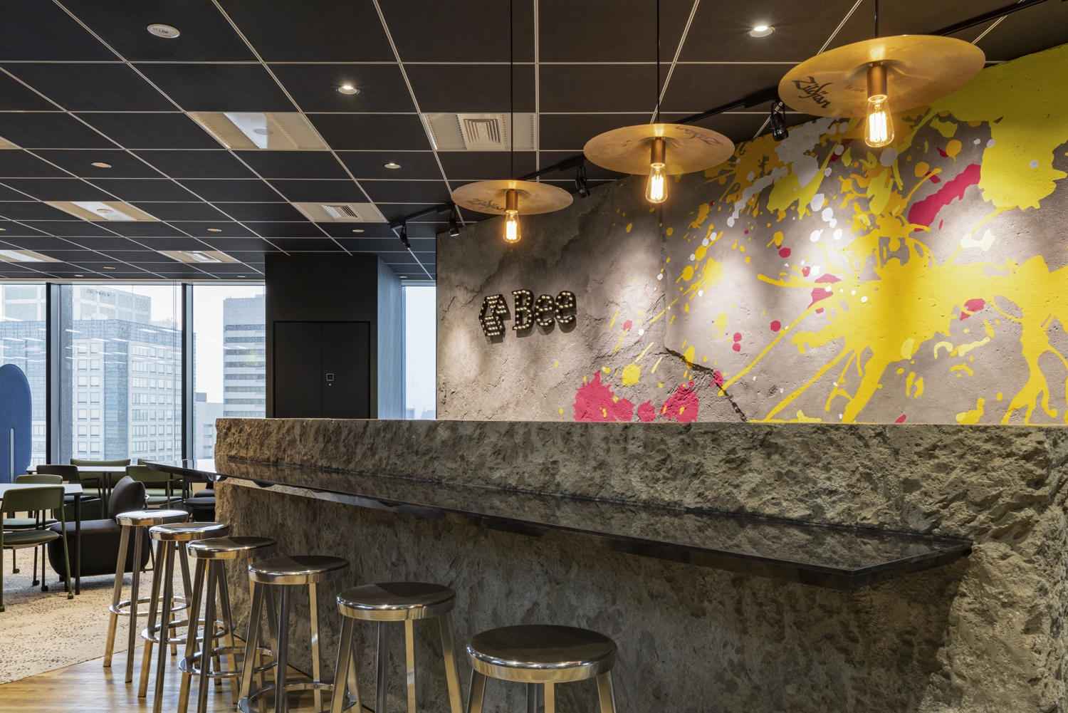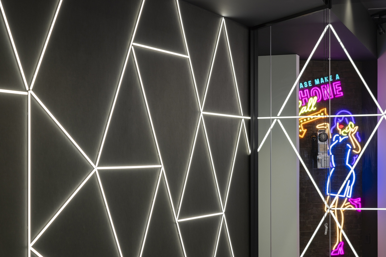 「平行を出来る限り無視した壁面構成」の要望のもと、歩みを進めるごとに見える景色が変わる唯一無二のレイアウトになっています。訪れて最初に目を引くネオンライトとアンティークの受付電話から始まり、壁面照明やグラフィックデザイン、照明スイッチ、レコード盤など他のオフィスではなかなか見ることができない遊び心を散りばめました。また、 ベースカラーの黒に対極するビビットカラーの壁面や岩壁など、簡単に予想できない質感をアクセントで使用することで発想の自由を感じられる空間をつくり、いるだけでアイデアが湧き出てるような環境になっています。