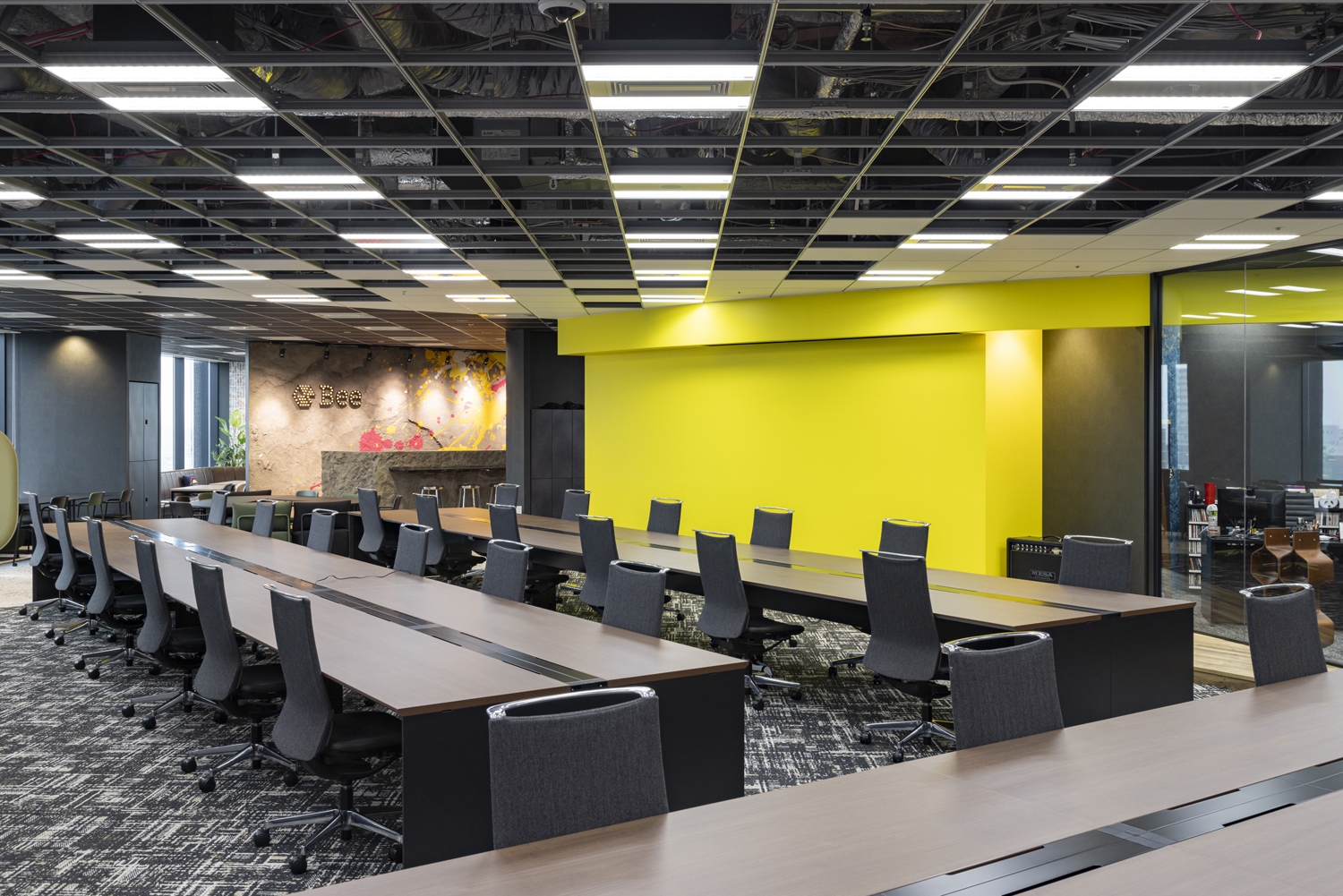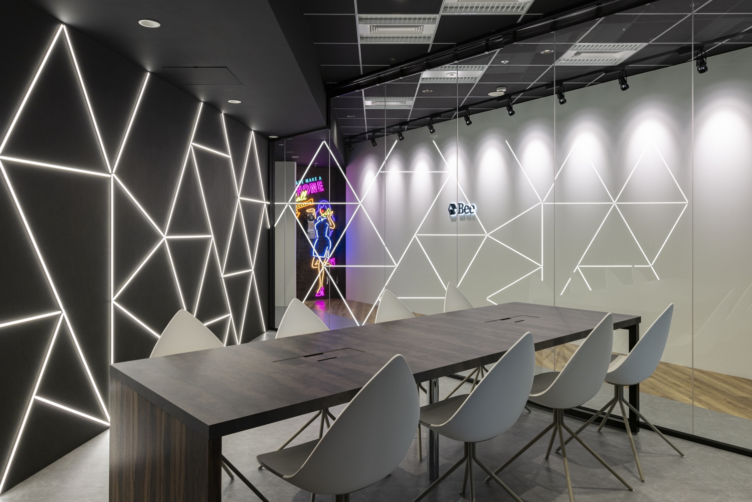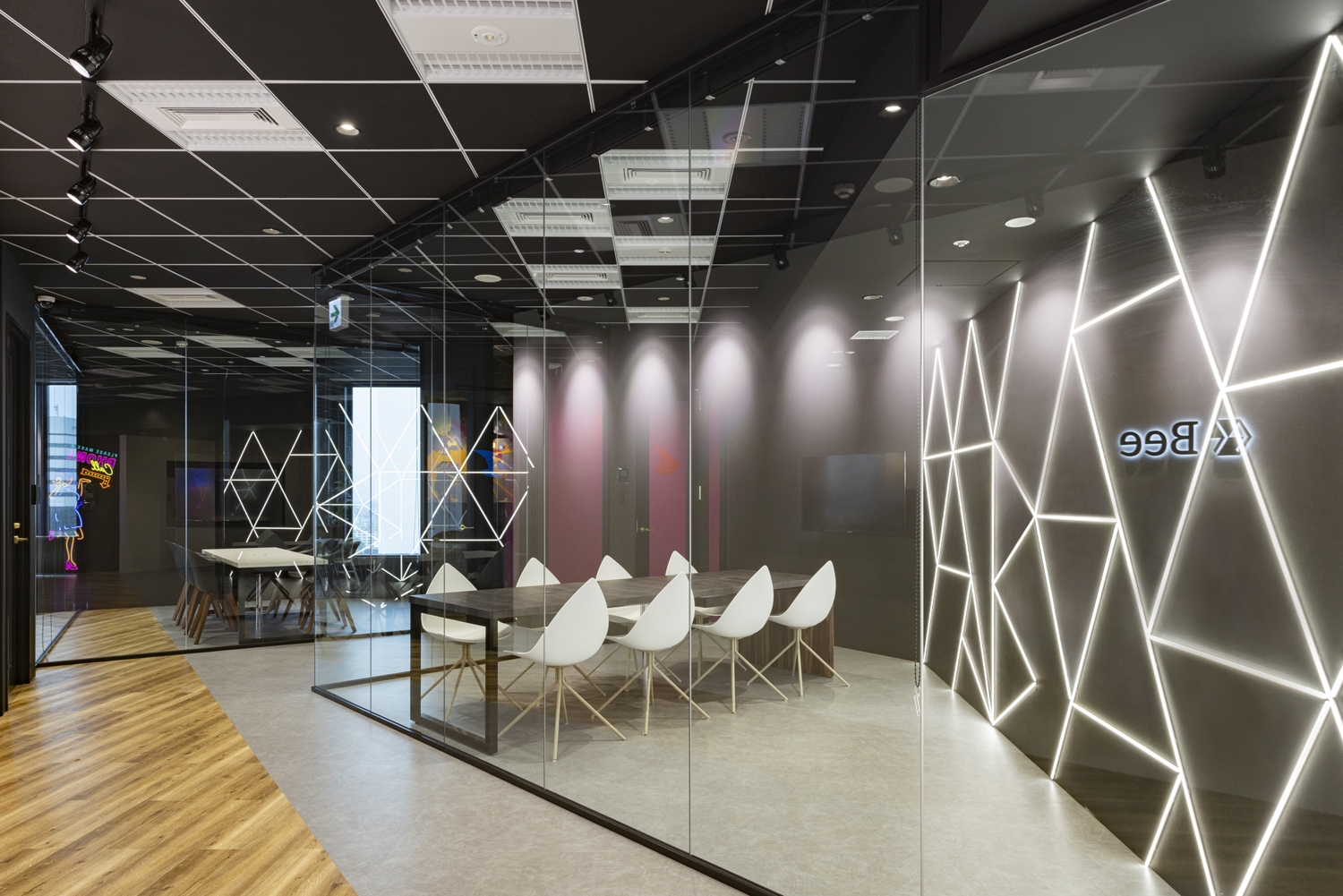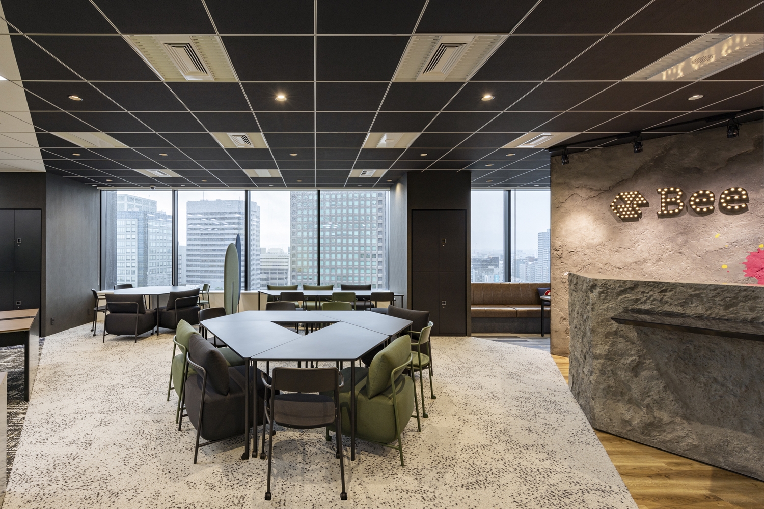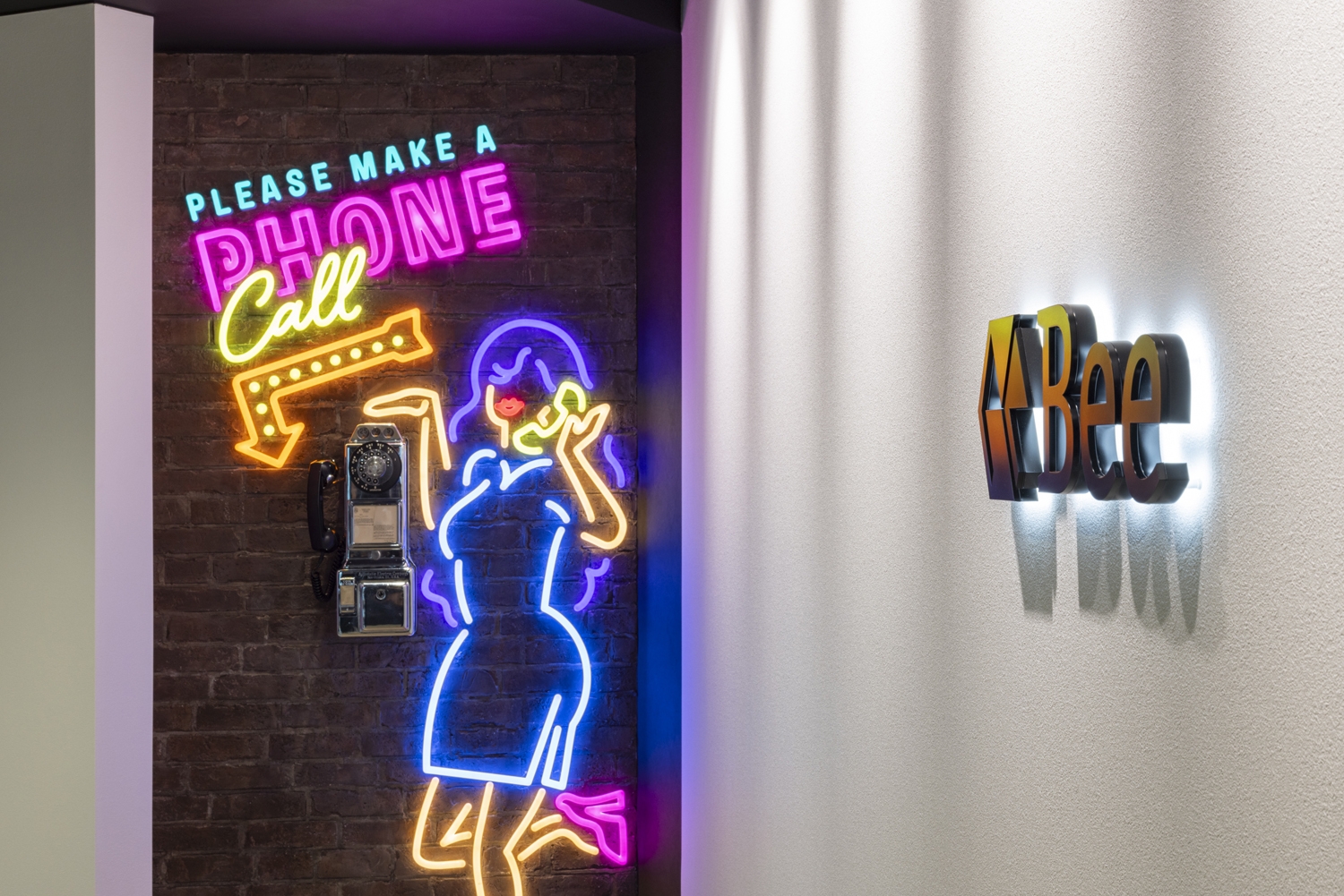 採用において人柄を重視し、服装自由やフレックスタイム制等、社員の自立性とクリエイティブ、フロンティア精神を重要視しているBee様。人員増加と採用強化に伴い移転を決定した今回のオフィスのリクエストは「平行を出来る限り無視した壁面構成」。視覚的な面白さを優先し、クリエイティブで自由な発想の後押しとなるようなオフィスの構築を目指しました。