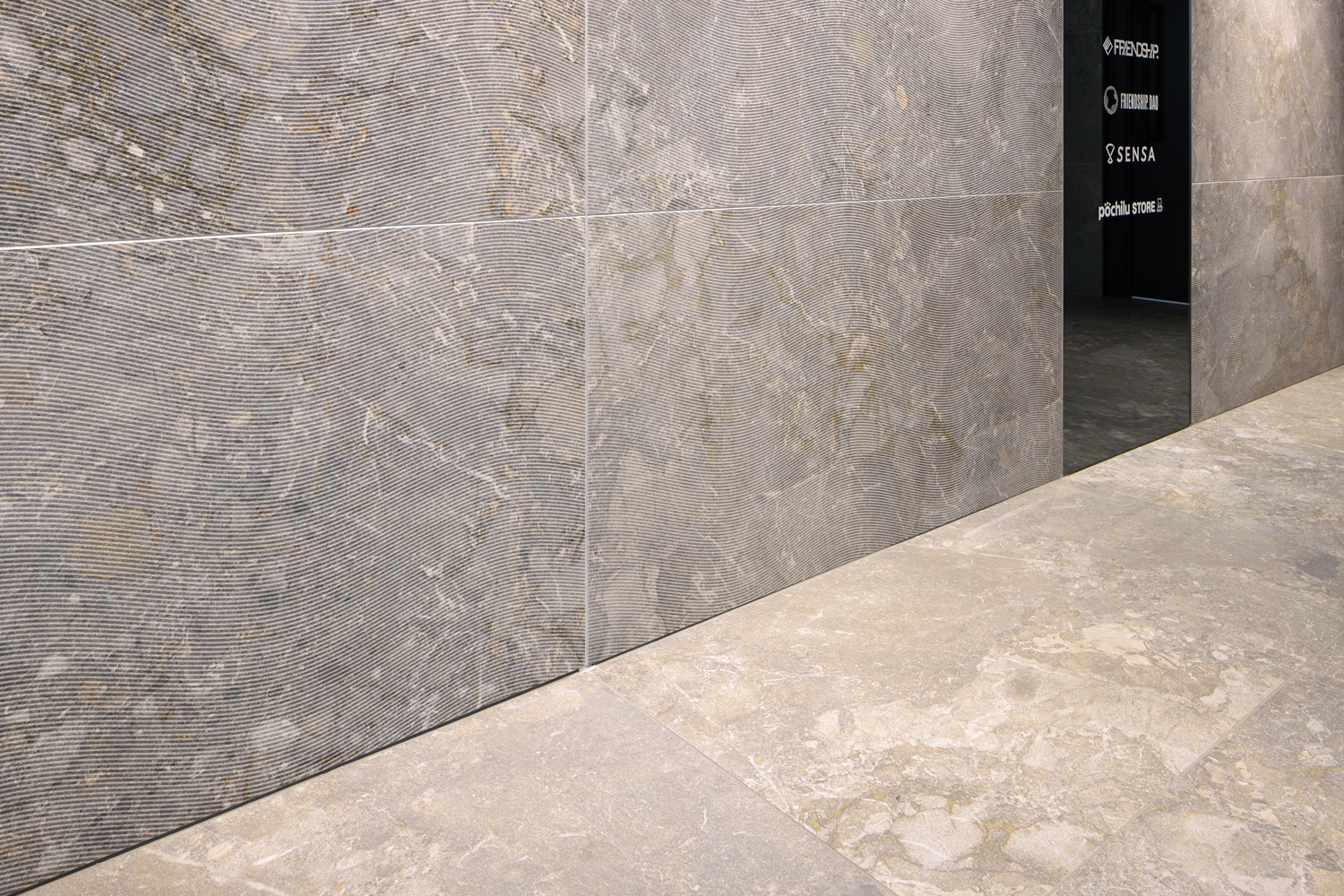 カウンターやソファ、柱にコーポレートカラーをアクセントで取り入れたほか、エントランスサインは発光式にし、シックな雰囲気のデザインのなかブランディングを際立たせています。