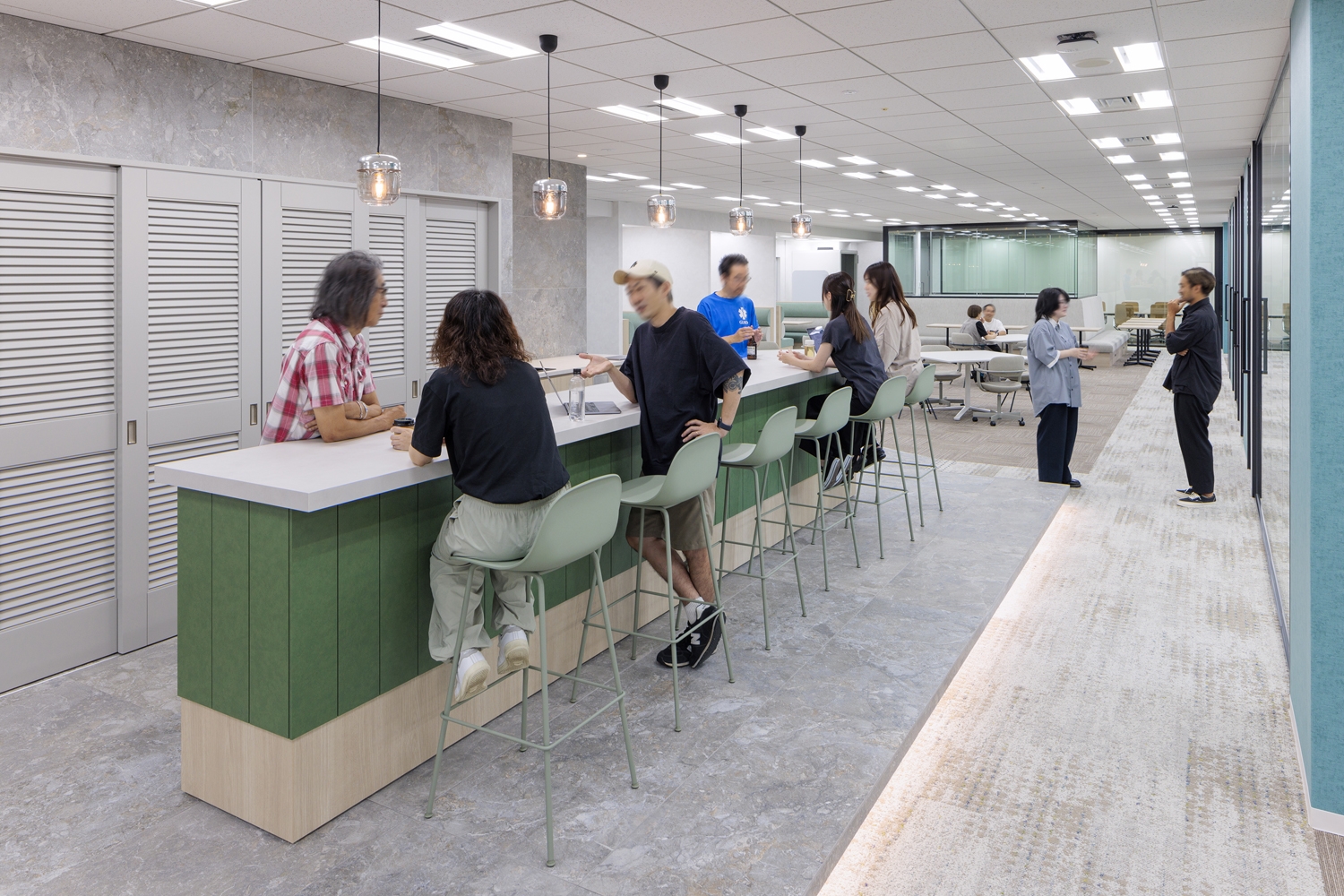 サカナクション等の人気アーティストが所属する音楽プロダクションのヒップランドミュージック様の移転プロジェクト。前回オフィスを設計させていただいてから働き方が大きく変わり、オフィスの改革が求められました。また、オフィスだけでなく音楽業界も日々変化しており、多様な価値観を持った社員やアーティストがそれぞれ力を発揮し、新しい挑戦をし続けられるようなワークプレイスの構築が必要でした。