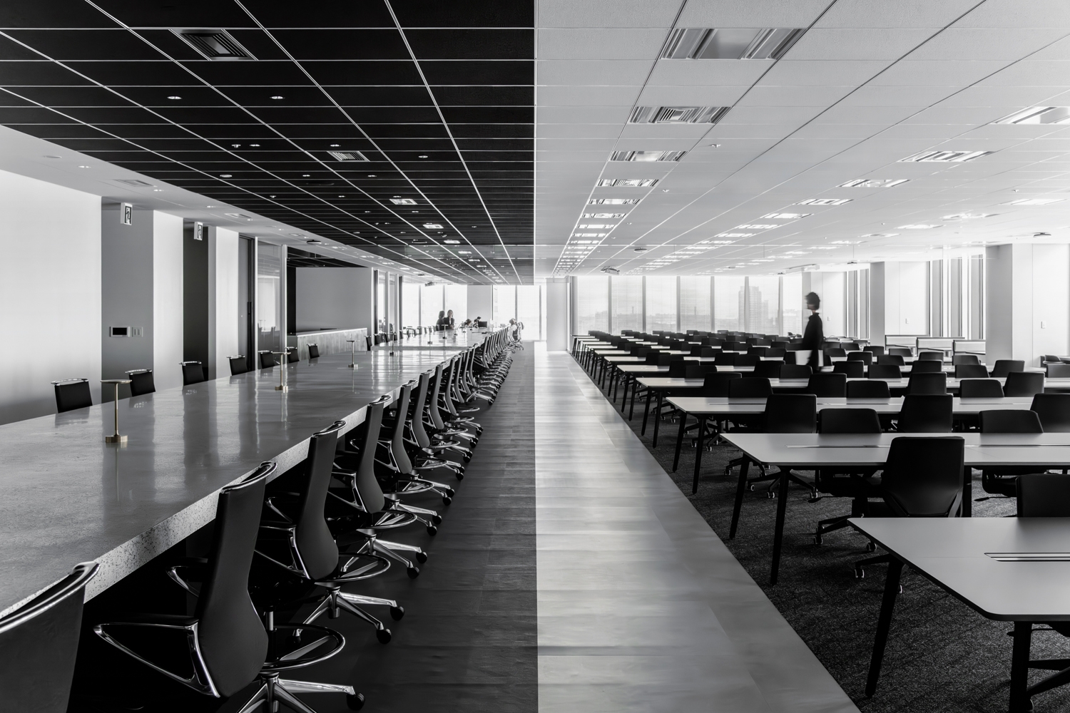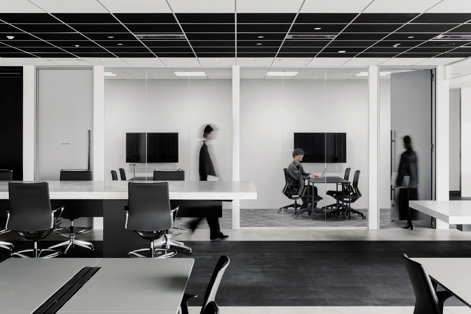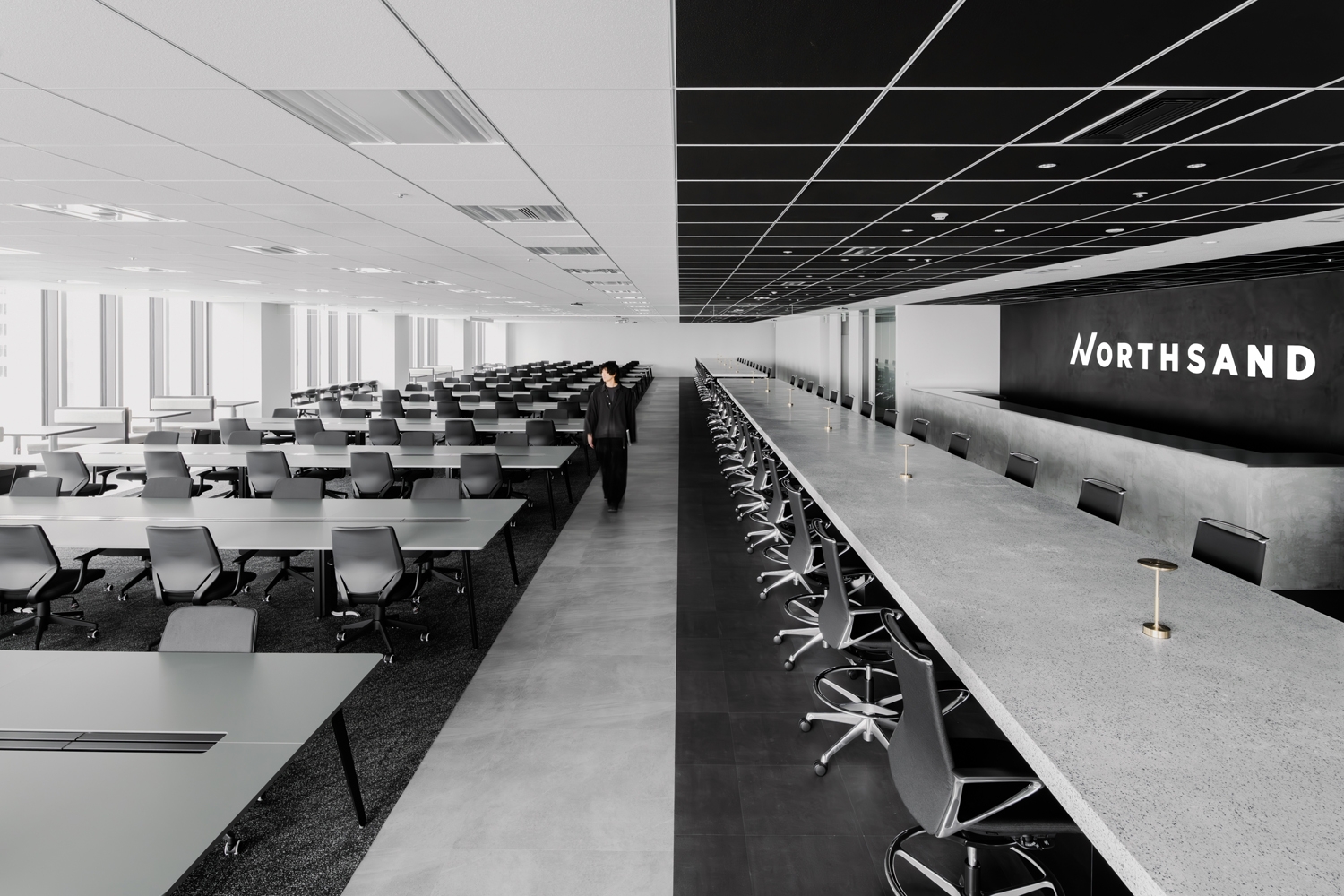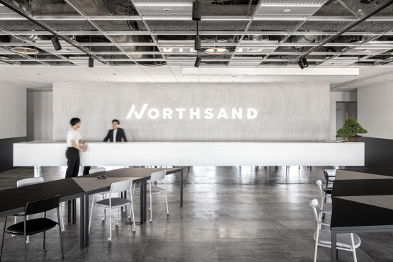 オフィスのコンセプトは、『RUNWAY』。 ランウェイを歩くモデルのように、社員一人ひとりが主役であることを自覚し、カッコいい会社を生み出すノースサンド様の一員である意識の浸透を目指しました。 人にスポットライトが当たるように、あえてレイアウトはシンプルに構成。使用するマテリアルもカラーの数を抑える事で、上質でスタイリッシュな印象の空間に仕上げました。中央には53mのロングテーブルを配置し、コンセプトであるランウェイを表現する事で単純なレイアウトの中でもインパクトがある空間に。その他にも会議室ごとにサインを変え、お客様の事業に合わせて素材を選定するなど、細かい工夫を施すことでブランディングの向上を図りました。