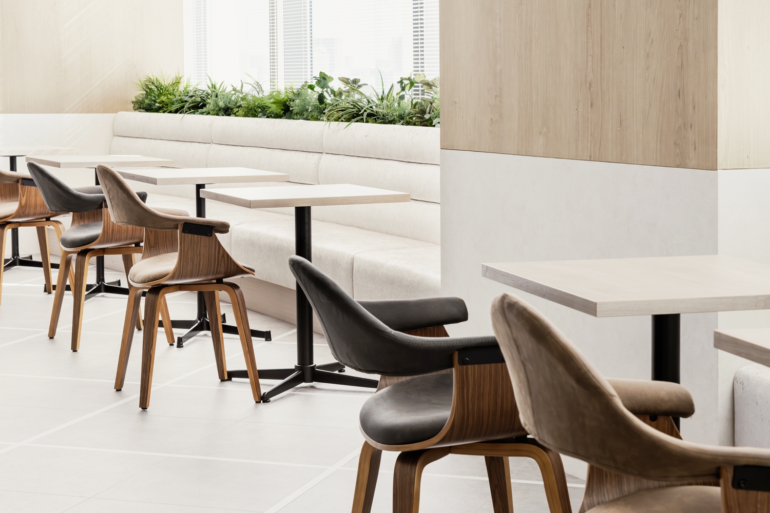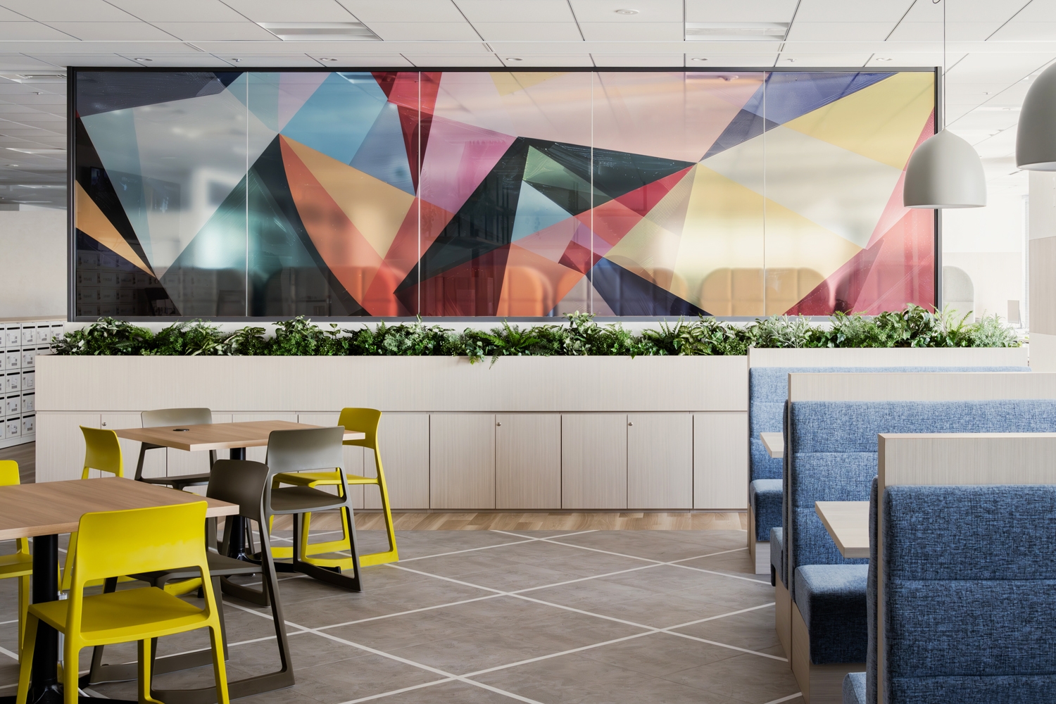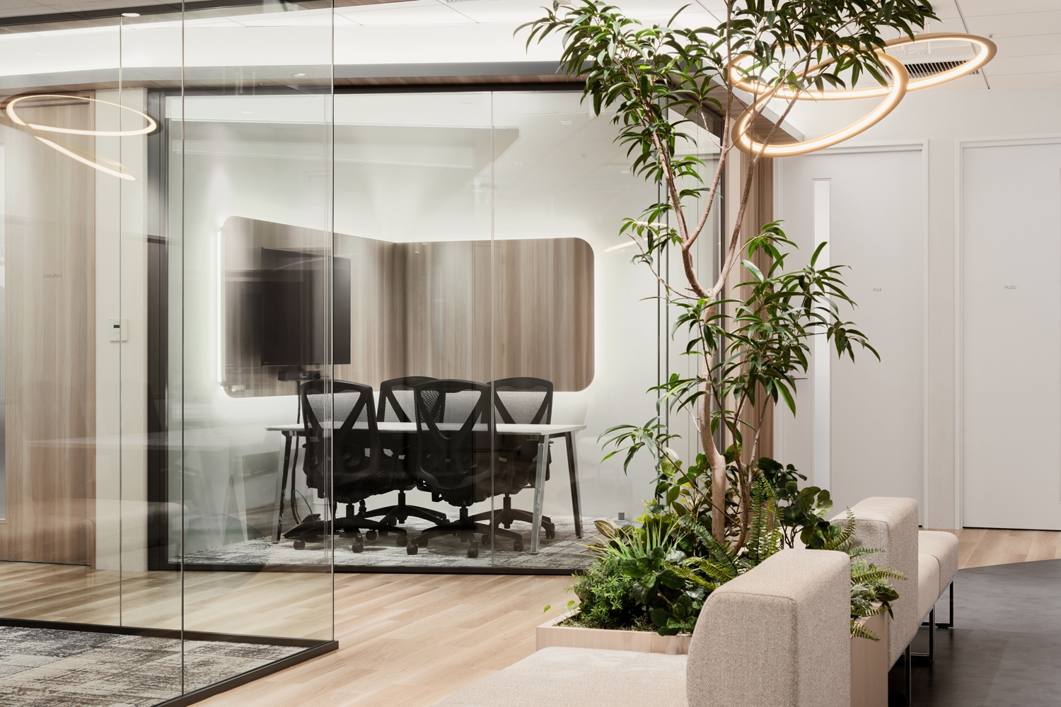 オフィスのテーマは『エンジニアのためのワークプレイス』。一人ひとりが集中できる快適なワークスペースの構築を軸にプランを進めました。視界の抜けるワークエリアの先に色彩豊かなグラフィックがシンボルになるように大きく配置し、出社人数が少ない日にも活気を感じられるよう工夫。また、高い集中力が必要な業務をサポートするために個人ブースを多めに配置しながらも、窮屈にならないよう動線ラインをしっかり確保しつつ、色調も極力コンパクトにまとめることで開放的でスッキリとした印象を与えました。エントランスは他拠点のデザインと連動した「明るく、木を基調とした温もりを感じられる印象」に加え、渋谷の新しいビルに移転するという点を加味し、先進性を感じるデザインの中に大人の落ち着きを感じるアクセントを加えました。