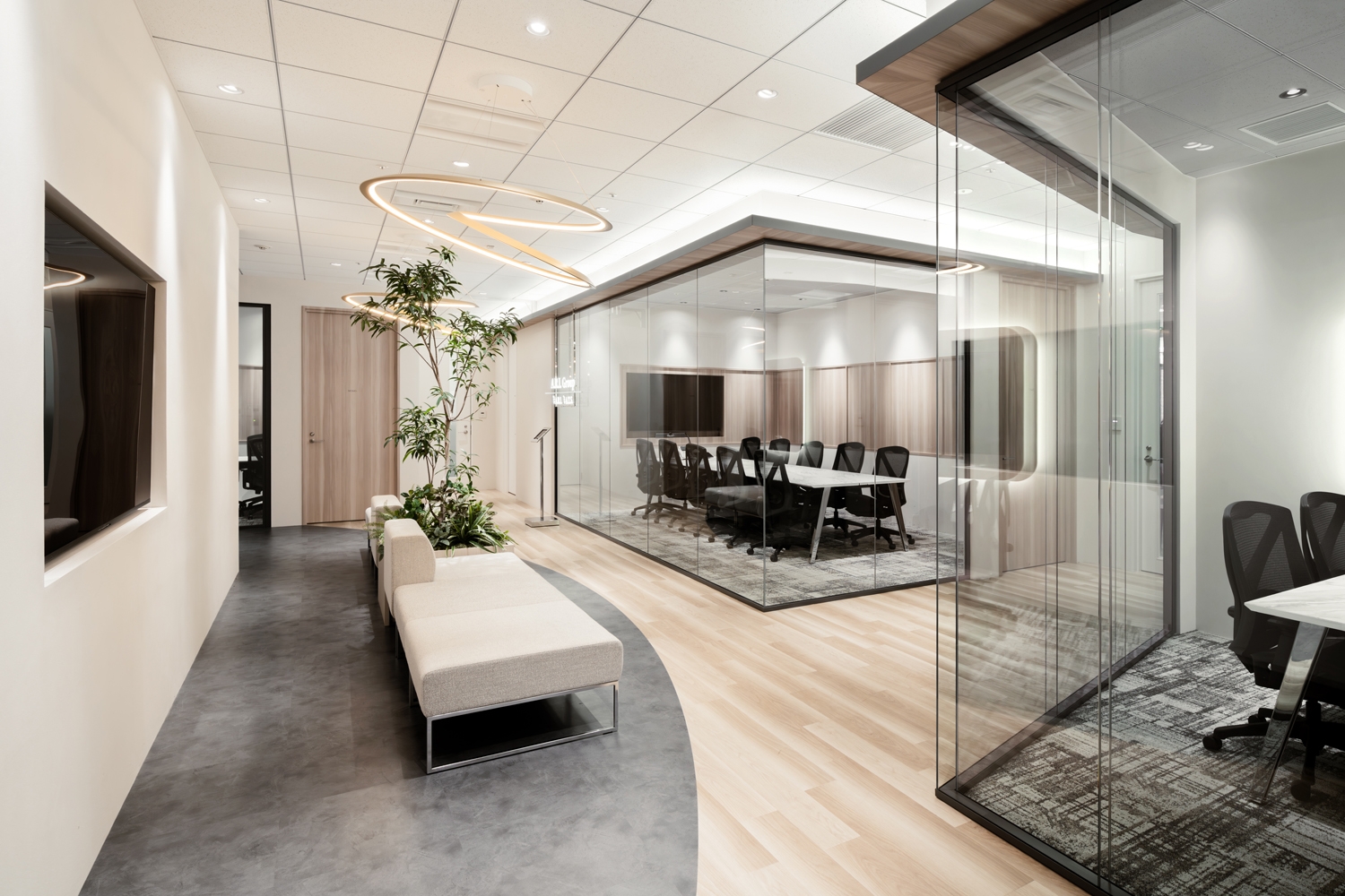 東京・名古屋・大阪に拠点を持ち、事業を拡大し続けるARアドバンストテクノロジ様。東京オフィスは元々2拠点に分かれており、深いコミュニケーションが取りにくいという課題を解決するため、1フロア集約移転計画が始まりました。出社人数が少ない日にも活気を感じるオフィスにしたいという要望と多様な働き方を選択できる今の時代に「オフィスに行くと集中できる」と思ってもらえるような空間構築を目指しました。