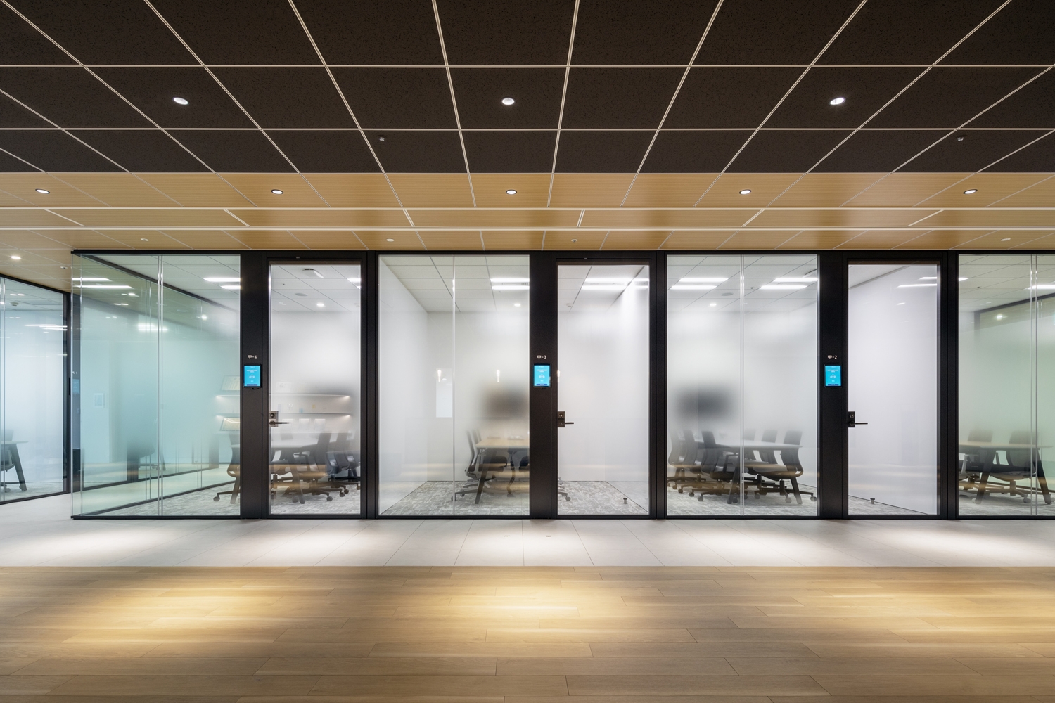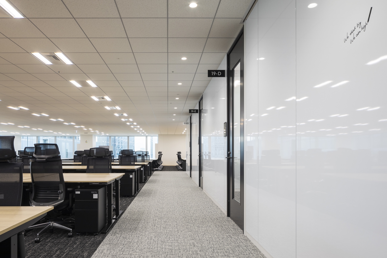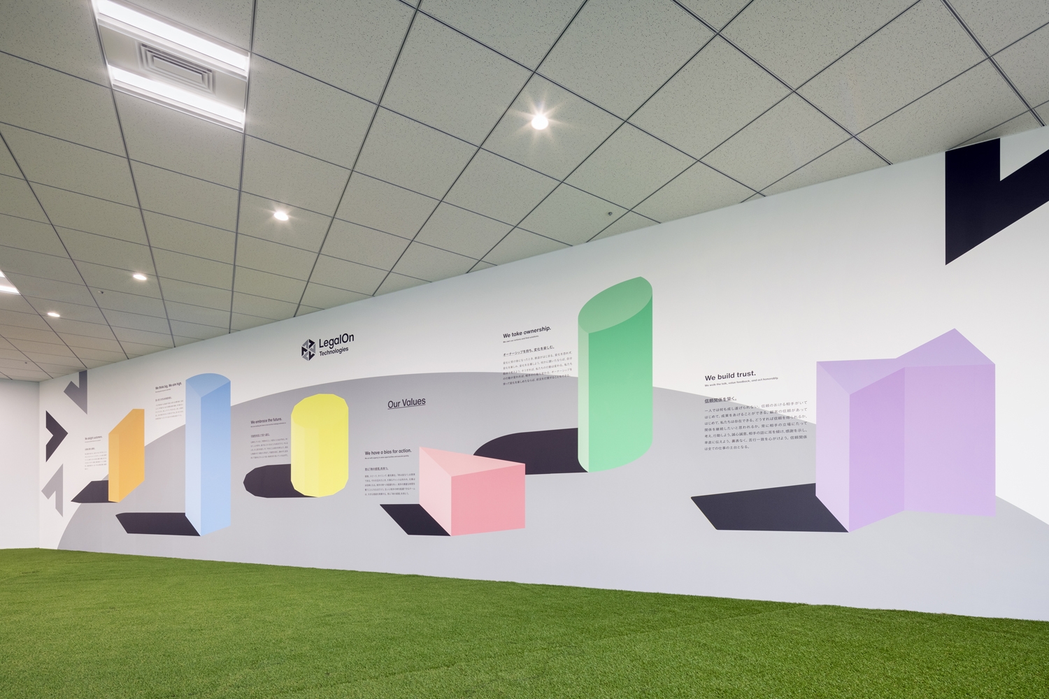新本社では働き方の構築から伴走し、それをもとに必要な要素をレイアウトに落とし込むことでプロジェクトの目的である部門を超えた交流を実現しました。働き方はリモートワークとオフィスワークを組み合わせるハイブリットワークを導入しつつ、オフィスワークならではのコミュニケーションを大切にし、全ての部署の社員が気軽に集まれるコミュニケーションスペースやアゴラ(広場)という人工芝のスペースを広く確保しました。デスクは効率を重視し島型にレイアウト。19~20階という眺望をいかして、窓際に集中ブースや一人掛けのソファ、パントリーカウンターなどをバランス良く配置し、多様な働き方の実現も目指しました。収容人数を多くし、社内外の方々を招いて多目的な使用ができる会議室(セミナールーム)の設置、オンラインMTGのための最適化された環境整備など、柔軟なオフィススタイルを構築することで業務効率及び、生産性の向上を図りました。デザインに関しては白基調の中に木目調、黒、シルバー、グレーなどコーポーレートカラーを取り入れ、落ち着いた印象に。エントランスの待合ベンチには企業ロゴを意識した六角形を採用するなど、企業らしさも取り入れております。また、来客会議室の名称には契約書において当事者を表す「甲・乙・丙」をエリアごとに分けて命名し、各会議室壁面には社内外の方々にさまざまな契約について知ってもらうために契約類型の説明文を掲示するなど、事業内容にちなんだ工夫も特徴的です。