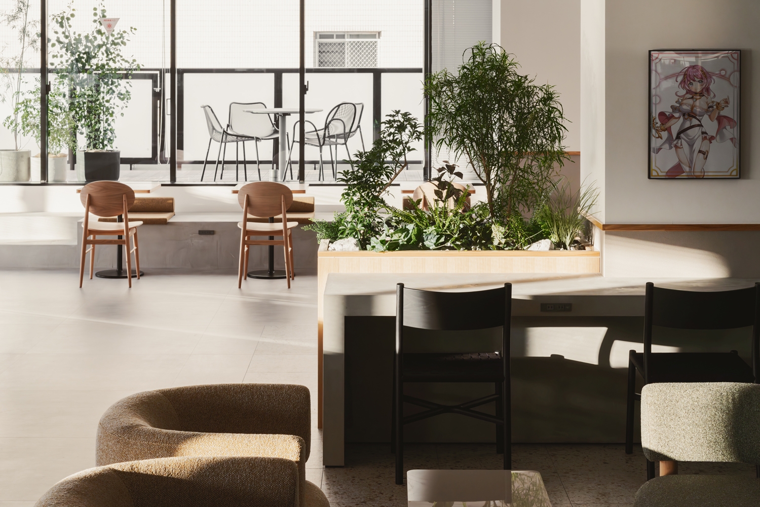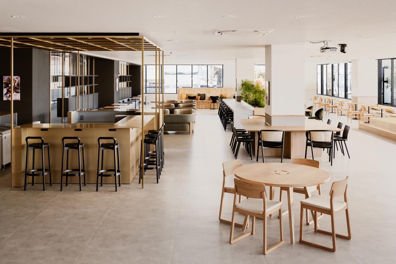 テクロス様が掲げる『世界に通用するKAWAIIを届ける』というビジョンをもとに『縁KAWA』というコンセプトで空間を設計。フリースペースと執務室を縁側のようなソファ席で繋ぎつつ、各所にテクロス様が考える「KAWAII」要素を散りばめました。開発業務であるため、基本の働き方は固定席での運用にし仕切りを設置することでパーソナルスペースは確保しつつ、昇降テーブルやファミレス席を導入し、気分転換ができる工夫を施しています。窓際に打合せスペースを確保することで必要なメンバーがすぐに集まって打合せができるようにしたり、社員一同が集まることができるフリースペースを設けることで、会社規模で開催されるイベントや勉強会でも活用できるようにしています。デザインに関しては、シンプルかつ上質な空間の中にエントランスの枯山水、フリースペース内のマテリアル素材(畳、ラタン)など、オフィス所在地である京都らしい和の要素を取り入れました。会議室には京都の地名を採用し、エンターテイメントの会社らしいアイコニックで遊び心のあるデザインに。また、テラスがある物件のため、屋外家具とグリーンを設置しリフレッシュできるスペースもつくっています。
