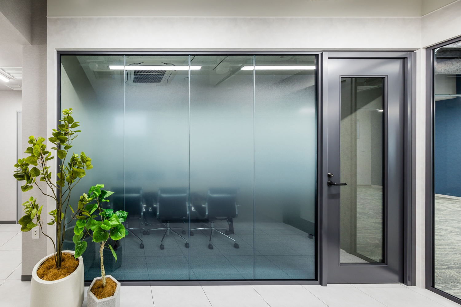 躯体の形を活かしながらエントランスはコンパクトにまとめ、ワークスペースを広く確保することで開放感のある印象を目指しました。コンセプトである『first period.』は、入居したお客様が25坪の空間をきっかけに新たな第一歩を踏みだせるよう「拠点」という意味が込められています。採光がとれる窓を大きく確保したエリアには、カフェのように使えるリフレッシュスペースを配置しました。6階、8階に関してはハーフセットアップオフィスになっているため、入居者の好みによって家具やレイアウト変更ができ、選択肢が広がる仕様となっています。デザインは既存の素材を活かしつつナチュラルで柔らかい色味のマテリアル、植栽を各所に取り入れることで親しみやすく心地よい空間に仕上げました。また、さまざまな事業の企業様に活用イメージを持ってもらえるよう各階のデザインパターンを変えることで、企業イメージによって空間を選択できるような工夫も行っています。