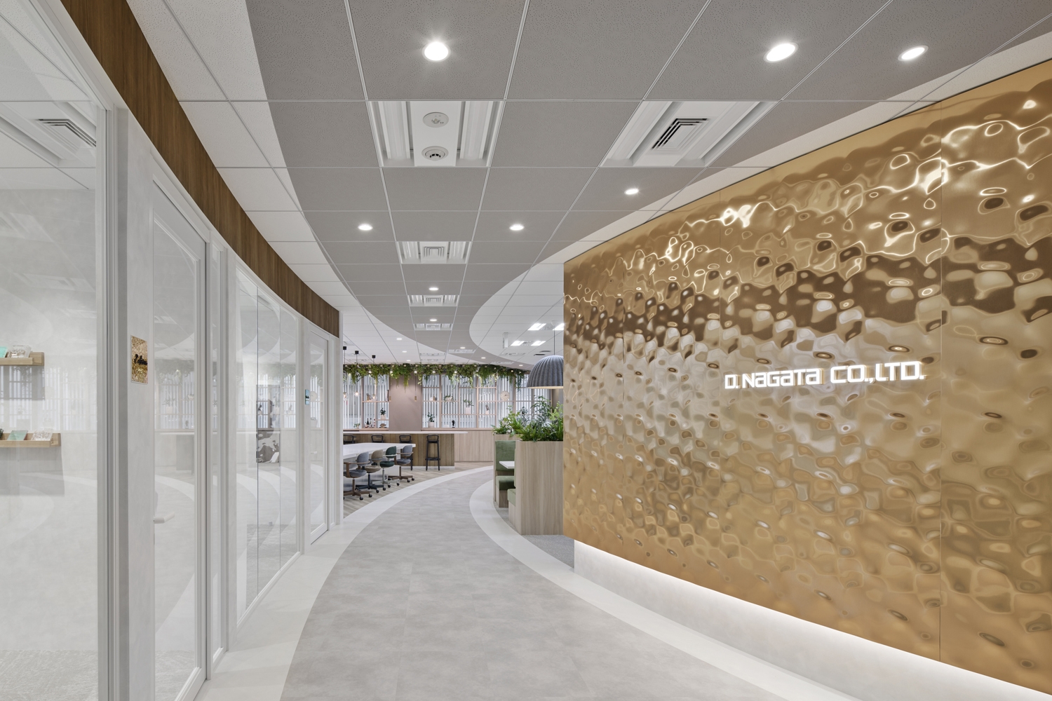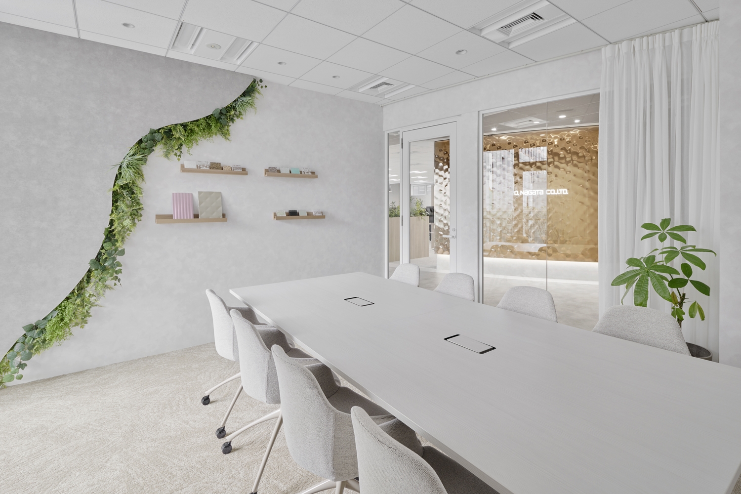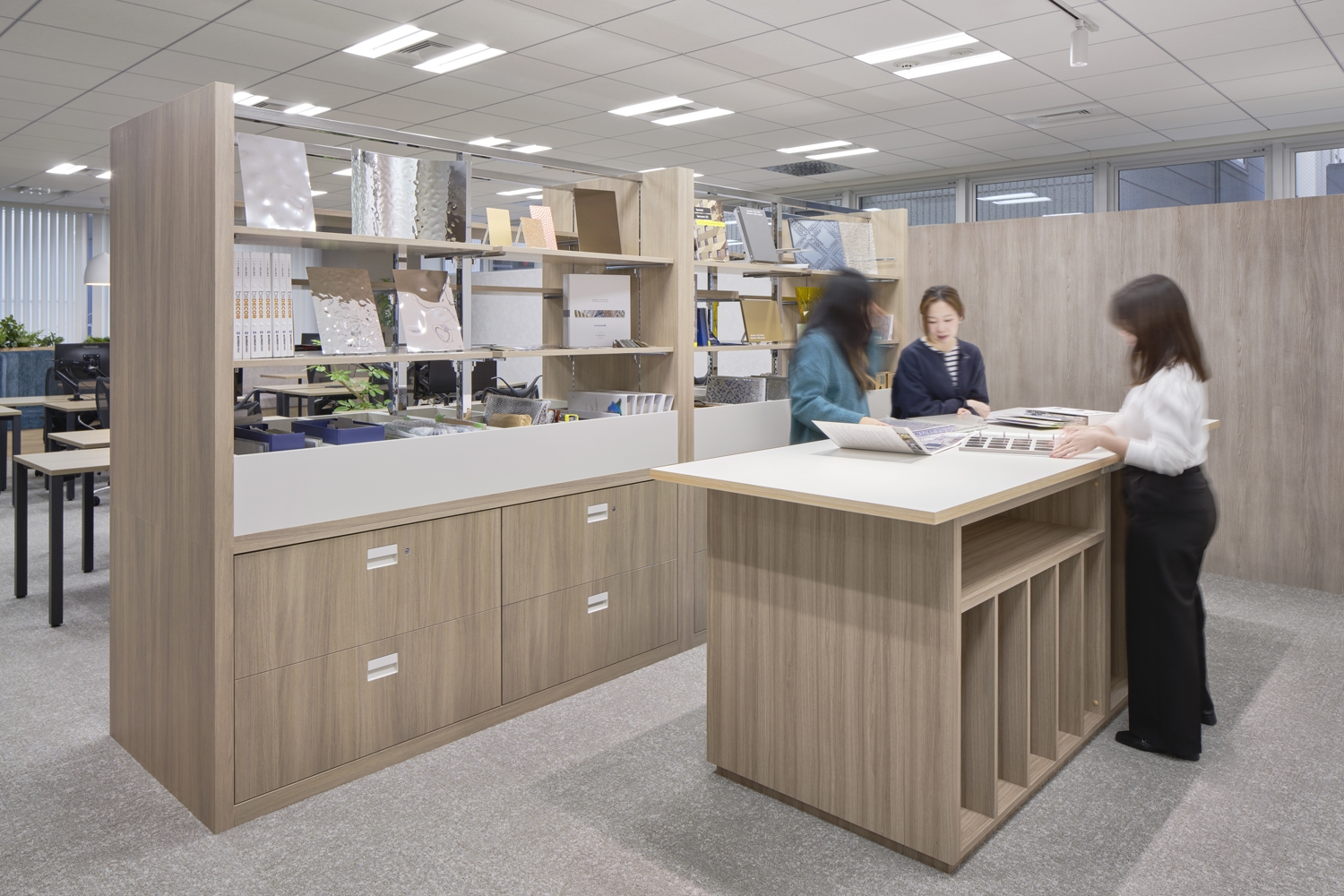 コンセプトは『CROSS CONNECT』。さまざまな場と企業と人が交わりつながる、心地よい調和を生むオフィスを目指しました。今回の移転の目的でもある執務エリアとショールーム機能の融合はもちろん、訪れた人に新たなイメージを持ってもらえるようなブランディングの側面でも効果をもたらす空間作りを目指しました。 特にエントランスにはインパクトのある大きなアルミパネルを使用し、素材を選ぶエリアだけでなくオフィス全体がショールームとして機能するような工夫を施しています。デザインは優しい色味のマテリアルを中心にコーディネートし、明るいウッド素材を取り入れることで柔らかいイメージの空間に。ところどころにグリーンを取り入れることでリラックス効果も期待できます。リフレッシュスペースにはカウンターやビックテーブルを設置し、作業も休憩もできる空間として、コミュニケーションを誘発できる空間になっています。