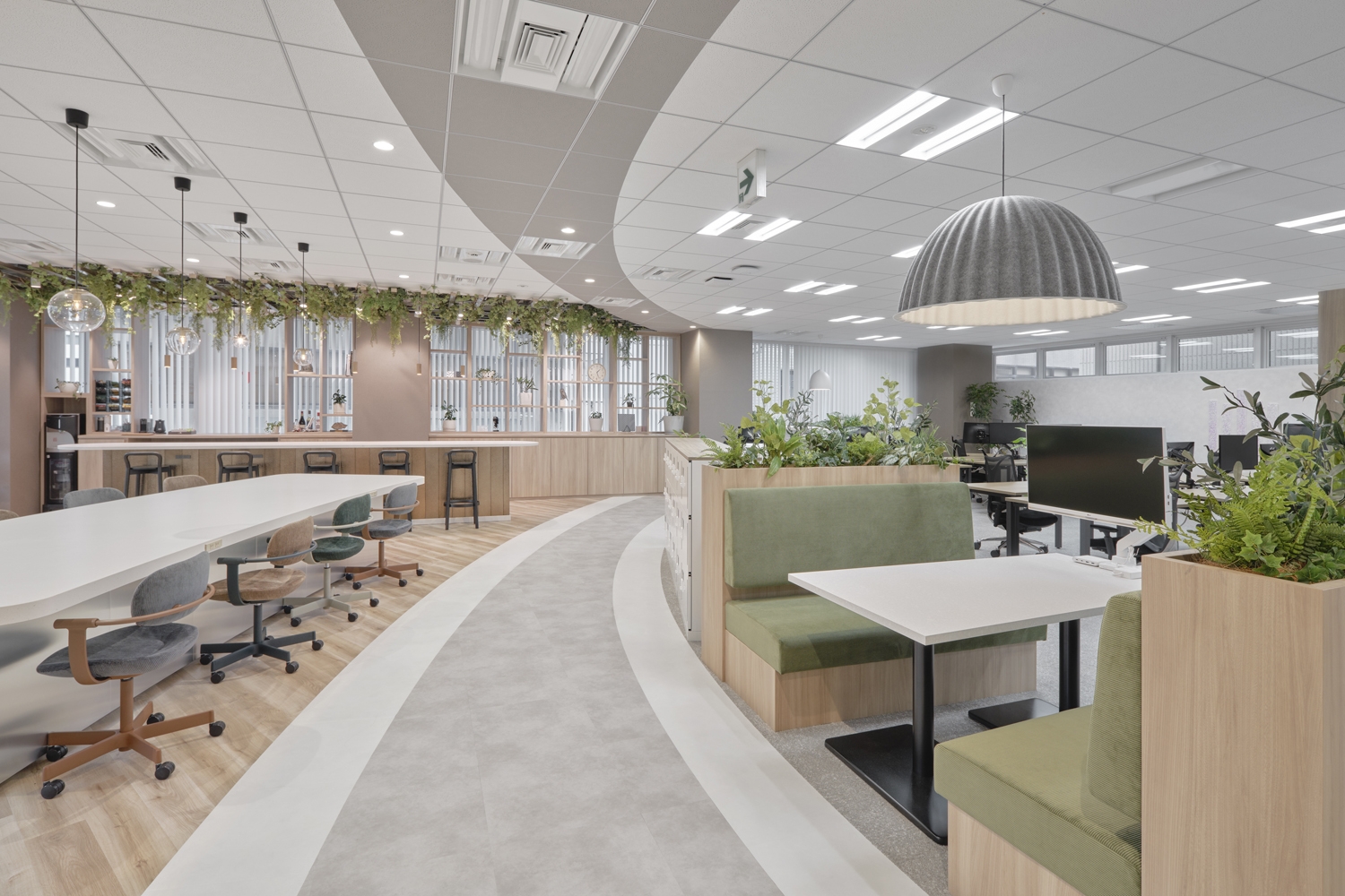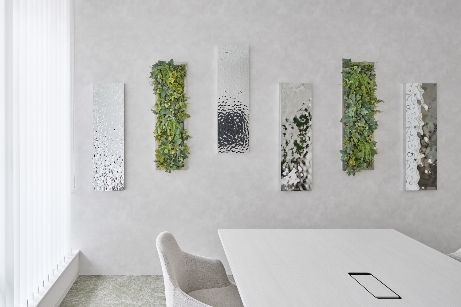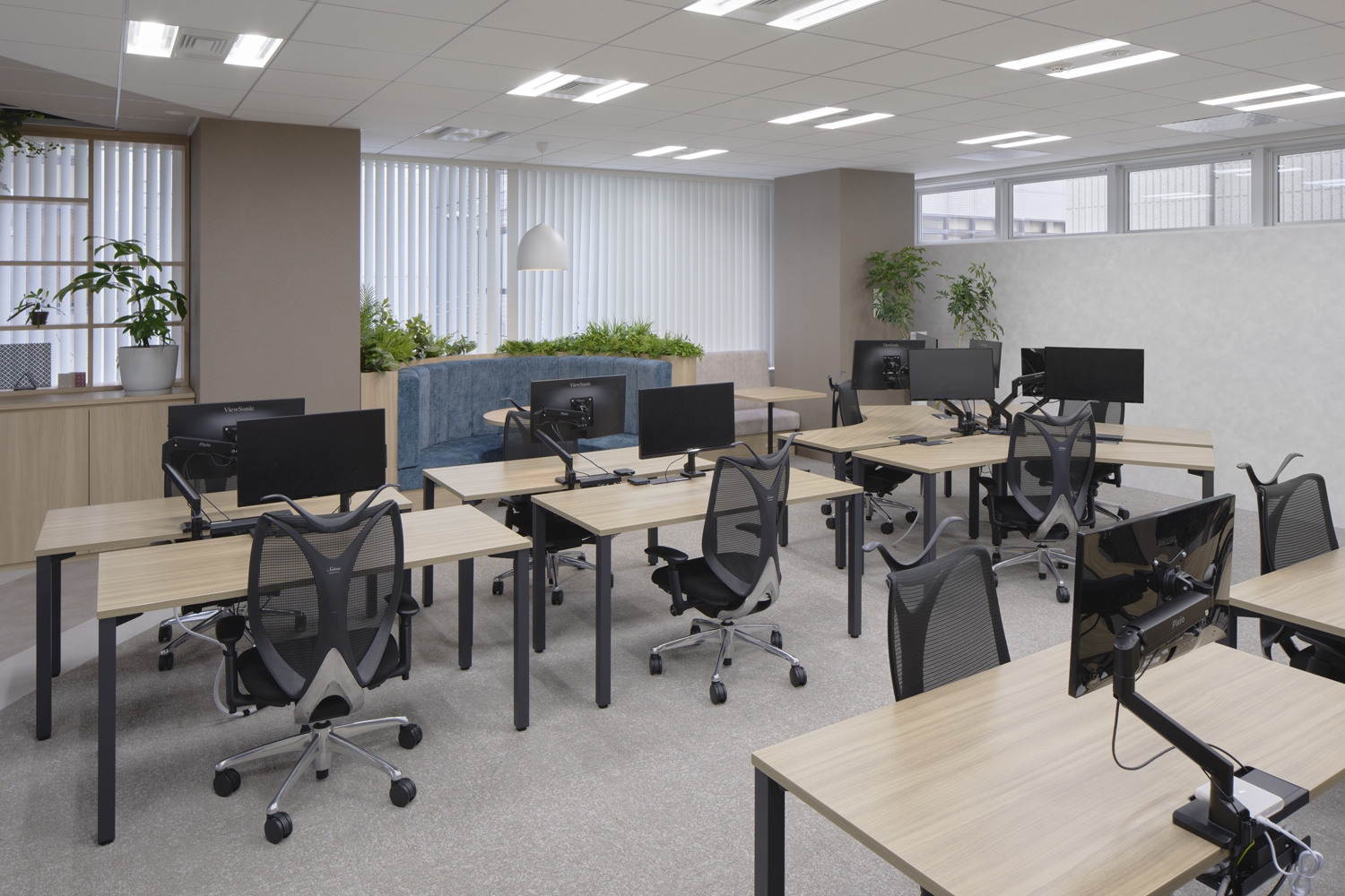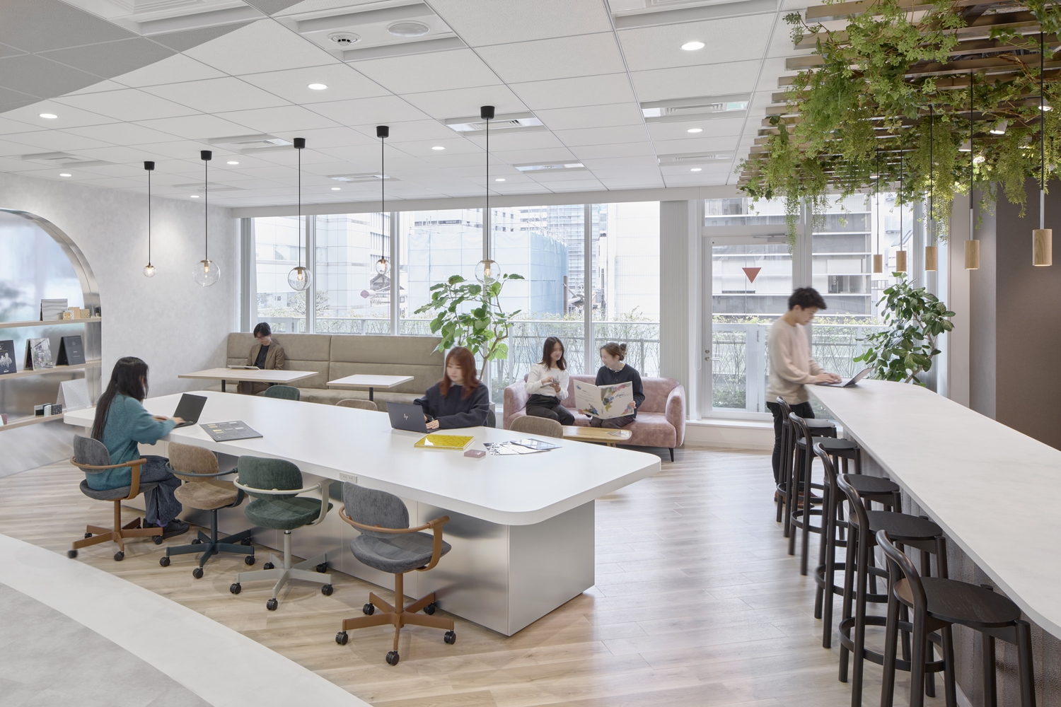 コンセプトは『CROSS CONNECT』。さまざまな場と企業と人が交わりつながる、心地よい調和を生むオフィスを目指しました。今回の移転の目的でもある執務エリアとショールーム機能の融合はもちろん、訪れた人に新たなイメージを持ってもらえるようなブランディングの側面でも効果をもたらす空間作りを目指しました。 特にエントランスにはインパクトのある大きなアルミパネルを使用し、素材を選ぶエリアだけでなくオフィス全体がショールームとして機能するような工夫を施しています。デザインは優しい色味のマテリアルを中心にコーディネートし、明るいウッド素材を取り入れることで柔らかいイメージの空間に。ところどころにグリーンを取り入れることでリラックス効果も期待できます。リフレッシュスペースにはカウンターやビックテーブルを設置し、作業も休憩もできる空間として、コミュニケーションを誘発できる空間になっています。