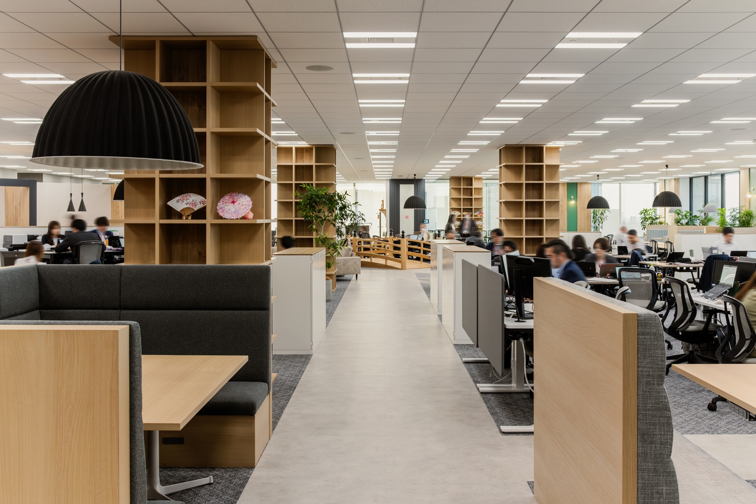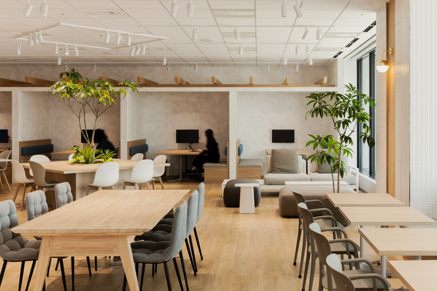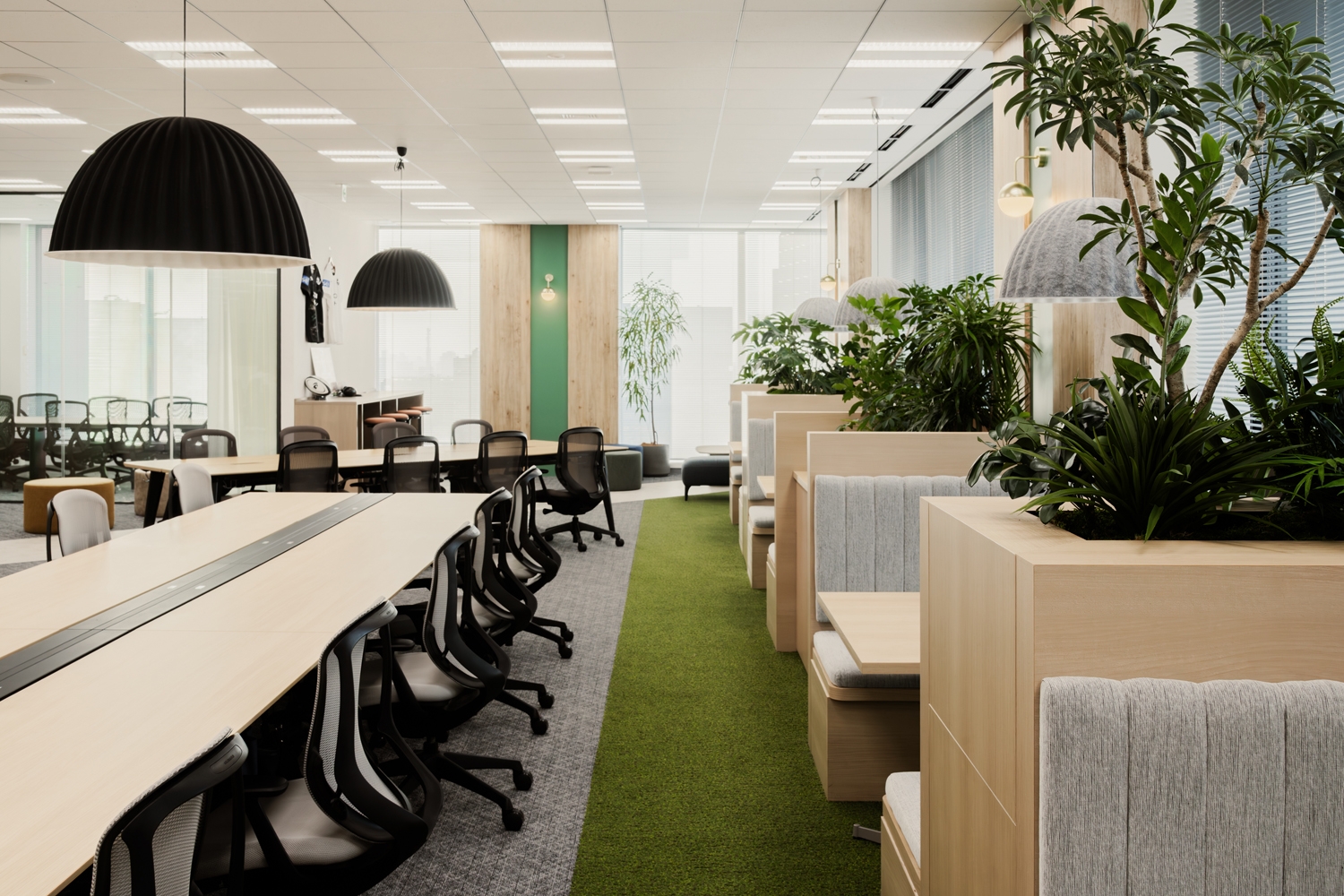 リコージャパン様が使命と目指す姿として掲げる「"はたらく"に歓びを」を体現するためのコンセプト『CORE PARK × TOKYO』をもとにオフィス空間を構築。日本橋オフィスという場所に多くの人々が集まることでさまざまな出会いやつながりが生まれ、この場所が中心となってはたらく歓びを共に考え、創り出す場所になることを目指しました。これまで部署によって別々のフロアに入居していた運用を見直し1フロアに集約することで、より人と人とのつながりを感じられる空間に。さらに、ワークスペースの間にできた空間にコミュニケーションスペースを点在させることで、偶発的な会話が生みだされるレイアウトを組みました。また、リコージャパン様からの”日本橋を感じられる空間にしたい”という要望から、ワークスペースは日本橋エリアのマップを反映したゾーン分けに。その中心には、造作の「橋」を設置し、空間全体を見渡せるように工夫しました。日本橋という歴史のある建造物が多く、日本らしさを感じられる土地であるものの、あえて和の要素だけで固めるのではなく木や緑のあたたかみを感じるナチュラルで快適な空間をデザインしました。その他にも、スタンディング席や半個室ブース、ファミレスブースなどさまざまな要素を設置することで、シーンによって多様な働き方が選択できるように設計しています。