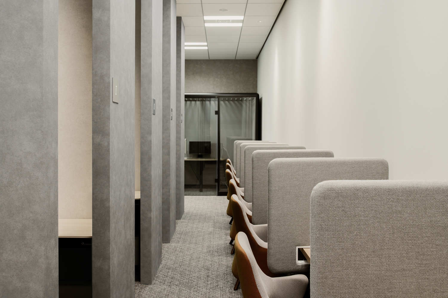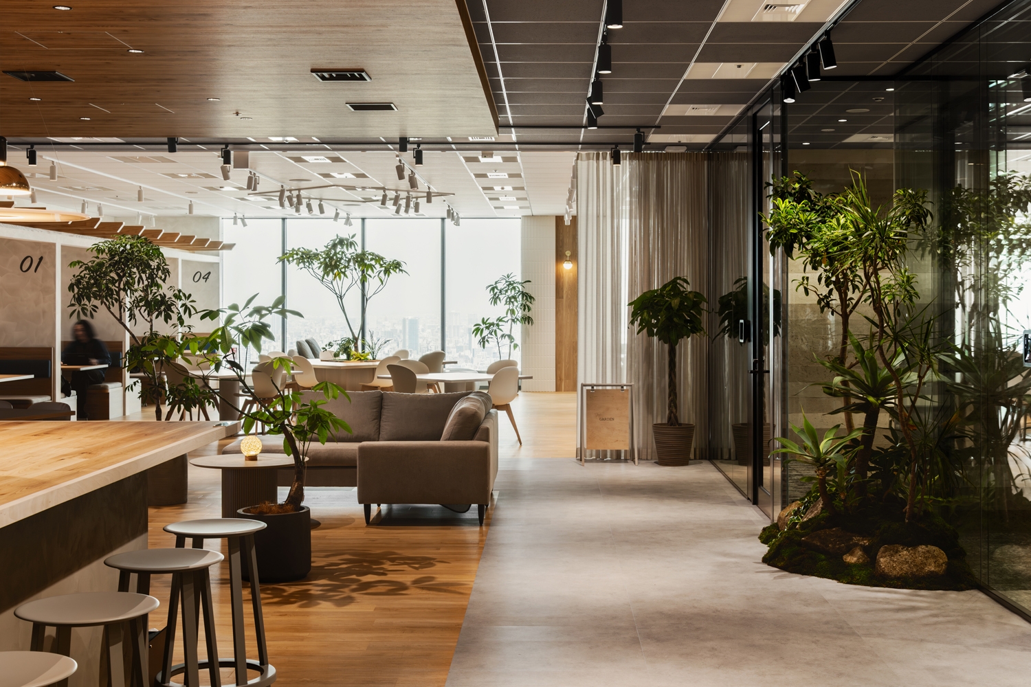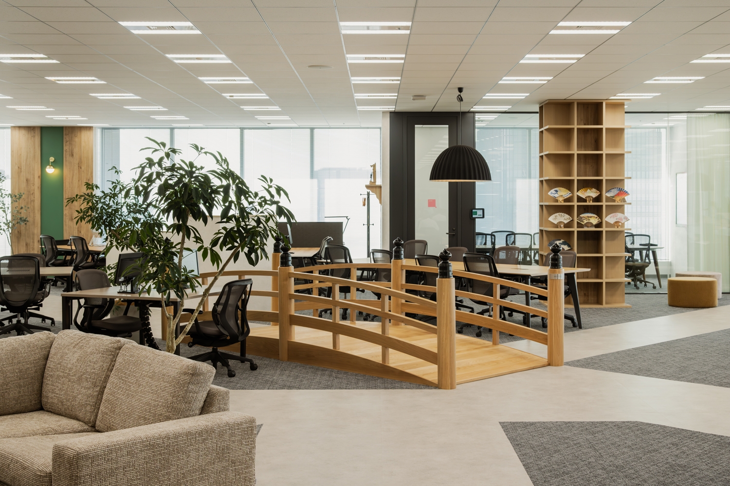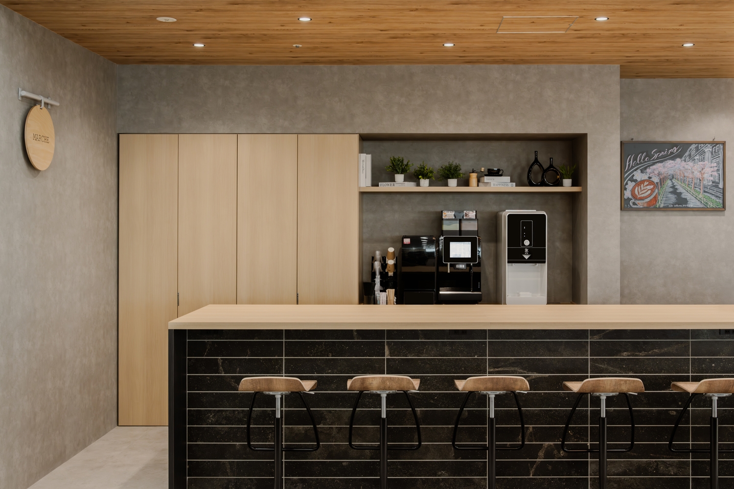 リコージャパン様が使命と目指す姿として掲げる「"はたらく"に歓びを」を体現するためのコンセプト『CORE PARK × TOKYO』をもとにオフィス空間を構築。日本橋オフィスという場所に多くの人々が集まることでさまざまな出会いやつながりが生まれ、この場所が中心となってはたらく歓びを共に考え、創り出す場所になることを目指しました。これまで部署によって別々のフロアに入居していた運用を見直し1フロアに集約することで、より人と人とのつながりを感じられる空間に。さらに、ワークスペースの間にできた空間にコミュニケーションスペースを点在させることで、偶発的な会話が生みだされるレイアウトを組みました。また、リコージャパン様からの”日本橋を感じられる空間にしたい”という要望から、ワークスペースは日本橋エリアのマップを反映したゾーン分けに。その中心には、造作の「橋」を設置し、空間全体を見渡せるように工夫しました。日本橋という歴史のある建造物が多く、日本らしさを感じられる土地であるものの、あえて和の要素だけで固めるのではなく木や緑のあたたかみを感じるナチュラルで快適な空間をデザインしました。その他にも、スタンディング席や半個室ブース、ファミレスブースなどさまざまな要素を設置することで、シーンによって多様な働き方が選択できるように設計しています。